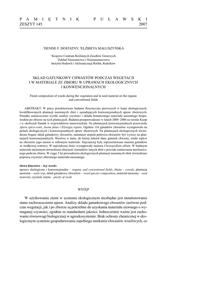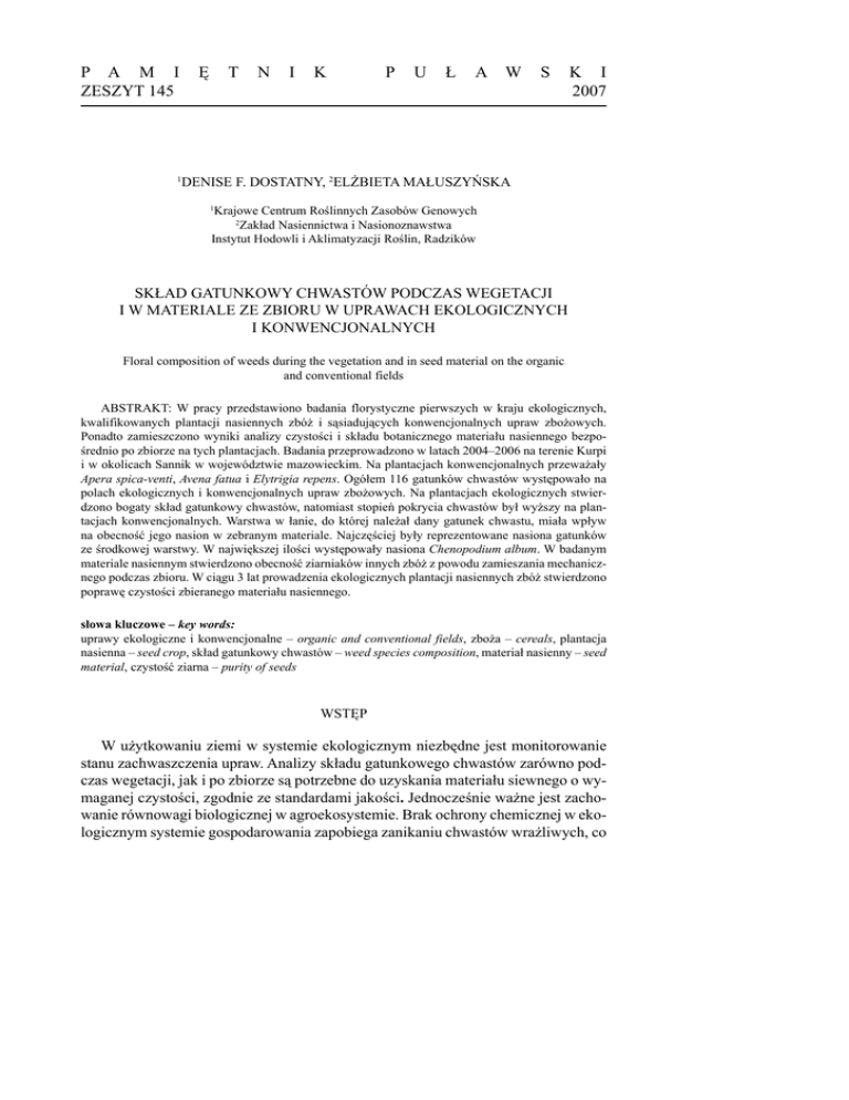 P A M I ZESZYT 145 Ę T N I K P U Ł A W S K I 2007 1 DENISE F. DOSTATNY, 2ELŻBIETA MAŁUSZYŃSKA 1 Krajowe Centrum Roślinnych Zasobów Genowych 2 Zakład Nasiennictwa i Nasionoznawstwa Instytut Hodowli i Aklimatyzacji Roślin, Radzików SKŁAD GATUNKOWY CHWASTÓW PODCZAS WEGETACJI I W MATERIALE ZE ZBIORU W UPRAWACH EKOLOGICZNYCH I KONWENCJONALNYCH Floral composition of weeds during the vegetation and in seed material on the organic and conventional fields ABSTRAKT: W pracy przedstawiono badania florystyczne pierwszych w kraju ekologicznych, kwalifikowanych plantacji nasiennych zbóż i sąsiadujących konwencjonalnych upraw zbożowych. Ponadto zamieszczono wyniki analizy czystości i składu botanicznego materiału nasiennego bezpośrednio po zbiorze na tych plantacjach. Badania przeprowadzono w latach 2004–2006 na terenie Kurpi i w okolicach Sannik w województwie mazowieckim. Na plantacjach konwencjonalnych przeważały Apera spica-venti, Avena fatua i Elytrigia repens. Ogółem 116 gatunków chwastów występowało na polach ekologicznych i konwencjonalnych upraw zbożowych. Na plantacjach ekologicznych stwierdzono bogaty skład gatunkowy chwastów, natomiast stopień pokrycia chwastów był wyższy na plantacjach konwencjonalnych. Warstwa w łanie, do której należał dany gatunek chwastu, miała wpływ na obecność jego nasion w zebranym materiale. Najczęściej były reprezentowane nasiona gatunków ze środkowej warstwy. W największej ilości występowały nasiona Chenopodium album. W badanym materiale nasiennym stwierdzono obecność ziarniaków innych zbóż z powodu zamieszania mechanicznego podczas zbioru. W ciągu 3 lat prowadzenia ekologicznych plantacji nasiennych zbóż stwierdzono poprawę czystości zbieranego materiału nasiennego. słowa kluczowe – key words: uprawy ekologiczne i konwencjonalne – organic and conventional fields, zboża – cereals, plantacja nasienna – seed crop, skład gatunkowy chwastów – weed species composition, materiał nasienny – seed material, czystość ziarna – purity of seeds WSTĘP W użytkowaniu ziemi w systemie ekologicznym niezbędne jest monitorowanie stanu zachwaszczenia upraw. Analizy składu gatunkowego chwastów zarówno podczas wegetacji, jak i po zbiorze są potrzebne do uzyskania materiału siewnego o wymaganej czystości, zgodnie ze standardami jakości. Jednocześnie ważne jest zachowanie równowagi biologicznej w agroekosystemie. Brak ochrony chemicznej w ekologicznym systemie gospodarowania zapobiega zanikaniu chwastów wrażliwych, co 44 Krajowe Centrum Roślinnych Zasobów Genowych – IHAR Radzików [2] w konsekwencji przyczynia się do zwiększenia różnorodności w agroekosystemach. Krajowa Strategia Ochrony i Umiarkowanego Użytkowania Różnorodności Biologicznej (20) określa zasady postępowania na terytorium Polski w celu zachowania gatunków, które do tej pory były niedoceniane lub z premedytacją niszczone, jak np. szkodniki czy chwasty. Zgodnie z ustawą o rolnictwie ekologicznym – Dz. U. nr 93, 2004 (6) – materiał siewny stosowany w rolnictwie ekologicznym powinien być wytworzony w warunkach ekologicznych. W związku z tym powstał projekt Ministerstwa Rolnictwa i Rozwoju Wsi pt.: „Badania wartości siewnej i użytkowej odmian zbóż i ziemniaków w warunkach plantacji nasiennych gospodarstw ekologicznych”. Celem projektu było wyprodukowanie kwalifikowanego ekologicznego materiału siewnego zbóż. W ramach projektu przeprowadzono analizy składu gatunkowego chwastów podczas wegetacji na ekologicznych plantacjach nasiennych. Ponadto badano sąsiadujące plantacje konwencjonalne zbóż. Przeprowadzono także analizy czystości i składu botanicznego nasion innych roślin w materiale nasiennym bezpośrednio po zbiorze na plantacjach ekologicznych i konwencjonalnych. Celem niniejszego opracowania jest porównanie składu gatunkowego chwastów podczas wegetacji i w materiale ze zbioru na plantacjach nasiennych zbóż uprawianych w systemie ekologicznym i konwencjonalnym. TEREN I METODY BADAŃ Badania prowadzono na terenie Kurpi na plantacjach położonych w gminach: Goworowo, Kadzidło, Różan, Troszyn w północno-wschodniej części Mazowsza. Jest to jeden z najuboższych subregionów w Polsce, gdzie przeważają gleby należące do kompleksu żytniego bardzo słabego i żytniego słabego. Ogólny wskaźnik jakości rolniczej przestrzeni produkcyjnej na tym terenie przyjmuje wartości od 41,3 do 63,2 pkt. (30). Średnia wartość pH gleby na terenie wynosi 5,4 (27). Prowadzono także 3-letnie badania na jednej plantacji ekologicznej i jednej konwencjonalnej w okolicach Płocka w gminie Sanniki w województwie mazowieckim. W tym rejonie przeważały gleby należące do kompleksu żytniego bardzo dobrego. Ogólny wskaźnik jakości rolniczej przestrzeni produkcyjnej jest wyższy niż na Kurpiach i waha się od 64 do 78,7 pkt. (30). Średnia wartość pH gleby na terenie wynosi 7,0 (27). W roku 2004 założono po raz pierwszy 12 ekologicznych plantacji nasiennych zbóż, w roku następnym 16, a w 2006 r. 10 plantacji – wyniki badań 7 plantacji uwzględniono w pracy. Analizie poddano również sąsiadujące konwencjonalne plantacje zbóż – w 2005 roku 5 plantacji, a w roku następnym 7 plantacji. Rolnicy ekologiczni chętniej zakładali plantacje zbóż jarych niż ozimych. W najbliższym sąsiedztwie badanych plantacji ekologicznych było bardzo mało konwencjonalnych upraw zbóż. [3] Skład gatunkowy chwastów podczas wegetacji zbóż... – D.F. Dostatny i in. 45 W celu poznania zbiorowisk chwastów wykonano zdjęcia fitosocjologiczne metodą Braun-Blanqueta (2, 18), na powierzchni 100 m2. Odczyn gleby badano polowym kwasomierzem glebowym Helliga w warstwie o głębokości 5 cm. Ustalono współrzędne geograficzne za pomocą GPS oraz ekspozycję. Poza tym przeprowadzono wywiady z rolnikami na temat stosowanej ochrony przed chwastami. W sezonie wegetacyjnym w 2005 roku 