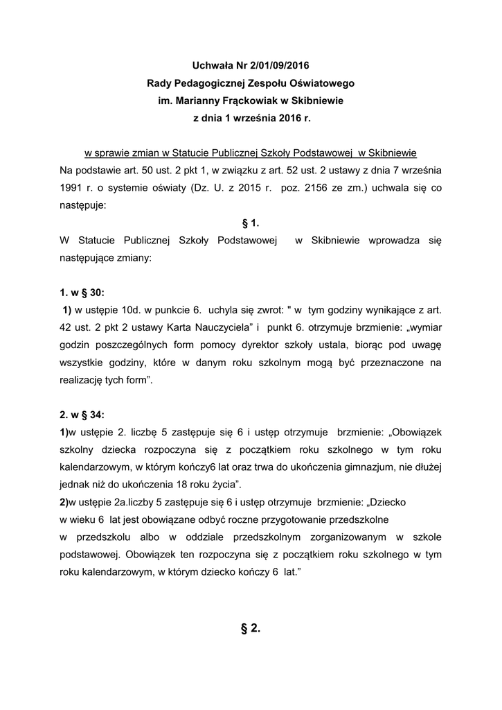 Uchwała Nr 2/01/09/2016 Rady Pedagogicznej Zespołu Oświatowego im. Marianny Frąckowiak w Skibniewie z dnia 1 września 2016 r. w sprawie zmian w Statucie Publicznej Szkoły Podstawowej w Skibniewie Na podstawie art. 50 ust. 2 pkt 1, w związku z art. 52 ust. 2 ustawy z dnia 7 września 1991 r. o systemie oświaty (Dz. U. z 2015 r. poz. 2156 ze zm.) uchwala się co następuje: § 1. W Statucie Publicznej Szkoły Podstawowej w Skibniewie wprowadza się następujące zmiany: 1. w § 30: 1) w ustępie 10d. w punkcie 6. uchyla się zwrot: " w tym godziny wynikające z art. 42 ust. 2 pkt 2 ustawy Karta Nauczyciela” i punkt 6. otrzymuje brzmienie: „wymiar godzin poszczególnych form pomocy dyrektor szkoły ustala, biorąc pod uwagę wszystkie godziny, które w danym roku szkolnym mogą być przeznaczone na realizację tych form”. 2. w § 34: 1)w ustępie 2. liczbę 5 zastępuje się 6 i ustęp otrzymuje brzmienie: „Obowiązek szkolny dziecka rozpoczyna się z początkiem roku szkolnego w tym roku kalendarzowym, w którym kończy6 lat oraz trwa do ukończenia gimnazjum, nie dłużej jednak niż do ukończenia 18 roku życia”. 2)w ustępie 2a.liczby 5 zastępuje się 6 i ustęp otrzymuje brzmienie: „Dziecko w wieku 6 lat jest obowiązane odbyć roczne przygotowanie przedszkolne w przedszkolu albo w oddziale przedszkolnym zorganizowanym w szkole podstawowej. Obowiązek ten rozpoczyna się z początkiem roku szkolnego w tym roku kalendarzowym, w którym dziecko kończy 6 lat.” § 2. Uchwałę podjęto jednomyślnie w głosowaniu jawnym. § 3. Uchwała wchodzi w życie w dniu 1 września 2016 r. § 4. Wykonanie uchwały powierza się dyrektorowi Zespołu Oświatowego w Skibniewie. Przewodniczący Rady Pedagogicznej Wiesława Kapusta