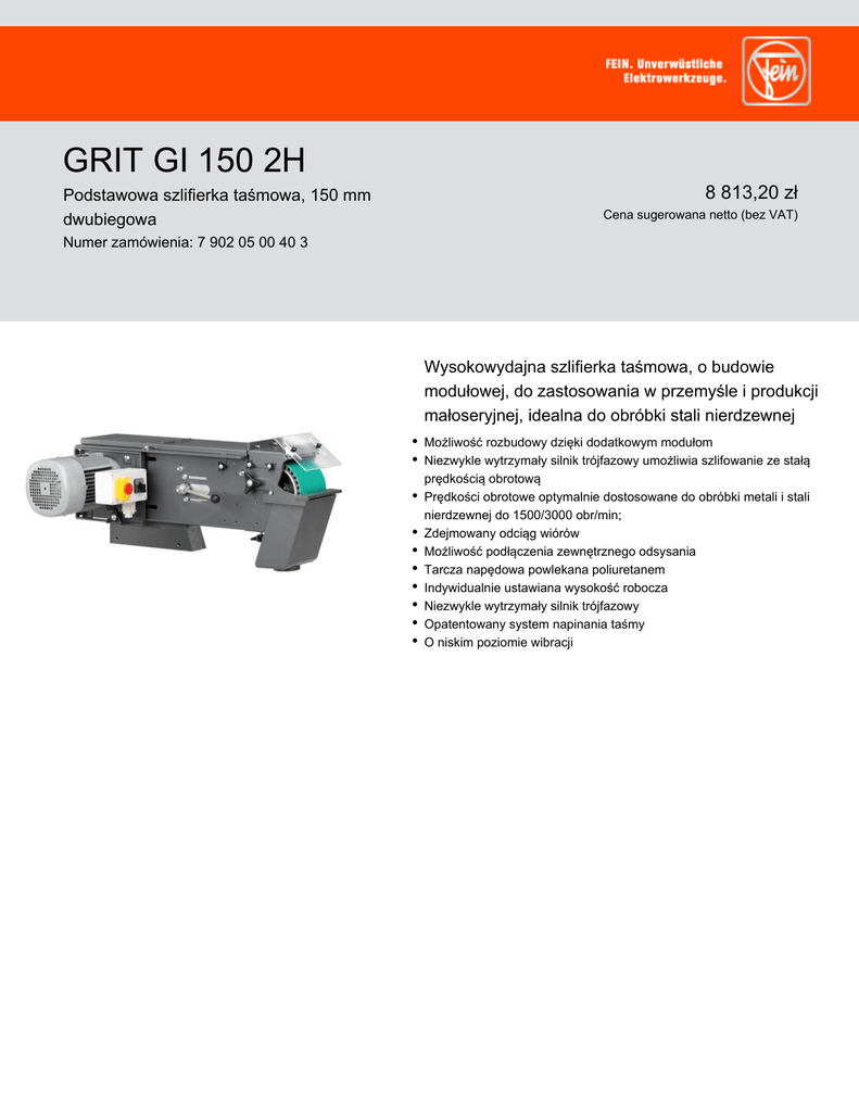 GRIT GI 150 2H Podstawowa szlifierka taśmowa, 150 mm dwubiegowa 8 813,20 zł Cena sugerowana netto (bez VAT) Numer zamówienia: 7 902 05 00 40 3 Wysokowydajna szlifierka taśmowa, o budowie modułowej, do zastosowania w przemyśle i produkcji małoseryjnej, idealna do obróbki stali nierdzewnej Możliwość rozbudowy dzięki dodatkowym modułom Niezwykle wytrzymały silnik trójfazowy umożliwia szlifowanie ze stałą prędkością obrotową Prędkości obrotowe optymalnie dostosowane do obróbki metali i stali nierdzewnej do 1500/3000 obr/min; Zdejmowany odciąg wiórów Możliwość podłączenia zewnętrznego odsysania Tarcza napędowa powlekana poliuretanem Indywidualnie ustawiana wysokość robocza Niezwykle wytrzymały silnik trójfazowy Opatentowany system napinania taśmy O niskim poziomie wibracji GRIT GI 150 2H Podstawowa szlifierka taśmowa, 150 mm dwubiegowa Numer zamówienia: 7 902 05 00 40 3 Dane techniczne Opis Pobór mocy Prędkość obrotowa biegu jałowego Wymiary taśmy Masa Sieciowe Cena obejmuje: 2 prędkości, szerokość szlifowania 150 mm 2,6–3,1 kW 1 500/3 000 obr/min 150 x 2 000 mm 82 kg X 1 wtyczka CEE (16 A) 1 taśma ścierna 150 x 2000 mm (ziarnistość 36 R)