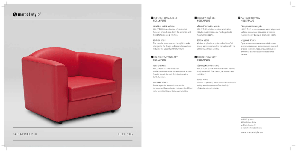 PRODUCT DATA SHEET HOLLY PLUS PRODUKTOVÝ LIST HOLLY PLUS КАРТА ПРОДУКТА HOLLY PLUS General information: HOLLY PLUS is a collection of minimalist furniture of small size. Both the armchair and the sofa have a sleep function. Všeobecné informácie: HOLLY PLUS – kolekcia minimalistického nábytku malých rozmerov. Fotel aj pohovka majú funkciu spania. Общая информация: HOLLY PLUS – это коллекция малогабаритной мебели компактных размеров. И кресло, и диван имеют функцию спального места. Edition 1/2013 The manufacturer reserves the right to make changes to the design and parameters without reducing the usability of the furniture. Edícia 1/2013 Výrobca si vyhradzuje právo na konštrukčné zmeny a zmeny parametrov nemajúce vplyv na úžitkové vlastnosti nábytku. PRODUKTDATENBLATT HOLLY PLUS PRODUKTOVÝ LIST HOLLY PLUS Издание 1/2013 Производитель оставляет за собой право вносить изменения в конструкцию изделий, а также изменять параметры, которые не влияют на эксплуатационные свойства мебели. Allgemeines: HOLLY PLUS ist eine Kollektion minimalistischer Möbel mit kompakten Maßen. Sowohl Sessel als auch Sofa besitzen eine Schlaffunktion. Všeobecné informace: HOLLY PLUS je řada minimalistického nábytku malých rozměrů. Tak křeslo, jak pohovka jsou rozkládací. Ausgabe 1/2013 Änderungen der Konstruktion und der technischen Daten, die den Nutzwert der Möbel nicht beeinträchtigen, bleiben vorbehalten. SK Edice 1/2013 Výrobce si vyhrazuje právo provádět konstrukční změny a změny parametrů nezhoršující užitkové vlastnosti nábytku. Marbet Sp. z o.o. 43-346 Bielsko-Biała ul. Chochołowska 28 e-mail: [email protected] KARTA PRODUKTU HOLLY PLUS w w w.marbetstyle.eu HOLLY PLUS HOLLY PLUS Fotel Holly Plus Sofa Holly Plus INFORMACJE TECHNICZNE 1300 mm 830 mm 1000 mm 1270 mm 800 mm 130 mm 430 mm 620 mm 680 mm 530 mm 430 mm 620 mm 680 mm 820 mm 820 mm 130 mm 1900 mm 1900 mm INFORMACJE OGÓLNE EDYCJA 1/2013 DANE KONTAKTOWE HOLLY PLUS to kolekcja minimalistycznych mebli niewielkich wymiarów. Producent zastrzega sobie prawo Marbet Sp. z o.o. Zarówno fotel jak i sofa posiadają funkcję spania. do zmian konstrukcyjnych oraz zmian 43-346 Bielsko-Biała parametrów nie pogarszających ul. Chochołowska 28 walorów użytkowych mebli. e-mail: [email protected] w w w.marbetstyle.eu