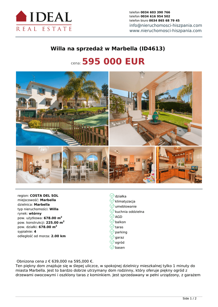 telefon 0034 603 390 766 telefon 0034 616 954 502 telefon biuro 0034 865 68 79 45 [email protected] www.nieruchomosci-hiszpania.com Willa na sprzedaż w Marbella (ID4613) cena: region: COSTA DEL SOL miejscowość: Marbella dzielnica: Marbella typ nieruchomości: Willa rynek: wtórny pow. użytkowa: 678.00 m2 pow. konstrukcji: 225.00 m2 pow. działki: 678.00 m2 sypialnie: 4 odległość od morza: 2.00 km 595 000 EUR działka klimatyzacja umeblowanie kuchnia oddzielna AGD balkon taras parking garaz ogród basen Obnizona cena z € 639,000 na 595,000 €. Ten piękny dom znajduje się w ślepej uliczce, w spokojnej dzielnicy mieszkalnej tylko 1 minuty do miasta Marbella. Jest to bardzo dobrze utrzymany dom rodzinny, który oferuje piękny ogród z drzewami owocowymi i oszklony taras z kominkiem. Jest sprzedawany w pełni urządzony, z garażem Side 1 / 2 i dużym magazynem z oknami. Jest to idealne miejsce do stałego pobytu lub do zamieszkania na okres letni. www.nieruchomosci-hiszpania.com Side 2 / 2 Powered by TCPDF (www.tcpdf.org)