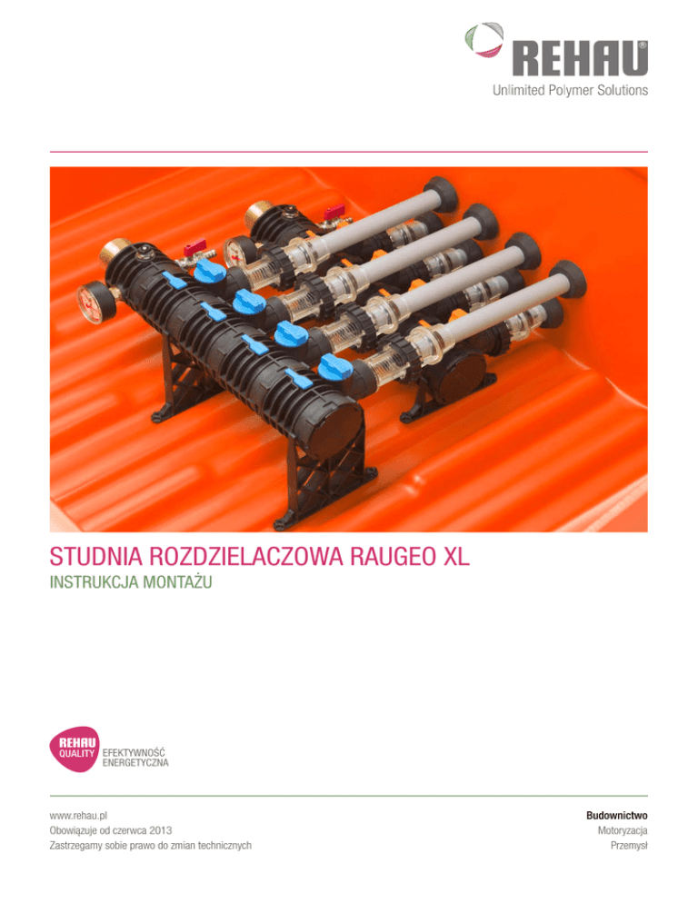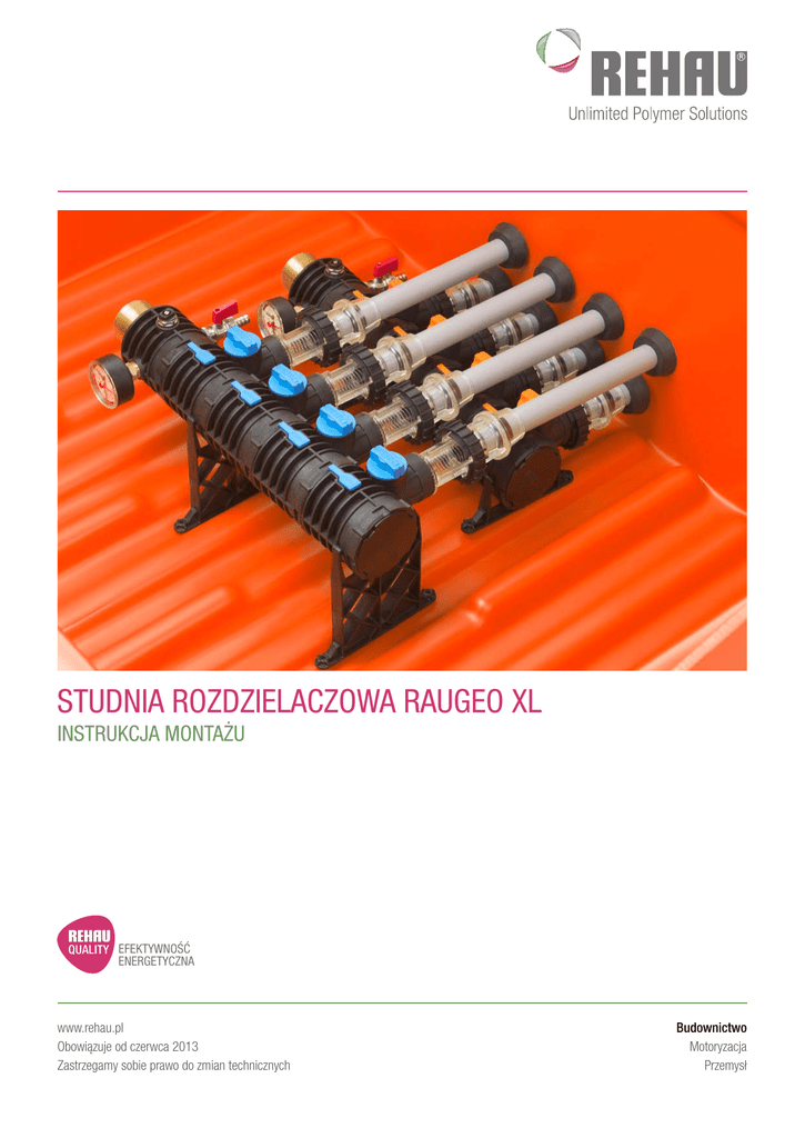 STUDNIA ROZDZIELACZOWA RAUGEO XL INSTRUKCJA MONTAŻU EFEKTYWNOŚĆ ENERGETYCZNA www.rehau.pl Obowiązuje od czerwca 2013 Zastrzegamy sobie prawo do zmian technicznych Budownictwo Motoryzacja Przemysł SPIS TREŚCI 1���������������� Informacje o produkcie: studnia rozdzielaczowa w rozmiarze XL . . . . . . . . . . . . . . . . . . . . . . . 3 1.1������������� Wskazówki ogólne . . . . . . . . . . . . . . . . . . . . . . 3 1.2������������� Specyfikacja produktu . . . . . . . . . . . . . . . . . . . . 3 1.3������������� Wymiary . . . . . . . . . . . . . . . . . . . . . . . . . . . 3 1.4������������� Podłączenia . . . . . . . . . . . . . . . . . . . . . . . . . 3 2���������������� Etapy montażu . . . . . . . . . . . . . . . . . . . . . . . 4 2.1������������� Wykonanie wykopu . . . . . . . . . . . . . . . . . . . . . . 4 2.2������������� Wykonanie podłączeń dla rur w podstawie . . . . . . . . . . 4 2.3������������� Montaż studni . . . . . . . . . . . . . . . . . . . . . . . . 4 2.4������������� Podłączenie obwodów geotermalnych i przewodów doprowadzających . . . . . . . . . . . . . . . . . . . . . . 5 2.5������������� Montaż stożka studni na podstawie . . . . . . . . . . . . . 5 2.6������������� Osadzenie zwieńczenia studni . . . . . . . . . . . . . . . . 5 2.7������������� Zasypanie wykopu . . . . . . . . . . . . . . . . . . . . . . 6 2 1 1.1 INFORMACJE O PRODUKCIE: STUDNIA ROZDZIELACZOWA XL Wskazówki ogólne 1.3 Niniejsza instrukcja montażu obowiązuje wyłącznie w odniesieniu do studni rozdzielaczowej RAUGEO XL. 1.2 Wymiary Masa własna: Wymiary: ok. 64 kg długość x szerokość x wysokość: 1300 mm × 980 mm × 1340 mm Specyfikacja produktu Materiał: Wytrzymałość termiczna: Maksymalne obciążenie pokrywy studzienki*: polietylen do 80 °C ruch pieszy do 200 kg 1.4 Podłączenia Studnia umożliwia uniwersalny montaż wszystkich rozdzielaczy posiadających od dwóch do dwudziestu obwodów. *Studnia została zaprojektowana dla tej klasy obciążenia. Uwaga: Przed zamontowaniem dostarczone komponenty należy sprawdzić pod kątem występowania widocznych uszkodzeń. Podczas montażu w studni należy stosować się do wskazówek podanych w instrukcji montażu dołączonej do rozdzielacza RAUEGO CLICK. 3 2.1 ETAPY MONTAŻU Wymiary wykopu należy dobrać w taki sposób, aby odstęp pomiędzy studnią rozdzielaczową, a ścianą wykopu wynosił na całym obwodzie min. 50 cm. Przed zamontowaniem studni rozdzielaczowej należy zagęścić podłoże, aby zapewnić odpowiednią nośność. Wymiary w mm Studnia rozdzielaczowa Wykop (min.) Szerokość 980 1980 Długość 1300 2300 Wysokość 1340 1440 -- Odległość od istniejących lub planowanych drzew musi odpowiadać co najmniej maksymalnej średnicy korony, aby uniknąć wrastania korzeni -- Podłoże wykopu musi być dostatecznie nośne i równe (wypoziomowane) -- Głębokość wykopu należy wykonać w taki sposób, aby studnia rozdzielaczowa spoczywała na podsypce z piasku o grubości ok. 10-15 cm 2.2 Położenie otworu licząc od lewej strony z zaznaczoną pozycją 4 X 1 2 3 4 5 6 7 8 9 Wykonanie wykopu Wykonanie podłączeń dla rur w podstawie studni Ilość odwodów rozdzielacza 2 10 2 3 4 5 6 7 8 9 10 Uwaga: Możliwe położenia otworów zaznaczono poprzez oznakowanie po zewnętrznej stronie ściany studni. Wyznaczając położenie rozdzielacza RAUEGO CLICK w studni należy uwzględnić dostępną długość przewodu doprowadzającego i montaż zaworów kulowych. Rys. 1-1 Sposób przyłożenia wiertła Rys. 1-2 Osadzanie uszczelki W celu umożliwienia podłączenia przewodów do rozdzielacza konieczne jest wykonanie w ścianie zewnętrznej studni rozdzielaczowej otworów dla każdej rury. W zależności od średnicy rur należy zastosować różne wiertnice. Przepusty w ścianie uszczelnia się przy użyciu uszczelek z gumy. Przed zamontowaniem uszczelek należy posmarować je środkiem ślizgowym RAUGEO. Następnie można je wsunąć w przewidziane do tego celu otwory. Ø rury [mm] maks. Ø otworu* [mm] 20 38 25 38 32 51 40 51 50 64 63 76 *Zaleca się, by wybrana średnica wiertła nie była mniejsza niż 2 mm od podanych wartości. Zalecane położenie przyłączy obwodów geotermalnych/położenie otworów przedstawiono w poniższej tabeli. 75 90 Wskazówka: W przypadku, gdy pomimo zastosowania środka ślizgowego zaślepki nie dają się zamontować, można ostrożnie wbić je przy użyciu młotka gumowego. 2.3 Montaż studni -- Na nośne, równe dno wykopu nasypać ok. 10-15 cm piasku -- Zamocować liny do zaczepów umieszczonych na podstawie -- Ustawić podstawę na podsypce piaskowej w wykopie -- Wypoziomować podstawę! Należy przy tym zwrócić uwagę na to, by zachować w miarę możliwości równy odstęp od krawędzi wykopu. 4 2.4 Podłączenie obwodów geotermalnych i przewodów doprowadzających Miejsce połączenia pomiędzy podstawą, a stożkiem studni rozdzielaczowej uszczelnia się, przymocowując taśmę uszczelniającą na obrzeżu podstawy. Wskazówka: Przed przymocowaniem taśmy uszczelniającej należy oczyścić powierzchnię studni w miejscu, w którym ma być przyklejona. W celu zapewnienia optymalnego uszczelnienia taśmę uszczelniającą w miej scu styku można pociągnąć równolegle do siebie. Rys. 1-3 Przeprowadzenie obwodów geotermalnych Uwaga: W celu zapewnienia wodoszczelności uszczelki przelotowej rury sond oraz przewodów doprowadzających należy przeprowadzić przez ścianę studni idealnie w poziomie i bez wytwarzania naprężeń! Przeprowadzić rury z zewnątrz przez uszczelki przelotowe i osadzić w śrubunkach rozdzielacza.