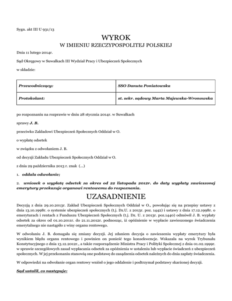Sygn. akt III U 931/13 WYROK W IMIENIU RZECZYPOSPOLITEJ POLSKIEJ Dnia 11 lutego 2014r. Sąd Okręgowy w Suwałkach III Wydział Pracy i Ubezpieczeń Społecznych w składzie: Przewodniczący: SSO Danuta Poniatowska Protokolant: st. sekr. sądowy Marta Majewska-Wronowska po rozpoznaniu na rozprawie w dniu 28 stycznia 2014r. w Suwałkach sprawy J. B. przeciwko Zakładowi Ubezpieczeń Społecznych Oddział w O. o wypłatę odsetek w związku z odwołaniem J. B. od decyzji Zakładu Ubezpieczeń Społecznych Oddział w O. z dnia 29 października 2013 r. znak (...) 1. oddala odwołanie; 2. wniosek o wypłatę odsetek za okres od 22 listopada 2012r. do daty wypłaty zawieszonej emerytury przekazuje organowi rentowemu do rozpoznania. UZASADNIENIE Decyzją z dnia 29.10.2013r. Zakład Ubezpieczeń Społecznych Oddział w O., powołując się na przepisy ustawy z dnia 13.10.1998r. o systemie ubezpieczeń społecznych (t.j. Dz.U. z 2013r. poz. 1442) i ustawy z dnia 17.12.1998r. o emeryturach i rentach z Funduszu Ubezpieczeń Społecznych (t.j. Dz. U. z 2013r. poz.1440) odmówił J. B. wypłaty odsetek za okres od 01.10.2011r. do 21.11.2012r. podnosząc, iż opóźnienie w wypłacie zawieszonego świadczenia emerytalnego nie nastąpiło z winy organu rentowego. W odwołaniu J. B. domagała się zmiany decyzji. Jej zdaniem decyzja o zawieszeniu wypłaty emerytury była wynikiem błędu organu rentowego i powinien on ponieść tego konsekwencje. Wskazała na wyrok Trybunału Konstytucyjnego z dnia 13.12.2012r., a także rozporządzenie Ministra Pracy i Polityki Społecznej z dnia 01.02.1999r. w sprawie szczegółowych zasad wypłacania odsetek za opóźnienia w ustaleniu lub wypłacie świadczeń z ubezpieczeń społecznych. W jej przekonaniu stanowią one podstawę do zasądzenia odsetek należnych do dnia zapłaty świadczenia. W odpowiedzi na odwołanie organ rentowy wniósł o jego oddalenie i podtrzymał podstawy skarżonej decyzji. Sąd ustalił, co następuje: Decyzją z dnia 20.09.2011r. organ rentowy zawiesił wypłatę emerytury odwołującej od dnia 01.10.2011r. Wnioskodawczyni złożyła odwołanie od tej decyzji, które prawomocnym wyrokiem Sądu Okręgowego w Suwałkach z dnia 07.12.2011r. sygn. III U 708/11 zostało oddalone. W dniu 25.11.2012r. odwołująca wystąpiła z wnioskiem o wypłacenie zaległej kwoty emerytury wraz z ustawowymi odsetkami i na tej podstawie decyzją z dnia 23.01.2013r. organ rentowy wznowił wypłatę świadczenia emerytalnego od dnia 22.11.2012r. W dniu 10.01.2013r. odwołująca wystąpiła do Sądu Okręgowego w Suwałkach ze skargą o wznowienie postępowania w sprawie III U 708/11, domagając wznowienia wypłaty świadczenia od dnia 01.10.2011r. wraz z odsetkami. Powołała się na wyrok Trybunału Konstytucyjnego z dnia 13.11.2012r. Wyrokiem z dnia 26.02.2013r. sygn. III U 37/13 Sąd Okręgowy w Suwałkach oddalił skargę o wznowienie postępowania w części dotyczącej wypłaty emerytury od 01.10.2011r. do 21.11.2012r. oraz wypłaty odsetek i umorzył postępowanie w części dotyczącej wypłaty emerytury od dnia 22.11.2012r. W związku z apelacją odwołującej Sąd Apelacyjny w Białymstoku wyrokiem z dnia 17.10.2013r. zmienił wyrok Sądu Okręgowego i wznowił postępowanie w sprawie III U 708/11 i zmienił wyrok Sądu Okręgowego z dnia 07.12.2011r. oraz decyzję ZUS z dnia 20.09.2011r. uznając, że wnioskodawczyni przysługuje prawo do wypłaty emerytury od dnia 01.11.2011r. do 21.11.2012r. Natomiast wniosek o wypłatę odsetek przekazał do Zakładu Ubezpieczeń Społecznych Oddział w O. celem rozpoznania. W dniu 29.10.2013r. Zakład Ubezpieczeń Społecznych Oddział w O. wydał dwie decyzje. Pierwszą decyzją wykonał wyrok Sądu Apelacyjnego i wznowił wypłatę emerytury od dnia 01.10.2011r. (od daty określonej w wyroku). Drugą decyzją (skarżoną) odmówił wypłaty odsetek za okres od 01.10.2011r. do dnia 21.11.2012r. Sąd zważył, co następuje: Jak stanowi art. 85 ust. 1 ustawy z dnia 13.10.1998r. o systemie ubezpieczeń społecznych (t.j. Dz.U. z 2013r. poz. 1442) jeżeli Zakład - w terminach przewidzianych w przepisach określających zasady przyznawania i wypłacania świadczeń pieniężnych z ubezpieczeń społecznych lub świadczeń zleconych do wypłaty na mocy odrębnych przepisów albo umów międzynarodowych - nie ustalił prawa do świadczenia lub nie wypłacił tego świadczenia, jest obowiązany do wypłaty odsetek od tego świadczenia w wysokości odsetek ustawowych określonych przepisami prawa cywilnego. Nie dotyczy to przypadku, gdy opóźnienie w przyznaniu lub wypłaceniu świadczenia jest następstwem okoliczności, za które Zakład nie ponosi odpowiedzialności. Powyższy przepis stanowi regulację szczególną względem przepisów Kodeksu cywilnego, której odrębność polega przede wszystkim na powstaniu obowiązku zapłaty odsetek wyłącznie w wypadku zwłoki. Zwłoka w spełnieniu świadczenia ma miejsce wtedy, gdy zobowiązany pomimo istniejącego obowiązku nie spełnia świadczenia w terminie, przy czym niedotrzymanie terminu jest następstwem okoliczności, za które ponosi odpowiedzialność. Chodzi więc o odsetki za zwłokę w świadczeniu powstałą na skutek okoliczności, za które ten organ odpowiada, a nie za opóźnienie, w którym nie ma elementu winy w jakiejkolwiek postaci (por. wyrok Sądu Najwyższego z dnia 27.09.2002r. sygn. II UK 214/02 LEX 57164). W orzecznictwie Sądu Najwyższego przepis art. 85 ust. 1 zd. 2 ustawy o sus interpretowany jest jednoznacznie w interesie ubezpieczonych w ten sposób, że stwierdzenie braku odpowiedzialności organu rentowego wypłacającego świadczenie z opóźnieniem wymaga wykazania, iż w przepisanym terminie przesłanki spełnienia określonego świadczenia nie były wykazane, więc ZUS nie mógł jednoznacznie stwierdzić nabycia prawa do określonego świadczenia. Do wyłączenia obowiązku wypłaty odsetek nie jest wystarczające wykazanie, 