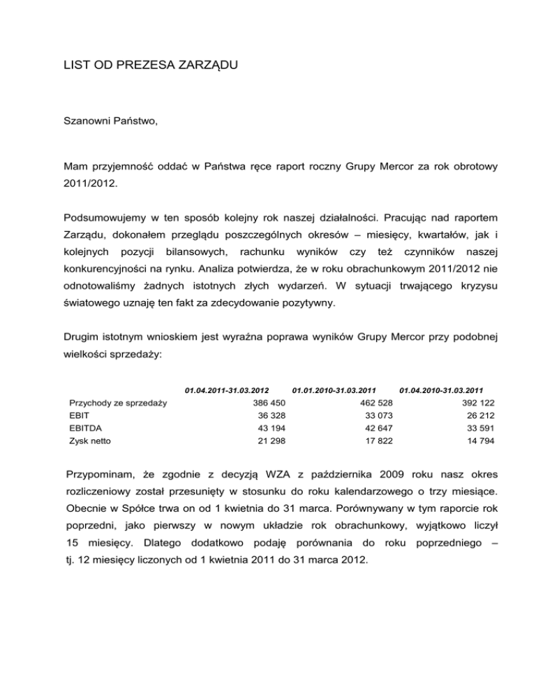 LIST OD PREZESA ZARZĄDU Szanowni Państwo, Mam przyjemność oddać w Państwa ręce raport roczny Grupy Mercor za rok obrotowy 2011/2012. Podsumowujemy w ten sposób kolejny rok naszej działalności. Pracując nad raportem Zarządu, dokonałem przeglądu poszczególnych okresów – miesięcy, kwartałów, jak i kolejnych pozycji bilansowych, rachunku wyników czy też czynników naszej konkurencyjności na rynku. Analiza potwierdza, że w roku obrachunkowym 2011/2012 nie odnotowaliśmy żadnych istotnych złych wydarzeń. W sytuacji trwającego kryzysu światowego uznaję ten fakt za zdecydowanie pozytywny. Drugim istotnym wnioskiem jest wyraźna poprawa wyników Grupy Mercor przy podobnej wielkości sprzedaży: 01.04.2011-31.03.2012 Przychody ze sprzedaży 01.01.2010-31.03.2011 01.04.2010-31.03.2011 386 450 462 528 392 122 EBIT 36 328 33 073 26 212 EBITDA 43 194 42 647 33 591 Zysk netto 21 298 17 822 14 794 Przypominam, że zgodnie z decyzją WZA z października 2009 roku nasz okres rozliczeniowy został przesunięty w stosunku do roku kalendarzowego o trzy miesiące. Obecnie w Spółce trwa on od 1 kwietnia do 31 marca. Porównywany w tym raporcie rok poprzedni, jako pierwszy w nowym układzie rok obrachunkowy, wyjątkowo liczył 15 miesięcy. Dlatego dodatkowo podaję porównania do roku poprzedniego – tj. 12 miesięcy liczonych od 1 kwietnia 2011 do 31 marca 2012. Trzecie spostrzeżenie, na które chciałem zwrócić Państwa uwagę, to poprawa przepływów gotówkowych z działalności operacyjnej, przedstawiają się one następująco: 01.04.2011-31.03.2012 01.01.2010-31.03.2011 01.04.2010-31.03.011 Przepływy z działalności operacyjnej 28 841 19 994 20 382 Przepływy z działalności inwestycyjnej -17 423 3 805 -9 819 Przypływy z działalności finansowej -9 850 -35 245 -12 733 1 568 -11 446 -2 170 Zmiana stanu środków pieniężnych Wyniki te osiągnęliśmy, pracując w otoczeniu rynkowym bardzo podobnym do zeszłorocznego, czyli w sytuacji zmniejszonego popytu wynikającego z ograniczenia inwestycji oraz nieustającej presji cenowej. Konsekwentnie prowadziliśmy naszą aktywność biznesową w branży biernych zabezpieczeń przeciwpożarowych. Wszystkie kontrakty, które posiadała spółka Bem, a wykraczały one poza wybrany zakres, zostały w minionym roku zakończone i straty z tego tytułu należy uznać za ostateczne. Niemniej kontrakty te zaważyły jeszcze istotnie na wynikach zakończonego roku obrotowego, przynosząc w efekcie blisko 6 mln zł straty na działalności operacyjnej spółki Bem. W efekcie przyjętej i konsekwentnie realizowanej strategii rozwoju Grupy Mercor w ubiegłym roku odnotowaliśmy dobrą dynamikę wzrostu przychodów, zwłaszcza: 1. w sprzedaży eksportowej działu oddzieleń przeciwpożarowych: +26% rok do roku, 2. w segmencie usług serwisowych: +25% rok do roku, zwracam przy tym uwagę, że dzieje się tak już drugi rok z rzędu, 3. w sprzedaży rosyjskiej spółki Mercor-Proof: +120% rok do roku co wiązało się z otwarciem lokalnej produkcji. W skali całej Grupy Mercor Zarząd utrzymał wszystkie kluczowe zasoby i kompetencje, zwłaszcza handlowe, które tworzą naszą długofalową przewagę konkurencyjną. Jednocześnie uzyskany zostały efekt istotnego obniżenia kosztów ogólnego zarządu o 16,8% rok do roku. Porządkowanie handlowych i Grupy po dokonanych produkcyjnych skutkowało akwizycjach, obniżeniem przenoszenie wyceny kompetencji wartości godziwej posiadanych udziałów Bem i Tecresy na poziomie sprawozdania jednostkowego Mercor SA. Wartość firmy wykreowana w wyniku akwizycji (tak zwany goodwill) pozostała jednak niezmieniona. Bez zmian pozostają także strategia i główne kierunki działań Grupy Mercor, które mają nam zapewnić wzrost sprzedaży, udziału w rynku, a w efekcie także zwiększenie zysku. Te kierunku to: 1. wzrost efektywności, 2. pozyskiwanie nowych rynków zbytu, 3. wprowadzanie do oferty nowych, lepszych produktów z zakresu biernych zabezpieczeń pożarowych. Kiedy mówimy o przyszłości, z mojego punktu widzenia ważne są zwłaszcza nasze projekty rozwojowe, praca nad nowymi produktami. Bardzo obiecująco wygląda baza blisko trzydziestu takich projektów, które są w toku. W omawianym roku kilka z nich zostało zakończonych, a produkty trafiły już do sprzedaży. Dobrymi przykładami są choćby: nowy, skonstruowany przez zespół Spółki Mercor wentylator dachowy mcr Pasat, przeciwpożarowe drzwi stalowe bezprzylgowe mcr Alpe Plus oraz oddymiające klapy żaluzjowe mcr LAM w zmodyfikowanej wersji. Jestem przekonany, że działania, które podjęliśmy, będą przybliżać nas do realizacji celów Akcjonariuszy, Zarządu i Pracowników. Tym ostatnim szczególnie dziękuję za włożony wysiłek i zaangażowanie. Krzysztof Krempeć Prezes Zarządu Mercor SA