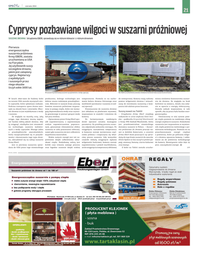 czerwiec 2014 21 Cyprysy pozbawiane wilgoci w suszarni próżniowej fot. Eberl Pierwsza energooszczędna suszarnia próżniowa firmy EBERL została uruchomiona w USA na Florydzie. Jej użytkownik suszy szczególne drewno, jakim jest zatopiony cyprys. Najstarszy z wydobytych i suszonych przez niego okazów liczył sobie 1600 lat. fot. Eberl SUSZENIE DREWNA | Urządzenia EBERL sprawdzają się w różnym klimacie i z różnym drewnem W suszarni próżniowej suszone są wyłowione z wody cyprysy. W latach 1890-1920 do budowy kolei na terenie USA zostało wyciętych wiele cyprysów, które spławiano rzekami. Podczas transportu sporo drzew zatonęło na skutek burz i sztormów. Obecnie drewno to jest wydobywane z wody i suszone. Ze względu na wysoką cenę, jaką osiąga, jego dostawcy muszą zapewnić bardzo dobrą jakość drewna. Aby ją osiągnąć, niezbędna jest niezawodna technologia suszenia wyłowionych z wody cyprysów. Dlatego jeden z przedsiębiorców amerykańskich, który wyspecjalizował się w pozyskiwaniu i dostarczaniu tego typu drewna, zdecydował się na zakup suszarni firmy Eberl. Jest to pierwsza suszarnia sprzedana do USA przez tego niemieckiego REKLAMA producenta, którego technologia jest dobrze znana rodzimym przedsiębiorcom. Również w naszym kraju pracują bowiem suszarnie próżniowe wyposażone w pompę ciepła, które nie wymagają doprowadzenia wody oraz czynnika grzewczego w postaci gorącej wody lub pary wodnej. Opracowany przez firmę Eberl sposób napowietrzania, z zapewnionym stałym napowietrzaniem poprzecznym, gwarantuje równomierne efekty suszenia w całej przestrzeni roboczej, nawet gdy suszarnia nie jest całkowicie wypełniona materiałem. Niskie zużycie energii jest też zapewnione dzięki całkowitemu odzyskowi ciepła. Dodatkową zaletą jest krótki czas trwania samego procesu oraz łagodne suszenie dzięki niskiej temperaturze. Pozwala to na zachowanie koloru drewna liściastego oraz możliwość parowania i suszenia w jednej operacji. Przeznaczone do suszenia drewno jest układane na platformie szynowej, wyposażane w czujniki i wwożone do komory. Po hermetycznym zamknięciu drzwi operator ustawia wymagane parametry. Za przebieg procesu suszenia odpowiada jednostka sterująca. Po osiągnięciu nastawionej temperatury w komorze zostaje wytworzona częściowa próżnia i rozpoczyna się właściwy proces suszenia. Gdy wszystkie czujniki wskażą osiągnięcie żądanej wilgotności końcowej, komora zostaje napowietrzona i powoli wychłodzona, aż do osiągnięcia temperatury zbliżonej Na Tahiti uruchomiona została niedawno kontenerowa suszarnia do drewna. do zewnętrznej. Komory mają radiowy pomiar wilgotności drewna i wizualizację do sterowania suszarnią z komputera lub zdalnie przez Internet. Suszą nawet na Tahiti – Urządzenia firmy Eberl znajdują nabywców w coraz większej ilości krajów – podkreśla Krzysztof Wasilewski z firmy PFZ Kubiak-Wasilewski, która jest przedstawicielem niemieckiego dostawcy suszarni w Polsce. – Suszarnia próżniowa do drewna pracuje nawet w dalekim Kamerunie, a ostatnio firma Eberl może poszczycić się sprzedażą do tego kraju suszarni do owoców. Klient będzie w niej suszył w próżni papaję, ananasy, banany, ziarno kakaowe oraz mango. Z kolei na Tahiti została urucho- miona niedawno kontenerowa suszarnia do drewna. Ze względu na brak kotłowni na miejscu, działa ona jedynie w oparciu o energię elektryczną. Została jednak wyposażona w taki sposób, aby jej praca była bardzo energooszczędna. Umieszczony w niej system pompy ciepła pozwala na zamknięty obieg energii cieplnej w suszarni. Dodatkowo suszarnia jest wyposażona w wymiennik ciepła powietrza wylotowego z powietrzem wchodzącym. Pozwala on na przechwytywanie energii cieplnej z powietrza, które po pobraniu wilgoci z drewna opuszcza komorę, i oddawanie jej do powietrza wchodzącego do komory. Rozwiązanie takie daje 25 proc. oszczędności energii. L sm
