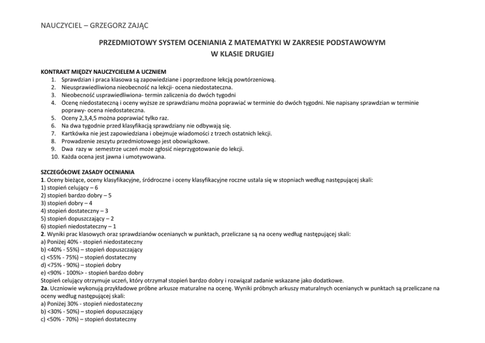 NAUCZYCIEL – GRZEGORZ ZAJĄC PRZEDMIOTOWY SYSTEM OCENIANIA Z MATEMATYKI W ZAKRESIE PODSTAWOWYM W KLASIE DRUGIEJ KONTRAKT MIĘDZY NAUCZYCIELEM A UCZNIEM 1. Sprawdzian i praca klasowa są zapowiedziane i poprzedzone lekcją powtórzeniową. 2. Nieusprawiedliwiona nieobecność na lekcji- ocena niedostateczna. 3. Nieobecność usprawiedliwiona- termin zaliczenia do dwóch tygodni 4. Ocenę niedostateczną i oceny wyższe ze sprawdzianu można poprawiać w terminie do dwóch tygodni. Nie napisany sprawdzian w terminie poprawy- ocena niedostateczna. 5. Oceny 2,3,4,5 można poprawiać tylko raz. 6. Na dwa tygodnie przed klasyfikacją sprawdziany nie odbywają się. 7. Kartkówka nie jest zapowiedziana i obejmuje wiadomości z trzech ostatnich lekcji. 8. Prowadzenie zeszytu przedmiotowego jest obowiązkowe. 9. Dwa razy w semestrze uczeń może zgłosić nieprzygotowanie do lekcji. 10. Każda ocena jest jawna i umotywowana. SZCZEGÓŁOWE ZASADY OCENIANIA 1. Oceny bieżące, oceny klasyfikacyjne, śródroczne i oceny klasyfikacyjne roczne ustala się w stopniach według następującej skali: 1) stopień celujący – 6 2) stopień bardzo dobry – 5 3) stopień dobry – 4 4) stopień dostateczny – 3 5) stopień dopuszczający – 2 6) stopień niedostateczny – 1 2. Wyniki prac klasowych oraz sprawdzianów ocenianych w punktach, przeliczane są na oceny według następującej skali: a) Poniżej 40% - stopień niedostateczny b) <40% - 55%) – stopień dopuszczający c) <55% - 75%) – stopień dostateczny d) <75% - 90%) – stopień dobry e) <90% - 100%> - stopień bardzo dobry Stopień celujący otrzymuje uczeń, który otrzymał stopień bardzo dobry i rozwiązał zadanie wskazane jako dodatkowe. 2a. Uczniowie wykonują przykładowe próbne arkusze maturalne na ocenę. Wyniki próbnych arkuszy maturalnych ocenianych w punktach są przeliczane na oceny według następującej skali: a) Poniżej 30% - stopień niedostateczny b) <30% - 50%) – stopień dopuszczający c) <50% - 70%) – stopień dostateczny d) <70% - 86%) – stopień dobry e) <86% - 100%) – stopień bardzo dobry f) 100% - stopień celujący 3. Formy sprawdzania wiedzy i umiejętności: 1) formy ustne: a) odpowiedzi b) wypowiedzi na lekcji (aktywność), 2) formy pisemne: a) praca klasowa - jest to praca pisemna obejmująca zamkniętą partię materiału poprzedzona powtórzeniem danej partii materiału. Czas przeznaczony na pisanie co najmniej 40 minut b) sprawdziany - praca pisemna obejmująca większą partię materiału (więcej niż 3 lekcje), zapowiedziany z tygodniowym wyprzedzeniem, omówiony jego zakres, czas pisania 30-45 minut, c) kartkówki - praca pisemna obejmująca materiał z ostatnich1-3 lekcji, niezapowiedziana, czas pisania 15-20 minut, d) testy (różnego typu), g) zadania domowe, ) i) prace dodatkowe (nieobligatoryjne) j) prace kontrolne (nieobligatoryjne) 4. Nauczyciel informuje uczniów o przewidzianym terminie pracy klasowej, sprawdzianie wiadomości z tygodniowym wyprzedzeniem. 1. Planowaną pracę klasową, sprawdzian nauczyciel wpisuje w dzienniku lekcyjnym, zaznaczając kolejność wpisu - w ciągu tygodnia uczniowie mogą mieć trzy prace klasowe lub sprawdziany, a w ciągu dnia jedną ( nie dotyczy kartkówek), 2. Zmiana terminu pracy klasowej lub sprawdzianu może się odbyć na życzenie uczniów z zastrzeżeniem, że przy ustalaniu nowego terminu nie obowiązuje podpunkt 1. 3. Nauczyciel zobowiązany jest podać uczniom zakres materiału, jaki obejmuje praca klasowa, sprawdzian. 4. Praca klasowa, sprawdzian musi być poprzedzony lekcją utrwalającą materiał. 5. Sprawdzone i ocenione prace pisemne nauczyciel oddaje uczniom w nieprzekraczalnym terminie dwóch tygodni. Z przyczyn losowych termin może być przesunięty o jeden tydzień. 6. Sprawdzone i ocenione prace pisemne są udostępniane uczniowi i jego rodzicom (prawnym opiekunom) na zebraniach z rodzicami i w trakcie indywidualnych spotkań z rodzicami. 7. Prace klasowe, sprawdziany i kartkówki przechowywane są przez nauczyciela przedmiotu do końca roku szkolnego. 9. Dwa tygodnie przed radą klasyfikacyjną prac pisemnych nie można przeprowadzać. 10. Uczeń ma prawo do poprawy ocen uzyskanych z prac klasowych i sprawdzianów: dwukrotna próba poprawy w ciągu dwóch tygodni (10 dni roboczych) od dnia oddania pracy. Poprawy odbywają się na zajęciach pozalekcyjnych. 11. Oceny są jawne zarówno dla słuchacza, ucznia jak i jego rodziców (prawnych opiekunów). 12. Na wniosek ucznia lub jego rodziców (prawnych opiekunów) nauczyciel uzasadnia ustaloną ocenę. 13. Na wniosek ucznia lub jego rodziców (prawnych opiekunów), sprawdzone i ocenione pisemne prace kontrolne oraz inna dokumentacja dotycząca oceniania ucznia jest udostępniana uczniowi lub jego rodzicom (prawnym opiekunom) 5. Nauczyciel jest obowiązany, na podstawie opinii publicznej poradni psychologiczno-pedagogicznej w tym publicznej poradni specjalistycznej, dostosować wymagania edukacyjne, o których mowa w § 53 pkt1, do indywidualnych potrzeb psychofizycznych i edukacyjnych ucznia lub słuchacza, u którego stwierdzono zaburzenia i odchylenia rozwojowe lub specyficzne trudności w uczeniu się, uniemożliwiające sprostanie tym wymaganiom. 6. W przypadku ucznia posiadającego orzeczenie o potrzebie kształcenia specjalnego albo indywidualnego nauczania dostosowanie wymagań edukacyjnych, o których mowa w § 53 pkt. 1, do indywidualnych potrzeb psychofizycznych i edukacyjnych ucznia może nastąpić na podstawie tego orzeczenia. 7. 1. Oceny śródroczne i na koniec roku szkolnego wystawiane są na podstawie średniej ważonej (wg wzoru: suma iloczynów waga razy ocena przez suma wag), wg poniższej skali: <1,75-2,75) dopuszczający <2,75-3,75) dostateczny <3,75-4,75) dobry <4,75-5,75) bardzo dobry <5,75-6,0> celujący Ocena z pracy klasowej/sprawdzianu- waga 5 Ocena z kartkówki- waga 4 Ocena z odpowiedzi- waga 3 Ocena za zadanie domowe- waga 2 Ocena za aktywn