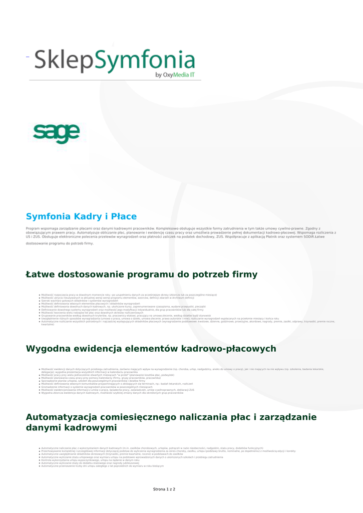 Symfonia Kadry i Płace Program wspomaga zarządzanie płacami oraz danymi kadrowymi pracowników. Kompleksowo obsługuje wszystkie formy zatrudnienia w tym także umowy cywilno-prawne. Zgodny z obowiązującym prawem pracy. Automatyzuje obliczanie płac, planowanie i ewidencję czasu pracy oraz umożliwia prowadzenie pełnej dokumentacji kadrowo-płacowej. Wspomaga rozliczenia z US i ZUS. Obsługuje elektroniczne polecenia przelewów wynagrodzeń oraz płatności zaliczek na podatek dochodowy, ZUS. Współpracuje z aplikacją Płatnik oraz systemem SODiR.Łatwe dostosowanie programu do potrzeb firmy. Łatwe dostosowanie programu do potrzeb firmy Możliwość rozpoczęcia pracy w dowolnym momencie roku –po uzupełnieniu danych za wcześniejsze okresy (zbiorczo lub za poszczególne miesiące) Możliwość ukrycia nieużywanych w aktualnej wersji wersji programu elementów, wzorców, definicji zdarzeń w Archiwum definicji Szeroki wachlarz gotowych składników i systemów wynagrodzeń Możliwość definiowania własnych elementów płacowych i składników wynagrodzeń Możliwość definiowania dowolnych danych kadrowych, np. ukończone kursy, zaprenumerowane czasopisma, wydane przepustki, pieczątki Definiowanie dowolnego systemu wynagrodzeń oraz możliwość jego modyfikacji indywidualnie, dla grup pracowników lub dla całej firmy Możliwość tworzenia wielu rodzajów list płac oraz dowolnych okresów rozliczeniowych Grupowanie pracowników według dowolnych kryteriów, np. pracownicy etatowi, pracujący na umowę-zlecenie, według działów bądź stanowisk Uwzględnienie różnych sposobów wynagradzania (umowa o pracę, umowa o dzieło, umowa-zlecenie, prawa autorskie i inne); rozliczanie wynagrodzeń wypłacanych na przełomie miesięcy i końca roku Automatyczne rozliczanie wszystkich potrzebnych i najczęściej występujących składników płacowych (wynagrodzenie podstawowe: kwotowe, dzienne, godzinowe, prowizyjne, akordowe, nagrody, premie, zasiłki, odprawy, trzynastki, premie roczne, kwartalne) Wygodna ewidencja elementów kadrowo-płacowych Możliwość ewidencji danych dotyczących przebiegu zatrudnienia, zarówno mających wpływ na wynagrodzenie (np. choroba, urlop, nadgodziny, aneks do umowy o pracę), jak i nie mających na nie wpływu (np. szkolenia, badania lekarskie, delegacja); wygodna prezentacja wszystkich informacji w kalendarzu pracownika Możliwość pracy przy wielu jednocześnie otwartych miesiącach "w przód" (planowanie kosztów płac, podwyżek) Możliwość planowania czasu pracy przy pomocy kalendarzy (firmy, grupy pracowników, pracownika) Sporządzanie planów urlopów, szkoleń dla poszczególnych pracowników i działów firmy Możliwość definiowania własnych komunikatów przypominających o zbliżających się terminach, np.: badań lekarskich, rozliczeń Gromadzenie informacji o systemie wynagrodzeń pracowników w poszczególnych miesiącach Możliwość ewidencjonowania informacji z umów o pracę, świadectw pracy, zaświadczeń, umów cywilnoprawnych, deklaracji ZUS Wygodna zbiorcza ewidencja danych kadrowych, możliwość szybkiej zmiany danych dla określonych grup pracowników Automatyzacja comiesięcznego naliczania płac i zarządzanie danymi kadrowymi Automatyczne naliczanie płac z wykorzystaniem danych kadrowych (m.in. zasiłków chorobowych, urlopów, potrąceń w razie nieobecności, nadgodzin, stażu pracy, dodatków funkcyjnych) Przechowywanie kompletnej i szczegółowej informacji dotyczącej podstaw do wyliczenia wynagrodzenia za okres choroby, zasiłku, urlopu (podstawy brutto, nominalne, po dopełnieniu) z możliwością edycji i korekty Automatyczne uwzględnianie składników okresowych (trzynastki, premie kwartalne, roczne) w podstawach do zasiłków Automatyczne wyliczanie stażu urlopowego oraz wymiaru urlopu na podstawie wprowadzonych danych o ukończonych szkołach i przebiegu zatrudnienia Kontrola wykorzystania urlopu wypoczynkowego, urlopu na żądanie w danym roku Automatyczne wyliczanie staży do dodatku stażowego oraz nagrody jubileuszowej Automatyczne przenoszenie liczby dni urlopu zaległego z lat poprzednich do wymiaru w roku bieżącym Strona 1 z 2 Kontrola wykorzystania urlopu przed terminem przedawnienia (3 lata) oraz proporcjonalne naliczanie urlopu w roku Kartoteka list płac, umożliwiająca przeglądanie list płac lub wydrukowanie wstecznie dowolnej listy płac Możliwość tworzenia wielu list płac w jednym miesiącu Automatyczne przenoszenie stałych elementów wynagrodzeń oraz zmian dokonanych w danym miesiącu (dodanie lub usunięcie pewnego składnika systemu wynagrodzeń dla pracownika, zmiana wartości parametru płacowego, itp.) do następnych okresów. Możliwość rozliczania zasiłków przy umowach cywilnoprawnych Możliwość rozliczania umów cywilnoprawnych w ratach oraz pilnowania stanu rozliczenia rozpoczętej transakcji Możliwość rozliczania dwóch różnych umów cywilnoprawnych (jedna z ubezpieczeniami, druga bez ubezpieczeń) w jednym okresie płacowym Walidacja poprawności wypełnionych danych kadrowych przy zgłaszaniu pracowników do ZUS: raport sprawdzający poprawność danych w zestawach kadrowych Zgłoszenie ZUA/ZZA i Wyrejestrowanie ZWUA Raport prezentujący listę pracowników w danym miesiącu, którym należy się wyrównanie do wynagrodzenia minimalnego wraz z automatycznie wyliczoną kwotą do wyrównania Automatyczne obliczanie wartości wynagrodzenia (lub jego składników) brutto przy założonej wartości netto Możliwość zarządzania i kontrola nad potrąceniami urzędowymi i innymi z pensji pracownika; potrącenia naliczane są tak, aby pozostawić pracownikowi kwotę wolną od potrąceń; potrącenie możliwe jest do kwoty ustalonej przez Kodeks Pracy w zależności od rodzaju potrąceń –w ten sposób naliczane są alimenty, potrącenia z tytułem wykonawczym, kary Pieniężnem potrącenia za zgodą pracownika i zaliczki pieniężne Automatyczne