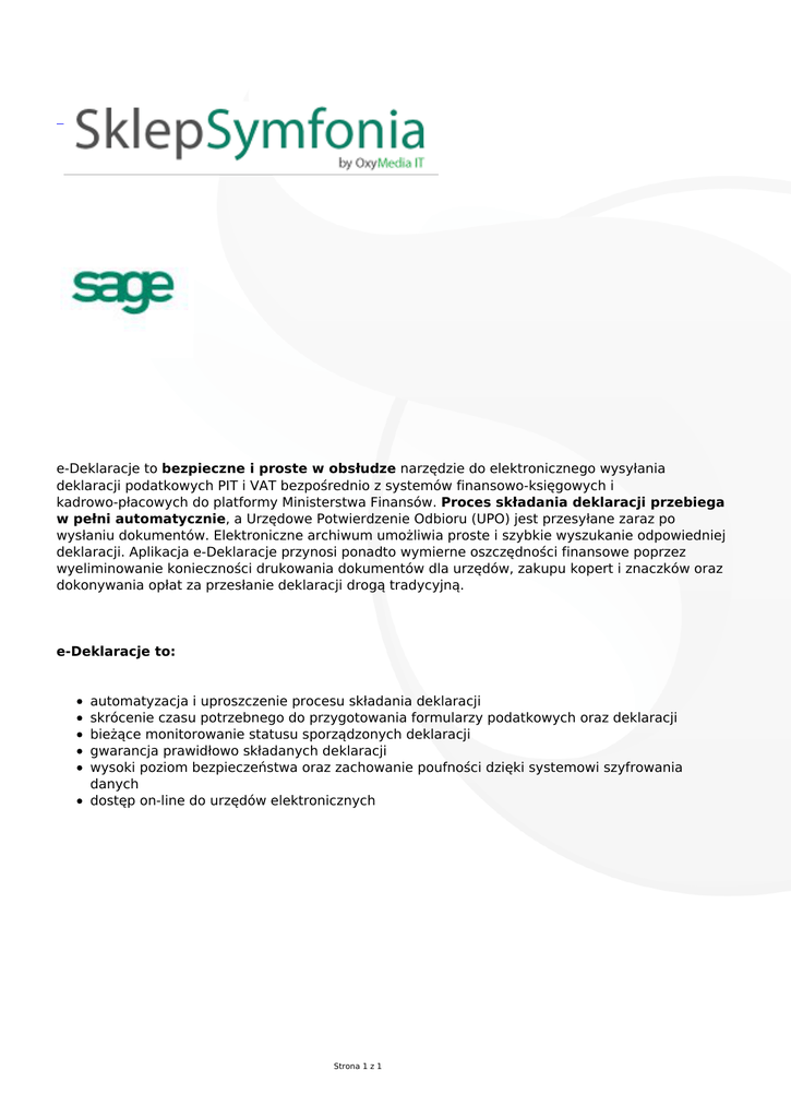 e-Deklaracje to bezpieczne i proste w obsłudze narzędzie do elektronicznego wysyłania deklaracji podatkowych PIT i VAT bezpośrednio z systemów finansowo-księgowych i kadrowo-płacowych do platformy Ministerstwa Finansów. Proces składania deklaracji przebiega w pełni automatycznie, a Urzędowe Potwierdzenie Odbioru (UPO) jest przesyłane zaraz po wysłaniu dokumentów. Elektroniczne archiwum umożliwia proste i szybkie wyszukanie odpowiedniej deklaracji. Aplikacja e-Deklaracje przynosi ponadto wymierne oszczędności finansowe poprzez wyeliminowanie konieczności drukowania dokumentów dla urzędów, zakupu kopert i znaczków oraz dokonywania opłat za przesłanie deklaracji drogą tradycyjną. e-Deklaracje to: automatyzacja i uproszczenie procesu składania deklaracji skrócenie czasu potrzebnego do przygotowania formularzy podatkowych oraz deklaracji bieżące monitorowanie statusu sporządzonych deklaracji gwarancja prawidłowo składanych deklaracji wysoki poziom bezpieczeństwa oraz zachowanie poufności dzięki systemowi szyfrowania danych dostęp on-line do urzędów elektronicznych Strona 1 z 1