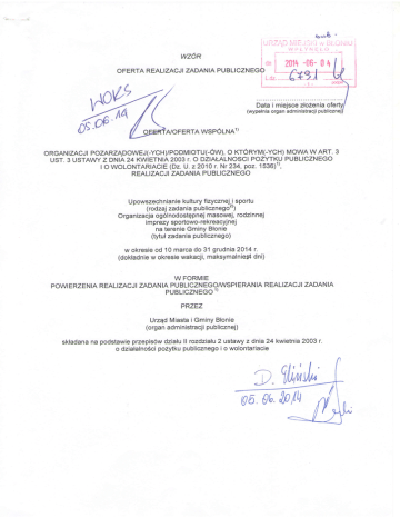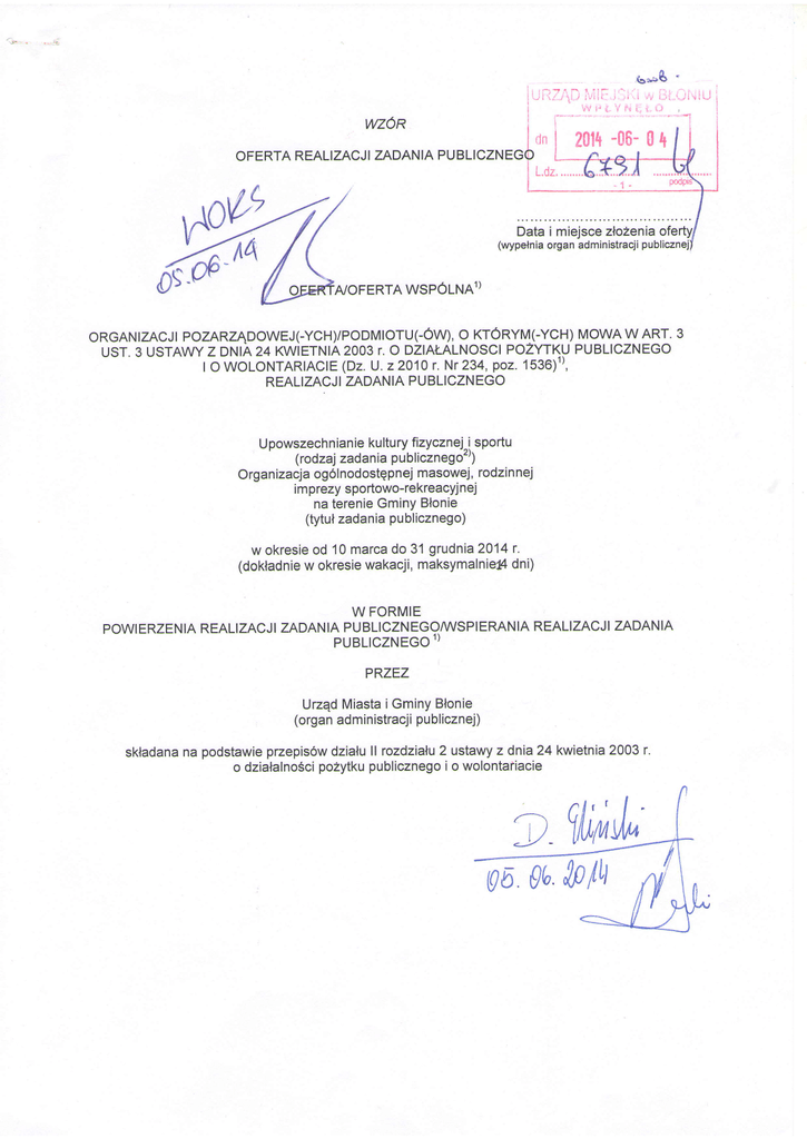 Data imiejscezloZenia (wypefnia organ administracji FERTA WSPOLNA1) ORGAN tZAcJ I pOZARzADOWEJ(-YCHyPODIU tOru 1-6W;, O xrOnvM(-YCH ) MOWA W ART. 3 UST. 3 USTAWY Z DNIA 24 KWIETNIA 2OO3 T. O DZIAT.ALNOSCI POZYTKU PUBLICZNEGO I O WOLONTARIACIE (Dz. U. 22010 r. Nr 234, poz. 1536)1), REALIZACJI ZADANIA PU BLICZNEGO U n ianie ku ltury fizy czneyi sportu rodzaj zadania P u blicznego") izacja o96l nod ostqpnej masowej, rodzi n nej m prezy sportowo-rekreacYj nej na terenie GminY Blonie (tytul zadania Publicznego) powszech ( O rg an i w okresie od 10 marca do 31 grudnia2014 r. (dokfadnie w okresie wakacji, maksymalniel4 dni) W FORMIE REALIZACJI ZADANIA PUBLICZNEGO/VVSPIERANIA ZADANIA REALIZACJI POWIERZENIA 1) PUBLICZNEGO PRZEZ Urzqd Miasta iGminY Blonie (organ administracji publicznej) skradana na podstaw5"il""JJ:?H"1r,?iiltri"1ffitJ"1:lxYJ#':a"24 kwietnia 2003 r gb lP lLt l. Dane oferenta/oferent6wl)' 3) 1) nazwa: Klub Sportowy PASSOVIA PASS 2)forma prawna:o) ) (X () ( stowarzyszenie koScielna osoba prawna ( () sp6ldzielniasocjalna ) fundacja ) ko6cielna jednostka organizacyjna () inna... 3) numer w Krajowym Rejestze Sqdowym, w innym rejestze lub ewidencji:s) 0000400105 4) data wpisu, rejestracji lub utwozenia:6) 25.10.2011 r... 5) nr NIP: 1182080613 ....... nr REGON: 145864580' 6) adres: miejscowo66: PASS ul.: PASS 8/10... dzielnica lub inna jednostka pomocnicza:t) ............... gmina: Bt-oNlE... .. powiat:8)WARSZAWSKI- ZACHODNI... wojew6dztwo: MAZOWIECKIE. kod pocztowy: - 05-870... .. poczta BI-ONIE 7) tel.: 605 606 523 faks: f'n; ' 66+ v]0 406 e-mail: [email protected] http://passovia.futbolowo.pl 8) numer rachunku bankowego: 21 12402164 1111 O01O 4407 6358.. nazwa banku: BANK PEKAO SA...... 9) nazwiska i imiona os6b upowaZnionych do reprezentowania oferenta/oferent6wl): a) PAWET WRZODAK- PREZES ZARZADU.. b) r-UKASZ DRZEWTECKT -WTCEPREZES ZARZADU.. c)...... 10) nazwa, adres i telefon kontaktowy jednostki organizacyjnej bezpo6rednio wykonujqcej zadanie, o kt6rym mowa w ofercie:"' Klub Sportowy PASSOVIA PASS, Pass 8/10, 05-870 Blonie, tel. 605 600 523... 11) osoba upowazniona do skladania wyja6nieh dotyczqcych oferty (imig i nazwisko otaznr telefonu kontaktowego) pAWEr- wRZoDAK, ter. 605 606 523.,.. 6.6.!...CIf .1.(.€. 12) przedmiot dzialalno5ci po2ytku publicznego: a) dzialalno56 nieodplatna pozytku publicznego Prowadzenie szkolenia dzieci, mlodzieZy, os6b doroslych, reprezentujqcych Srodowisko lokalne na terenie miejscowo5ci Pass oraz okolicznych miejscowo6ci Bieniewice, G6rna WieS. Organizowanie zajqc mlodym adeptom pilki noznej w czasie przerw migdzyszkolnych (wakacje ZABAWY ZPILKA, ferie zimowe - ZIMA W MIESCIE). - Czynne anga2owanie siq klubu sportowego w rozw6j sportowy z uwzglqdnieniem pilki noZnej dla dzieci, mlodziezy z miejscowoSci Pass i okolicznych miejscowoSci (Bieniewice, G6rna WieS). Zapewnienie optymalnych warunk6w do rozwoju, trenowania i uprawiania sportu mlodzie2y i osobom doroslym w ramach struktur zwiqzkowych (druZyna w A klasie MZPN, druZyna w B klasie MZPN, druzyna junior6w trenujqca przez caly rok i rozgrywajqca spotkania w czasie turniej6w na hali oraz podczas turniej6w,,dzikich druzyn". Organizowanie turniej6w na hali WOSP w Bloniu) oraz turniej6w na trawie (PASSOVIA CUP). b) dziatalnoSd odplatna pozytku publicznego Nie dotyczy 13) jezeli oferent /oferencil) prowadzi/prowadzql) dzialalno66 gospodarczq: a) numer wpisu do rejestru przedsiqbiorc6w na dzief skladania oferty brak, w trakcie zalatwiania. b) przedmiot dzialalno5ci gospodarczej b) PKD 93.L2.2 - Dzialalno6d klub6w sportowych ll. Informacja o sposobie reprezentacji oferent6w wobec organu administracji publicznei wraz z przytoczeniem podstawy prawnej'"' ff l. Szczeg6lowy zakres rzeczory zadania publicznego proponowanego do realizacii 1. Kr6tka charakterystyka zadania publicznego Zorganizowanie imprezy masowej, rodzinnej, og6lnodostgpnej izajq6 o charakterze sportoworekreacyjnym w okresie wakacyjnym na terenie miejscowoSci Pass dla rodzin z Passu i okolic. lmpreza masowa mialaby charakter gier i zabaw na boisku sportowym Klubu Sportowego Passovia Pass i w ramach jego infrastruktury. Planowane gry izabawy dla rodzin, dzieci i mlodzieZy: - slalom zpilkq, podbijanie pilki, Zonglerka, biegiw workach itp - rozgrywkiw pilkq noznq, pomigdzy zgloszonymi rodzinami, druZynami, kt6re sig zglosz4z Passu i okolicznych miejscowoSci, r62ne kategorie wiekowe, bramki 5 x2 m (r61ne kategorie wiekowe: dzieci, mlodzie2, doro6li) - cwiczenia i sprawdziany w biegach, testy Coopera, skokach itp. dla rodzin, dzieci i mlodzie2y - 6wiczenia, zawody w ramach badbingtona, siatk6wkidla rodzin, dzieci i mlodzieZy, druzyny mieszane. Zapewnienie optymalnych warunk6w do rozwoju, trenowania i uprawiania sportu calym rodzinom, dzieciom, mlodziezy i osobom doroslym podczas imprez o charakterze masowym, rodzinnym lub sportowo-rekreacyj nym. Upowszechnianie kultury fizycznq i sportu wSr6d dzieci, mlodzie2y i mieszkahc6w Passu, okolicznych obszar6w w zakresie pilki noZnej oraz innych gier zespotowych w ramach zawod6w i imprez o charakteze masowym, rodzi n nym lu b sportowo-rekreacyj nym. 2. Opis potrzeb wskazujqcych na koniecznoS6 wykonania zadania publicznego, opis ich przyczyn oraz skutk6w W miejscowoSci Pass nie posiadamy oSrodk6w sportowych, Swietlic i tym podobnych miejsc do spqdzania wolnego czasu przez dzieci , mlodzie2 idoroslych. Jedynym miejscem, kt6re integruje Srodowisko lokalne w zakresie sportu jest Klub Sportowy Passovia Pass ijego skromna infrastruktura (szatnie dla gospodarzy, dla goSci, dla sqdzi6w oraz boisko sportowe usytuowane w charakterystycznej niecce krajobrazowej) Boisko sportowe wpisujqce sig w krajobraz miejscowoSci Pass orazpozwallqce na chwilg sportowej rekreacji mieszkahcom Passu iokolicznych miejscowo5ci. Dlatego tez KS PASSOVIA PASS organizuje i planuje r62nego rodzaju zawody sportowe, inicjatywy projekty o charakterze sportowym i sportowo-rekreacyjnym dla dzieci, mlodzie2y oraz doroslych zamieszkujqcych na tereni