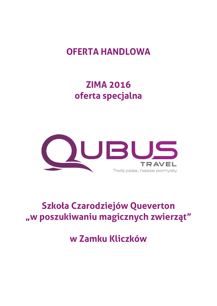 OFERTA HANDLOWA ZIMA 2016 oferta specjalna Szkoła Czarodziejów Queverton „w poszukiwaniu magicznych zwierząt” w Zamku Kliczków QT-02-09-OHZ/2015 oferta handlowa ZIMA 2016 imprez turystycznych organizowanych przez QUBUS Group Sp. z o.o., właściciela marki QUBUS Travel INFORMACJE DOTYCZĄCE WSZYSTKICH OFERT WYPOCZYNKU DZIECI I MŁODZIEŻY SZKOLNEJ ZNAJDUJĄCYCH SIĘ PONIŻEJ 1. Organizatorem Turystyki, i młodzieży szkolnej jest: posiadającym niezbędne uprawnienia do organizacji wypoczynku dzieci QUBUS Group Sp. z o.o. 40-208 Katowice, ul. Ścigały 10 NIP 954-274-52-73 REGON 243377021 KRS 0000477970 wpisana do Rejestru Organizatorów Turystyki i Pośredników Turystycznych Marszałka Województwa Śląskiego pod numerem 1016, posiadająca gwarancję ubezpieczeniową AXA Towarzystwa Ubezpieczeń i Reasekuracji S.A. w Warszawie, Departamentu Ubezpieczeń Turystycznych Oddziału Regionalnego w Katowicach, prowadząca działalność turystyczną pod nazwą QUBUS Travel. 2. 3. 4. 5. 6. Każda forma wypoczynku, organizowana przez QUBUS Group Sp. z o.o. z siedzibą w Katowicach jest rejestrowana w Śląskim Kuratorium Oświaty, a najpóźniej na 10 dni przed rozpoczęciem danej formy wypoczynku (danego turnusu) zaświadczenie o zarejestrowaniu turnusu jest udostępniane do wglądu dla Rodziców w siedzibie firmy lub przesyłane na życzenie Rodzica mailem na wskazany adres e-mail. Zgłoszenie wypoczynku do bazy wypoczynku, prowadzonej przez Ministra Edukacji Narodowej, można sprawdzić na stronie internetowej www.wypoczynek.men.gov.pl, wpisując odpowiednie dane dot. organizatora (woj. śląskie, powiat m.Katowice) oraz związane z miejscem wypoczynku. Informacje dotyczące transportu organizatora: miasta, z których organizowany jest transport na poszczególne formy wypoczynku, wpisane są do druku Umowy o świadczenie usług turystycznych. Miejsce oraz godzina zbiórki w danym mieście publikowane są na stronie internetowej www.queverton.pl najpóźniej na 7 dni przed rozpoczęciem turnusu – zawsze w zakładce „Strefa Rodzica”. Informacja zawiera również dane dotyczące środka transportu, trasy oraz osoby odpowiedzialnej, z ramienia organizatora, za przeprowadzenie transportu - jej imię, nazwisko oraz numer telefonu. Transport własny Rodzica: w dokumencie informujemy również Rodziców, niekorzystających z transportu organizatora, o której należy przywieźć dziecko do zamku w pierwszym dniu wypoczynku oraz o której należy dziecko odebrać w ostatnim dniu wypoczynku. Informacja dotycząca rozpoczęcia i zakończenia każdej formy wypoczynku (każdego turnusu): każdy turnus rozpoczyna się obiadem w pierwszym dniu turnusu, a kończy śniadaniem w dniu ostatnim, dodatkowo w ostatnim dniu uczestnik, korzystający z transportu organizatora, otrzymuje suchy prowiant na drogę powrotną (w postaci np.: bułki z serem, batonika 0,5 l wody mineralnej niegazowanej). Dokładne godziny pierwszego i ostatniego posiłku turnusu są publikowane w informacji transportowej najpóźniej na 7 dni przed rozpoczęciem danego turnusu. Przypominamy, że dzień pierwszy i ostatni przeznaczony jest na czynności organizacyjne, a nie właściwy wypoczynek. Informacja dotycząca kontaktu rodzica/prawnego opiekuna z uczestnikiem wypoczynku: rodzic/prawny opiekun może kontaktować się ze swoim dzieckiem (uczestnikiem wypoczynku) na telefon komórkowy dziecka w czasie, kiedy uczestnik przebywa w swoim pokoju (telefony komórkowe uczestnicy mają obowiązek pozostawiania w pokoju, za wyjątkiem wycieczek). Rodzic/prawny opiekun może kontaktować się ze swoim dzieckiem przez telefon służbowy kierownika turnusu w czasie posiłków, gdy wszyscy uczestnicy są w jednym miejscu. Rodzic/prawny opiekun może zasięgnąć informacji o swoim dziecku wyłącznie od kierownika turnusu o określonych godzinach. Numery telefonów poszczególnych wychowawców nie będą udostępniane. Numer telefonu kierownika turnusu oraz szczegółowe zasady kontaktu będą podane w informacji transportowej, która zostanie opublikowana najpóźniej na 7 dni przed rozpoczęciem danego turnusu – w zakładce „Strefa Rodzica” na stronie www.queverton.pl Niniejsza oferta handlowa stanowi integralną część Umowy o świadczenie usług turystycznych. 2 QT-02-09-OHZ/2015 oferta handlowa ZIMA 2016 imprez turystycznych organizowanych przez QUBUS Group Sp. z o.o., właściciela marki QUBUS Travel Drogi Rodzicu! Zanim podpiszesz Umowę, zapoznaj się z ofertą wybranej imprezy turystycznej (zimowiska), przedstaw ją dziecku i upewnij się, że mu się podoba. Następnie przeczytaj dokładnie Ogólne warunki uczestnictwa oraz Regulamin imprez turystycznych i przedyskutuj z dzieckiem punkty, które go dotyczą. Po podpisaniu Umowy wpłać zaliczkę w wysokości 300,00 zł, a pozostałą wymagalną kwotę na 21 dni przed turnusem. Pamiętaj o wysłaniu Karty Kwalifikacyjnej uczestnika! Dane do przelewu: QUBUS GROUP Sp. z o.o. 40-208 Katowice, ul. Ścigały 10 Numer konta bankowego: ALIOR BANK 11 2490 0005 0000 4600 5848 3177 w tytule: imię i nazwisko uczestnika oraz KOD turnusu __________________________________________________________________________________________________________ INFORMACJE DLA RODZICÓW KORZYSTAJĄCYCH Z DOFINANSOWANIA DO WYPOCZYNKU Z ZAKŁADOWEGO FUNDUSZU ŚWIADCZEŃ SOCJLANYCH I/LUB INNYCH DOFINANSOWAŃ Szanowni Rodzice uczestników niezwykłych kolonii, zimowisk i obozów w polskich zamkach! Przedstawiam informacje dla tych z Państwa, którzy korzystają z różnego rodzaju dofinansowań. 1. Organizator Turystyki QUBUS Group Sp. z o. o. z siedzibą w Katowicach wystawia zaświadczenia o udziale dziecka w zorganizowanym wypoczynku, jako że jest uprawnionym przedsiębiorcą do organizowania tego typu imprez turystycznych. 2. Zaświadczenia wydaje się na prośbę Rodzica, przesłanej mailem na adres [email protected]. Prośba powinna zawierać dokładne informacje, co ma znajdować się na zaś