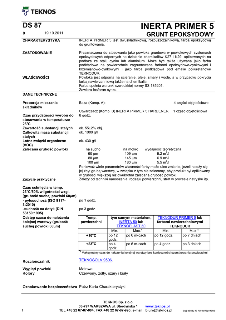 DS 87 8 INERTA PRIMER 5 19.10.2011 GRUNT EPOKSYDOWY CHARAKTERYSTYKA INERTA PRIMER 5 jest dwuskładnikową, rozpuszczalnikową, farbą epoksydową do gruntowania. ZASTOSOWANIE Przeznaczona do stosowania jako powłoka gruntowa w powłokowych systemach epoksydowych odpornych na działanie chemikaliów K27 i K29, aplikowanych na podłoża ze stali, cynku lub aluminium. Może być także używana jako farba podkładowa na powierzchnie zagruntowane farbami epoksydowo-cynkowymi i krzemianowo-cynkowymi i jako farba podkładowa pod emalie poliuretanowe TEKNODUR. Powłoka jest odporna na ścieranie, oleje, smary i wodę, a w przypadku pokrycia farbą nawierzchniową także na chemikalia. Farba spełnia warunki szwedzkiej normy SS 185201. Zawiera fosforan cynku. WŁAŚCIWOŚCI DANE TECHNICZNE Proporcja mieszania składników Czas przydatności wyrobu do stosowania w temperaturze 23oC Zawartość substancji stałych Całkowita masa substancji stałych Lotne związki organiczne (VOC) Zalecana grubość powłoki Zużycie praktyczne Baza (Komp. A): 4 części objętościowe Utwardzacz (Komp. B) INERTA PRIMER 5 HARDENER 8 godz. 1 część objętościowa ok. 55±2% obj. ok. 1000 g/l ok. 430 g/l na sucho na mokro wydajność teoretyczna 60 µm 109 µm 9.2 m2/l 80 µm 145 µm 6.9 m2/l 100 µm 180 µm 5.5 m2/l Ponieważ wiele parametrów własności farby może ulec zmianie, jeżeli nałoży się jej zbyt grubą warstwę, w związku z tym nie zalecamy, aby produkt był aplikowany w grubości większej niż dwukrotna zalecana grubość powłoki. Zależy od techniki nanoszenia, rodzaju powierzchni, strat w procesie natrysku itp. Czas schnięcia w temp. 23oC/50% wilgotności wzgl. (grubość suchej powłoki 60µm) po 1 godz. - pyłosuchość (ISO 91173:2010) po 3 godz. - suchość na dotyk (DIN 53150:1995) Odstęp czasu do nałożenia Temp. kolejnej warstwy (grubość powierzchni suchej powłoki 60µm) +10oC +23oC *) tym samym materiałem, TEKNODUR PRIMER 5 lub INERTA 50 lub farbami nawierzchniowymi TEKNOPLAST 50 TEKNODUR Min. Max.* Min. Max.* po 12 po 6 m-cach po 12 godz. po 7 dniach godz. po 4 po 6 m-cach po 4 godz. po 3 dniach godz. Maksymalny czas do nałożenia kolejnej warstwy bez konieczności szorstkowania powierzchni Rozcieńczalnik TEKNOSOLV 9506. Wygląd powłoki Kolory Matowa Czerwony, żółty, szary i biały Oznakowanie bezpieczeństwa Patrz Karta Charakterystyki 1 TEKNOS Sp. z o.o. 03-797 WARSZAWA ul. Sterdyńska 1 www.teknos.pl TEL +48 22 67-87-004; FAX +48 22 67-87-995; e-mail: [email protected] ciąg dalszy na następnej stronie INERTA-PRIMER 5 SPOSÓB STOSOWANIA Przygotowanie podłoża DS 87-8 strona 2 Usunąć z podłoża wszelkie zanieczyszczenia, które mogą niekorzystnie wpływać na proces przygotowania podłoża i malowania. Usunąć również rozpuszczalne w wodzie sole stosując odpowiednie metody. Powierzchnię należy oczyścić zależnie od rodzaju podłoża, jak niżej: Stal: Zgorzelinę i rdzę usunąć przy pomocy obróbki strumieniowo ściernej do uzyskania stopnia czystości Sa 21/2. Zszorstkowanie powierzchni cienkiej blachy poprawia adhezję do podłoża. Cynk: Konstrukcje stalowe ocynkowane zanurzeniowo na gorąco, które są eksploatowane w warunkach atmosferycznych można malować po omieceniu ścierniwem do uzyskania matowej powierzchni (SaS). Odpowiednie środki czyszczące to np.: tlenek glinu, naturalny piasek i kwarc. Nie zaleca się malowania konstrukcji ze stali ocynkowanej przeznaczonej do eksploatacji w zanurzeniu. Zaleca się nowe blachy ze stali ocynkowanej poddać omieceniu ścierniwem (SaS). Matowe, wysezonowane pod działaniem czynników atmosferycznych powierzchnie cynku można oczyścić środkiem myjącym PELTIPESU Aluminium: Powierzchnię należy oczyścić środkiem myjącym PELTIPESU. Powierzchnie, które będą eksploatowane w warunkach atmosferycznych, podobnie jak podłoża cynkowe, należy także zszorstkować przez lekkie omiecenie ścierniwem lub piaskowanie (AlSaS). Powierzchnie malowane nadające się do przemalowania: Wszelkie zanieczyszczenia, które mogą niekorzystnie wpływać na nakładanie farby (np. tłuszcze i sole), usunąć. Powierzchnia musi być czysta i sucha. Stare, pomalowane powierzchnie, które przekroczyły maksymalny odstęp czasu do nałożenia kolejnej warstwy należy zszorstkować. Uszkodzone fragmenty pomalowanej powierzchni należy przygotować do ponownego malowania zgodnie z wymaganiami stawianymi przez rodzaj podłoża i sposób renowacji. Czas i miejsce przygotowywania powinny być dobrane tak, ażeby powierzchnia przed malowaniem nie była brudna i wilgotna. Grunt do czasowej ochrony INERTA PRIMER 5 jest kompatybilny z gruntami KORRO E - epoksydowym, KORRO SE - epoksydowo - cynkowym i KORRO SS - krzemianowo cynkowym. Przygotowanie wyrobu Przygotowanie mieszanki: 4 części objętościowe bazy wymieszać dokładnie z 1 częścią objętościową utwardzacza. Składniki należy wymieszać dokładnie ze sobą w całej objętości naczynia. Przygotować tylko taką ilość farby, którą zużyje się w czasie krótszym niż czas przydatności do stosowania. Niedokładne wymieszanie lub nieprawidłowy stosunek składników są przyczyną nieprawidłowego utwardzania i pogorszenia się własności powłoki. Warunki podczas nakładania Powierzchnia do malowania musi być sucha. Temperatura otaczającego powietrza, malowanej powierzchni i farby powinna być powyżej +10oC, a wilgotność względna powietrza poniżej 80% zarówno podczas nanoszenia jak i w okresie schnięcia wyrobu. Nakładanie Farbę przed użyciem dokładnie wymieszać. Jeśli jest to wymagane rozcieńczyć TEKNOSOLV 9506. Farbę zaleca się nanosić natryskiem bezpowietrznym, bo tylko ta metoda pozwala na otrzymanie zalecanej grubości przy jednokrotnym malowaniu. Używać dyszy do natrysku bezpowietrznego o średnicy 0.013 - 0.018". Nanoszenie za pomocą pędzla jest dopuszczalne w przypadku napraw miejscowych i malowania małych powierzchni. Informac