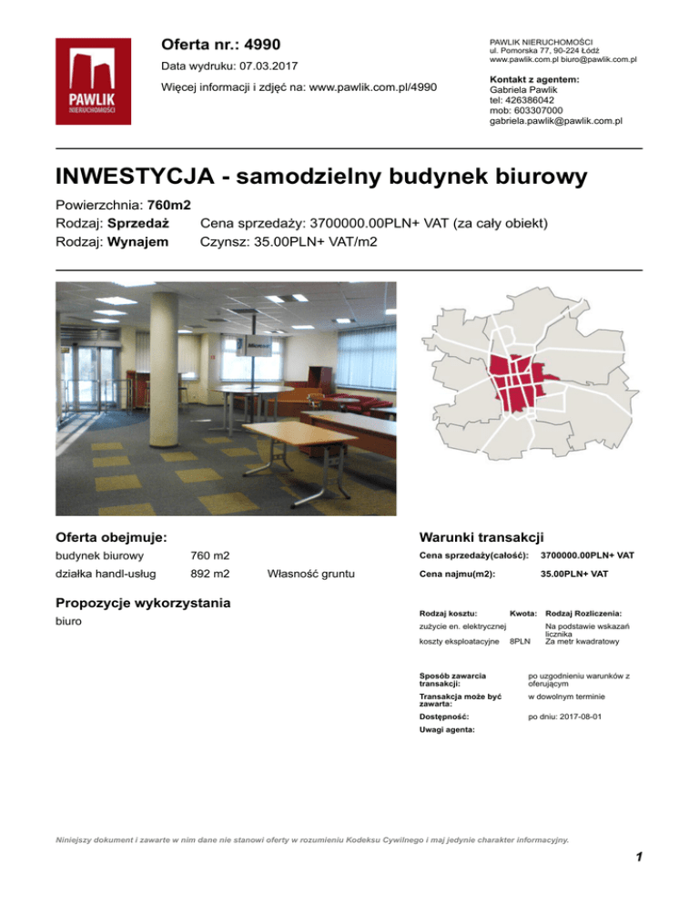 Oferta nr.: 4990 PAWLIK NIERUCHOMOŚCI ul. Pomorska 77, 90-224 Łódź www.pawlik.com.pl [email protected] Data wydruku: 07.03.2017 Więcej informacji i zdjęć na: www.pawlik.com.pl/4990 Kontakt z agentem: Gabriela Pawlik tel: 426386042 mob: 603307000 [email protected] INWESTYCJA - samodzielny budynek biurowy Powierzchnia: 760m2 Rodzaj: Sprzedaż Cena sprzedaży: 3700000.00PLN+ VAT (za cały obiekt) Rodzaj: Wynajem Czynsz: 35.00PLN+ VAT/m2 Oferta obejmuje: Warunki transakcji budynek biurowy 760 m2 działka handl-usług 892 m2 Propozycje wykorzystania biuro Własność gruntu Cena sprzedaży(całość): 3700000.00PLN+ VAT Cena najmu(m2): 35.00PLN+ VAT Rodzaj kosztu: Kwota: Rodzaj Rozliczenia: 8PLN Na podstawie wskazań licznika Za metr kwadratowy zużycie en. elektrycznej koszty eksploatacyjne Sposób zawarcia transakcji: po uzgodnieniu warunków z oferującym Transakcja może być zawarta: w dowolnym terminie Dostępność: po dniu: 2017-08-01 Uwagi agenta: Niniejszy dokument i zawarte w nim dane nie stanowi oferty w rozumieniu Kodeksu Cywilnego i maj jedynie charakter informacyjny. 1 Oferta nr.: 4990 Więcej informacji i zdjęć na: www.pawlik.com.pl/4990 Opis oferty Budynek świetnie zlokalizowany przy trasie z bardzo dobrą komunikacją:przystanek autobusowy i tramwajowy Teren wokół budynku jest ładnie zagospodarowany: parking wyłożony kostką oraz pasy zieleni. Na działce umieszczony jest podświetlany słup reklamowy, doskonale widoczny z ruchliwej trasy. Stolarka okienna PCV z szybami antywłamaniowymi P4 na wszystkich kondygnacjach. Budynek w pełni klimatyzowany ze sterowaniem odrębnym w 16 strefach i nadmuchem świeżego powietrza dla każdego pomieszczenia, z pełną automatyką. W pomieszczeniach biurowych wykładzina dywanowa z płyt Interface, antystatyczna (z certyfikatem IBM i odprowadzaniem ładunków). W pomieszczeniach sanitarnych i gospodarczych płytki ceramiczne. Budynek jest wyposażony w serwerownię, posiada rozprowadzoną komputerową sieć strukturalną, Internet - ISDN Parter: open-space, 1 pom biurowe, magazyn Ip.: 3 małe pom biurowe, 1 duże pom biurowe, serwerownia, kuchnia (zmywarka, okap, płyta elektryczna) z przestrzenią socjalną, toalety Iip.: 4 małe pom. Biurowe, 1 duże pom biurowe, sala konferencyjna, sala szkoleniowa. Oferta obejmuje budynek biurowy Klasa obiektu: B Powierzchnia: 760 m2 Stan techniczny: bardzo dobry Rodzaje powierzchni użytkowych Kondygnacja Rodzaj powierzchni Powierzchnia Liczba pomieszczeń Charakter powierzchni Powierzchnia Podłoga Standard Kondygnacja Ściana Sufit Okna Stan techniczny Budynek istniejący Rok budowy Opis techniczny Konstrukcja budynku: żelbetowa Budynek podpiwniczony Strop: żelbetowy Kondygnacja Rodzaj powierzchni Dostęp Powierzchnia Wysokość Siatka słupów Strop Wyposażenie Winda osobowa Wejście dla osób Wejście dla osób niepełnosprawnych Parking Witryna Niniejszy dokument i zawarte w nim dane nie stanowi oferty w rozumieniu Kodeksu Cywilnego i maj jedynie charakter informacyjny. 2 Oferta nr.: 4990 Więcej informacji i zdjęć na: www.pawlik.com.pl/4990 Bezpieczeństwo Alarm Monitoring Ochrona fizyczna Kontrola dostępu Lokal dostępny 24h Recepcja P-poż Instalacja sygnalizacji p-poż Teleinformatyka Telefon Sieć komputerowa Internet Podłoga techniczna Ogrzewanie/klimatyzacja Ogrzewanie Klimatyzacja Media Położenie Przyłącza elektryczne Sąsiedztwo Instalacja elektryczna Droga o dużym natężeniu ruchu Instalacja siłowa Położenie budynku Centrum Przylącza gazowe Rodzaj budynku biurowy Instalacja gazowa Dostęp do lokalu z ulicy Przyłącze wodne Dostęp do drogi publiczna Przyłącze kanalizacji sanitarnej działka handl-usług Powierzchnia: 892 m2 Rodzaje powierzchni użytkowych Powierzchnia m2 892 Kształt działki prostokąt Szerokość działki 40 Głębokość działki 20 Szczegóły działki Ukształtowanie terenu płaska Czy działka jest utwardzona? Tak Media Położenie Niniejszy dokument i zawarte w nim dane nie stanowi oferty w rozumieniu Kodeksu Cywilnego i maj jedynie charakter informacyjny. 3 Oferta nr.: 4990 Więcej informacji i zdjęć na: www.pawlik.com.pl/4990 Przyłącza elektryczne Droga utwardzona? Tak Przylącza gazowe Przyłącze wodne ZDJĘCIA OFERTY Niniejszy dokument i zawarte w nim dane nie stanowi oferty w rozumieniu Kodeksu Cywilnego i maj jedynie charakter informacyjny. 4 Oferta nr.: 4990 Więcej informacji i zdjęć na: www.pawlik.com.pl/4990 Niniejszy dokument i zawarte w nim dane nie stanowi oferty w rozumieniu Kodeksu Cywilnego i maj jedynie charakter informacyjny. 5 Oferta nr.: 4990 Więcej informacji i zdjęć na: www.pawlik.com.pl/4990 Niniejszy dokument i zawarte w nim dane nie stanowi oferty w rozumieniu Kodeksu Cywilnego i maj jedynie charakter informacyjny. 6 Oferta nr.: 4990 Więcej informacji i zdjęć na: www.pawlik.com.pl/4990 Niniejszy dokument i zawarte w nim dane nie stanowi oferty w rozumieniu Kodeksu Cywilnego i maj jedynie charakter informacyjny. 7