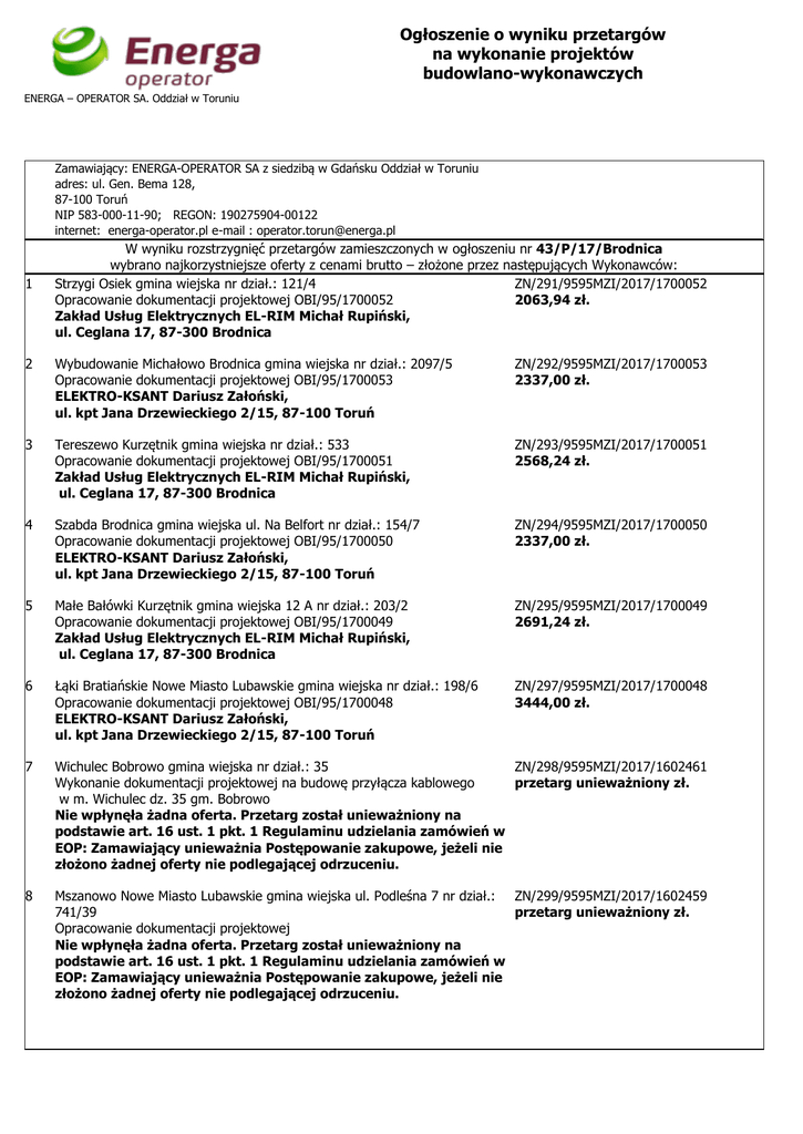 Ogłoszenie o wyniku przetargów na wykonanie projektów budowlano-wykonawczych ENERGA – OPERATOR SA. Oddział w Toruniu Zamawiający: ENERGA-OPERATOR SA z siedzibą w Gdańsku Oddział w Toruniu adres: ul. Gen. Bema 128, 87-100 Toruń NIP 583-000-11-90; REGON: 190275904-00122 internet: energa-operator.pl e-mail : [email protected] 1 W wyniku rozstrzygnięć przetargów zamieszczonych w ogłoszeniu nr 43/P/17/Brodnica wybrano najkorzystniejsze oferty z cenami brutto – złożone przez następujących Wykonawców: Strzygi Osiek gmina wiejska nr dział.: 121/4 ZN/291/9595MZI/2017/1700052 Opracowanie dokumentacji projektowej OBI/95/1700052 2063,94 zł. Zakład Usług Elektrycznych EL-RIM Michał Rupiński, ul. Ceglana 17, 87-300 Brodnica 2 Wybudowanie Michałowo Brodnica gmina wiejska nr dział.: 2097/5 Opracowanie dokumentacji projektowej OBI/95/1700053 ELEKTRO-KSANT Dariusz Załoński, ul. kpt Jana Drzewieckiego 2/15, 87-100 Toruń ZN/292/9595MZI/2017/1700053 2337,00 zł. 3 Tereszewo Kurzętnik gmina wiejska nr dział.: 533 Opracowanie dokumentacji projektowej OBI/95/1700051 Zakład Usług Elektrycznych EL-RIM Michał Rupiński, ul. Ceglana 17, 87-300 Brodnica ZN/293/9595MZI/2017/1700051 2568,24 zł. 4 Szabda Brodnica gmina wiejska ul. Na Belfort nr dział.: 154/7 Opracowanie dokumentacji projektowej OBI/95/1700050 ELEKTRO-KSANT Dariusz Załoński, ul. kpt Jana Drzewieckiego 2/15, 87-100 Toruń ZN/294/9595MZI/2017/1700050 2337,00 zł. 5 Małe Bałówki Kurzętnik gmina wiejska 12 A nr dział.: 203/2 Opracowanie dokumentacji projektowej OBI/95/1700049 Zakład Usług Elektrycznych EL-RIM Michał Rupiński, ul. Ceglana 17, 87-300 Brodnica ZN/295/9595MZI/2017/1700049 2691,24 zł. 6 Łąki Bratiańskie Nowe Miasto Lubawskie gmina wiejska nr dział.: 198/6 Opracowanie dokumentacji projektowej OBI/95/1700048 ELEKTRO-KSANT Dariusz Załoński, ul. kpt Jana Drzewieckiego 2/15, 87-100 Toruń ZN/297/9595MZI/2017/1700048 3444,00 zł. 7 Wichulec Bobrowo gmina wiejska nr dział.: 35 ZN/298/9595MZI/2017/1602461 Wykonanie dokumentacji projektowej na budowę przyłącza kablowego przetarg unieważniony zł. w m. Wichulec dz. 35 gm. Bobrowo Nie wpłynęła żadna oferta. Przetarg został unieważniony na podstawie art. 16 ust. 1 pkt. 1 Regulaminu udzielania zamówień w EOP: Zamawiający unieważnia Postępowanie zakupowe, jeżeli nie złożono żadnej oferty nie podlegającej odrzuceniu. 8 Mszanowo Nowe Miasto Lubawskie gmina wiejska ul. Podleśna 7 nr dział.: ZN/299/9595MZI/2017/1602459 741/39 przetarg unieważniony zł. Opracowanie dokumentacji projektowej Nie wpłynęła żadna oferta. Przetarg został unieważniony na podstawie art. 16 ust. 1 pkt. 1 Regulaminu udzielania zamówień w EOP: Zamawiający unieważnia Postępowanie zakupowe, jeżeli nie złożono żadnej oferty nie podlegającej odrzuceniu. Ogłoszenie o wyniku przetargów na wykonanie projektów budowlano-wykonawczych ENERGA – OPERATOR SA. Oddział w Toruniu 9 Brodnica Brodnica gmina miejska ul. Ustronie nr dział.: 3/1 ZN/300/9595MZI/2017/1602542 Opracowanie dokumentacji projektowej przetarg unieważniony zł. Przetarg został unieważniony na podstawie art. 16 ust. 2 pkt. 1 Regulaminu udzielania zamówień w EOP: Zamawiający unieważnia Postępowanie zakupowe, jeżeli cena najkorzystniejszej oferty przekracza kwotę jaką Zamawiający zamierza przeznaczyć na sfinansowanie Zamówienia. Sporządził(a): Marzena Kamińska Toruń, dnia 26-01-2017