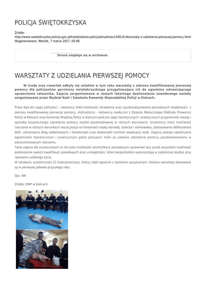 POLICJA ŚWIĘTOKRZYSKA Źródło: http://www.swietokrzyska.policja.gov.pl/kie/dzialania-policji/aktualnosci/18516,Warsztaty-z-udzielania-pierwszej-pomocy.html Wygenerowano: Wtorek, 7 marca 2017, 05:06 Strona znajduje się w archiwum. WARSZTATY Z UDZIELANIA PIERWSZEJ POMOCY W środę oraz czwartek odbyły się ostatnie w tym roku warsztaty z zakresu kwalifikowanej pierwszej pomocy dla policjantów garnizony świętokrzyskiego przygotowujące ich do egzaminu odnawiającego uprawnienia ratownika. Zajęcia zorganizowane w ramach lokalnego doskonalenia zawodowego zostały zorganizowane przez Wydział Kadr i Szkolenia Komendy Wojewódzkiej Policji w Kielcach. Przez dwa dni zajęć policjanci - ratownicy mieli możliwość utrwalenia oraz usystematyzowania posiadanych wiadomości z zakresu kwalifikowanej pierwszej pomocy. Instruktorzy - ratownicy medyczni z Zespołu Medycznego Oddziału Prewencji Policji w Kielcach oraz Komendy Miejskiej Policji w Kielcach podczas zajęć teoretycznych i praktycznych przypomnieli zasady i sposoby bezpiecznego udzielania pomocy osobie poszkodowanej w różnych warunkach. Uczestnicy mieli możliwość ćwiczenia w różnych warunkach resuscytacje na fantomach osoby dorosłej, dziecka i niemowlaka, zastosowania defibrylatora AED, udrażniania dróg oddechowych i tlenoterapii oraz doskonalili techniki ewakuacji osób. Zajęcia zostały zakończone egzaminem teoretycznym i praktycznym gdzie policjanci mieli za zadanie udzielenie pomocy poszkodowanemu w zainscenizowanym zdarzeniu. Takie zajęcia dla mundurowych to nie tylko możliwość recertyfikacji posiadanych uprawnień lecz przed wszystkim możliwość podnoszenia swoich kwalifikacji zawodowych oraz umiejętności, które bezpośrednio wykorzystają w codziennej służbie przy ratowaniu ludzkiego życia. W szkoleniu uczestniczyło 21 funkcjonariuszy, którzy zdali egzamin z wynikiem pozytywnym. Kolejne warsztaty planowane są w pierwszej połowie przyszłego roku. Opr. RM Źródło: KWP w Kielcach Ocena: 0/5 (0) Tweetnij