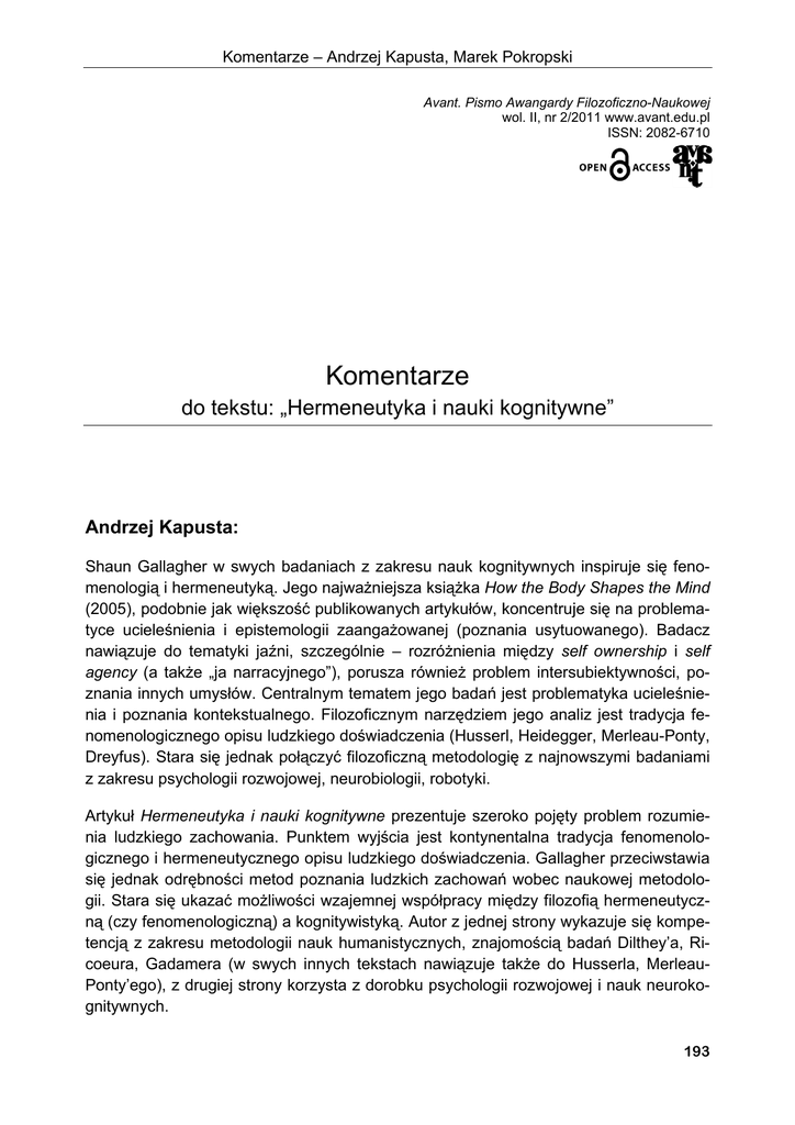 Komentarze – Andrzej Kapusta, Marek Pokropski Avant. Pismo Awangardy Filozoficzno-Naukowej Filozoficzno wol. II, nr 2/2011 www.avant.edu.pl ISSN: 2082-6710 2082 Komentarze Komentarz do tekstu: „Hermeneutyka i nauki kognitywne kognitywne” Andrzej Kapusta: Shaun Gallagher w swych badaniach z zakresu nauk kognitywnych inspiruje się s fenomenologią i hermeneutyką. Jego najwaŜniejsza ksiąŜka How the Body Shapes the Mind (2005), podobnie jak większość publikowanych artykułów, koncentruje się na problemaproblem tyce ucieleśnienia i epistemologii zaangaŜowanej (poznania usytuowanego). Badacz nawiązuje iązuje do tematyki jaźni, szczególnie – rozróŜnienia między self ownership i self agency (a takŜe „ja narracyjnego”), porusza równieŜ problem intersubiektywności, pop znania innych umysłów. Centralnym tematem jego badań jest problematyka ucieleśnieucieleśni nia i poznania poznania kontekstualnego. Filozoficznym narzędziem jego analiz jest tradycja fef nomenologicznego opisu ludzkiego doświadczenia (Husserl, Heidegger, Merleau-Ponty, Merleau Dreyfus). Stara się jednak połączyć filozoficzną metodologię z najnowszymi badaniami z zakresu psychologii psychologii rozwojowej, neurobiologii, robotyki. Artykuł Hermeneutyka i nauki kognitywne prezentuje szeroko pojęty problem rozumierozumi nia ludzkiego zachowania. Punktem wyjścia jest kontynentalna tradycja fenomenolofenomenol gicznego i hermeneutycznego opisu ludzkiego doświadczenia. doświadczenia. Gallagher przeciwstawia się jednak odrębności metod poznania ludzkich zachowań wobec naukowej metodolometodol gii. Stara się ukazać moŜliwości wzajemnej współpracy między filozofią hermeneutyczhermeneutyc ną (czy fenomenologiczną) a kognitywistyką. Autor z jednej strony strony wykazuje się kompekomp tencją z zakresu metodologii nauk humanistycznych, znajomością badań Dilthey’a, RiR coeura, Gadamera (w swych innych tekstach nawiązuje takŜe do Husserla, MerleauMerleau Ponty’ego), z drugiej strony korzysta z dorobku psychologii rozwojowej i nauk neurokoneurok gnitywnych. 193 AVANT Volume II, Number 2/2011 www.avant.edu.pl Gallagher niejako podąŜa drogą innego amerykańskiego filozofia Huberta Dreyfusa, który swego czasu dokonał krytyki teoretycznych załoŜeń teorii sztucznej inteligencji. Naukowcy, którzy juŜ w latach 60. mieli nadzieję na stworzenie inteligentnych robotów, z dystansem spoglądali na dotychczasowe dokonania filozofów, ich jałowe fotelowe dywagacje. JednakŜe, jak pokazał Dreyfus, a dzisiaj to czyni równieŜ Gallagher, empiryczne i techniczne modele sztucznej inteligencji równieŜ posiadają swoje (często błędne) filozoficzne załoŜenia. WaŜnym elementem tych dyskusji jest spór o pojęcie reprezentacji, o to, czy inteligentne istoty wymagają w swym działaniu i procesie uczenia się niezaleŜnych od kontekstu reprezentacji, wiedzy propozycjonalnej, „wiedzy-Ŝe” (w odróŜnieniu od „wiedzy-jak”). Gallagher, posiłkując się analizami Heideggera (w interpretacji Dreyfusa) i MerleauPonty’ego, postrzega ludzkie działanie jako głęboko zakorzenione w środowisku. Kontekst tła, który umoŜliwia poszczególne zdolności i wybory, nie dotyczy jedynie reaktywnych działań systemu, nie ogranicza się takŜe do wąsko pojętych celów, dobrze uporządkowanych zadań. Modele komputacyjne odwołujące się do reprezentacji i algorytmów są efektywne jedynie w ściśle określonych, precyzyjnych, przewidywalnych warunkach. Natomiast nasze codzienne doświadczenie charakteryzuje się niejednoznacznością i pragmatycznie uwikłanymi sytuacjami. Gallagher widzi relację kognitywistyki i hermeneutyki w sposób podobny do tego, w jaki wcześniej czynił to (wraz z Varelą) wobec fenomenologii. Obie perspektywy mogą się nawzajem uzupełniać i wzbogacać w dialektycznym wzajemnym „oświeceniu”. Ilustracją tej współpracy jest problem rozumienia innych osób. Badania neurokognitywne odwołujące się do neuronów lustrzanych mają przyczynić się do wyjaśnienia zjawiska empatii. Krytyczne badanie systemów lustrzanych pokazuje jednak ograniczone moŜliwości wyjaśnienia przez nie złoŜonego zjawiska intersubiektywności. Podejście hermeneutyczno-fenomenologiczne dostrzega szereg ograniczeń popularnych w psychologii i teorii umysłu koncepcji folk psychology (teorie teorii, teorie symulacji) i zastępuje je teorią interakcji. Samo podejście hermeneutyczne moŜe w oparciu o kognitywne i psychologiczne teorie zyskać nowe, lepsze wglądy w naturę procesu rozumienia. Bibliografia Gallagher, S. 2004. Hermeneutics and the Cognitive Sciences. Journal of Consciousness Studies, 11, No. 10–11. Gallagher, S. 2005. How The Body Shapes the Mind. Oxford University Press. 194 Komentarze – Andrzej Kapusta, Marek Pokropski Marek Pokropski: W artykule Hermeneutics and the Cognitive Sciences (2004) moŜna odnaleźć główne wątki filozofii nauk kognitywnych Shauna Gallaghera. Są to: krytyka komputacjonistycznej filozofii umysłu i metafory komputerowej, włączenie w obręb kognitywistyki elementów fenomenologii i hermeneutyki, krytyka pojęcia reprezentacji i podkreślenie roli ciała w procesach poznawczych. Myślą przewodnią zarówno tego artykułu, jak i innych publikacji Shauna Gallaghera jest odejście od kognitywistyki wyjaśniającej poznanie w abstrakcyjnych kategoriach obliczeniowych i przejście w stronę rozumienia poznania w kontekście cielesnej aktywności w świecie. W tym celu Gallagher odwołuje się do fenomenologii, głównie w wersji Husserla i Merleau-Ponty’ego, która to będąc metodycznym studium struktury doświadczenia, dostarcza niezbędnych do tego narzędzi. Gallagher w swojej koncepcji kognitywistyki z powodzeniem łączy podejście fenomenologiczne z najnowszymi wynikami badań empirycznych. Co więcej, według Gallaghera, fenomenologia moŜe w sposób znaczny wzmocnić proces prowadzenia takich badań. W tym