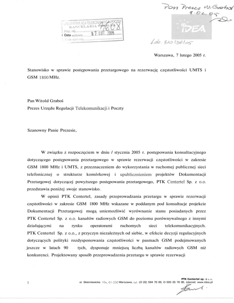 ufeo REGULACJI TELEKC "KANCELARIA i Oata wpływu U.x OS~ Warszawa, 7 lutego 2005 r. Stanowisko w sprawie postępowania przetargowego na rezerwację częstotliwości UMTS i GSM 1800 MHz. Pan Witold Graboś Prezes Urzędu Regulacji Telekomunikacji i Poczty Szanowny Panie Prezesie, W związku z rozpoczęciem w dniu l stycznia 2005 r. postępowania konsultacyjnego dotyczącego postępowania przetargowego w sprawie rezerwacji częstotliwości w zakresie GSM 1800 MHz i UMTS, z przeznaczeniem do wykorzystania w ruchomej publicznej sieci telefonicznej o strukturze komórkowej i upublicznieniem projektów Dokumentacji Przetargowej dotyczącej powyższego postępowania przetargowego, PTK Centertel Sp. z o.o. przedstawia poniżej swoje stanowisko. W opinii PTK Centertel, zasady przeprowadzania przetargu w sprawie rezerwacji częstotliwości w zakresie GSM 1800 MHz wskazane w poddanym pod konsultacje projekcie Dokumentacji Przetargowej mogą uniemożliwić wyrównanie stanu posiadanych przez PTK Centertel Sp. z o.o. kanałów radiowych GSM do poziomu porównywalnego z innymi działającymi na rynku operatorami ruchomych sieci telekomunikacyjnych. PTK Centertel Sp. z o.o., z przyczyn niezależnych od siebie, w efekcie decyzji regulacyjnych dotyczących polityki rozdysponowania częstotliwości w pasmach GSM podejmowanych jeszcze w latach 90 tych, dysponuje mniejszą liczbą kanałów radiowych GSM niż konkurenci. Projektowany sposób przeprowadzenia przetargu w sprawie rezerwacji PTK Centertel sp. z o.o. ul. Skierniewicka 10a, 01-230 Warszawa, tel: (O 22) 594 70 00, O 503 25 70 00, internet: www.idea.pl częstotliwości GSM 1800 MHz prowadzi bezpośrednio do utrwalenia i pogłębienia nierównoprawnych warunków prowadzenia działalności telekomunikacyjnej na rynku. PTK Centertel Sp. z o.o. występowała już od roku 1999 o uzyskanie rezerwacji dodatkowych częstotliwości GSM. PTK Centertel Sp. z o.o. przewidywała bowiem, że posiadana liczba kanałów radiowych w paśmie 1800 MHz będzie niewystarczająca do świadczenia usług telekomunikacyjnych z wykorzystaniem nowoczesnych technologii i na odpowiednio wysokim poziomie, w szczególności w momencie zwiększenia się ruchu telekomunikacyjnego w jej sieci w przypadku wdrożenia technologii EDGE/GPRS i uruchomienia usług w standardzie UMTS. W okresie od września do grudnia 2004 r. Prezes Urzędu Regulacji Telekomunikacji i Poczty wydał na rzecz PTK Centertel Sp. z o.o. 2 odmowne decyzje w sprawie rezerwacji 10 kanałów radiowych w paśmie 1800 MHz i 2 odmowne decyzje w sprawie rezerwacji 40 kanałów radiowych w paśmie 1800 MHz. Liczba kanałów radiowych w paśmie 1800 MHz, którymi w chwili obecnej zainteresowana jest PTK Centertel Sp. z o.o w celu utrzymania w najbliższej perspektywie właściwego poziomu usług telekomunikacyjnych wynosi 40. Z tego względu zasady udzielania rezerwacji częstotliwości zawarte w omawianej dokumentacji utrudniają PTK Centertel Sp. z o.o. przygotowanie oferty w postępowaniu przetargowym, prezentującej efektywny sposób wykorzystania wszystkich 99 kanałów radiowych w paśmie 1800 MHz. Niezrozumiałe jest podejście Prezesa URTiP, który zadecydował o przekazaniu wszystkich aktualnie dostępnych zasobów widma w paśmie 1800 MHz jednemu podmiotowi. Żadne analizy rynkowe nie potwierdzają, że taka liczba kanałów będzie w racjonalny i efektywny sposób zagospodarowana przez podmiot, który wygra przetarg. Liczba 99 kanałów w paśmie GSM 1800 MHz jest dwukrotnie większa od liczby kanałów radiowych, które posiadają dotychczasowi operatorzy telefonii komórkowej. Udzielenie rezerwacji całości opisanych powyżej zasobów częstotliwości na rzecz jednego podmiotu bez uprzedniej rzetelnej analizy jego planów dotyczących wykorzystania tych dóbr rzadkich, jest działaniem bardzo ryzykownym i szkodliwym dla operatorów działających obecnie na rynku. Dokonanie rezerwacji znacznie większej liczby kanałów dupleksowych niezbędnych dla świadczenia usług na rzecz jednego podmiotu, może prowadzić do przenoszenia przez ten podmiot uprawnień do zasobów na rzecz innych podmiotów prowadzących działalność na ? PTK Centertel sp. z o.o. ul. Skierniewicka l Oa, 01-230 Warszawa, tel: (O 22} 594 70 00, O 503 25 70 00, kiternet: www.idea.pl rynku. Takie rozwiązanie wydaje się szczególnie prawdopodobne w przypadku, gdy nowy podmiot nie będzie w stanie ich wykorzystać w ciągu kilku najbliższych lat. Może to również spowodować nierównowagę na rynku w przypadku zwycięstwa któregoś z obecnych operatorów telefonii komórkowej. Zaproponowany system pakietyzacji nie gwarantuje rozwoju rynku usług telekomunikacyjnych, a wprost przeciwnie, może go nawet na kilka lat zablokować. W opinii PTK Centertel Sp. z o.o., ilość przydzielonych kanałów radiowych w paśmie 1800 MHz nie powinna wynikać z decyzji Prezesa URTiP podjętej przed analizą ofert, ale winna być uwarunkowana projektami technicznymi zagospodarowania widma przedstawionymi przez oferentów. Uważamy, że każdy ma prawo do wystąpienia o rezerwację takiej liczby kanałów, jakiej potrzebuje do realizacji rozwoju usług dla klientów i wdrożenia nowych technologii. Możliwości pozyskania kanałów radiowych w paśmie GSM 1800 MHz nie zostają wyczerpane w ramach przedmiotowego postępowania przetargowego, a Prezes URTiP może uruchomić procedurę zwolnienia kolejnych zasobów, wykorzystywanych obecnie do innych celów. Jeżeli liczba kanałów GSM 1800 MHz, na które będzie uzasadnione zapotrzebowanie w ramach przetargu, przekroczy liczbę 99, będzie to właściwy moment, aby uruchomić procedurę zwalniania kolejnych zasobów. Niezrozumiała jest również logika i cel informacji wymaganych od oferenta w Dokumentacji Przetargowej. Regulator stawia pytania o te same zagadnienia z zakresu strategii rynku i strategii działań w punktach, które są wyznacznikami rożnych składowych oceny końcowej. Oznacza to, iż 