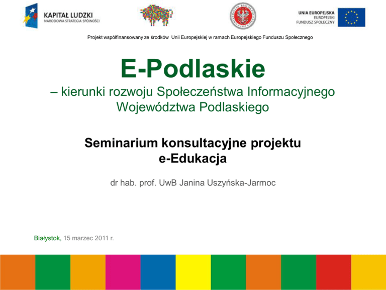 Projekt współfinansowany ze środków Unii Europejskiej w ramach Europejskiego Funduszu Społecznego E-Podlaskie – kierunki rozwoju Społeczeństwa Informacyjnego Województwa Podlaskiego Seminarium konsultacyjne projektu e-Edukacja dr hab. prof. UwB Janina Uszyńska-Jarmoc Białystok, 15 marzec 2011 r. Projekt współfinansowany ze środków Unii Europejskiej w ramach Europejskiego Funduszu Społecznego Część I. Własne doświadczenia: „od nauczania - przez uczenie się - do metauczenia się” […] „wiedzę można zdobywać na wiele sposobów, jednak dopiero osiąganie jej na własną rękę zapewnia uczącemu się prawdziwy sukces” […] Jerome Bruner, 2006 „W szkole spędzałem tysiące godzin ucząc się matematyki. Tysiące godzin poświęcałem na poznawanie języka i literatury [...] Potem zadałem sobie pytanie: ile godzin poświęciłem na naukę o tym, jak funkcjonuje moja pamięć? Ile na poznanie sposobu, w jaki działają moje oczy? Ile czasu uczyłem się, jak się uczyć? Ile o tym jak pracuje mój mózg? Ile godzin zaznajamiałem się z właściwościami myśli i tym, jak wpływają na ciało? A odpowiedź zawsze była taka sama: zero, zero, zero... Innymi słowy, właściwie wcale mnie nie nauczono, jak używać głowy” Tony Buzan, za: Dryden, Vos, 2000, s. 73 –75 Projekt współfinansowany ze środków Unii Europejskiej w ramach Europejskiego Funduszu Społecznego Czym jest edukacja? L. Witkowski (2000, s. 324-325) - edukacja jako klucz poszerzający obszar możliwych, przyszłych karier życiowych jednostki oraz sytuacji umożliwiających eksperymentowanie ról i poszerzanie potencjału społecznych interakcji. Z. Kwieciński (1999, s. 51) - edukacja jako całość warunków, procesów i czynności sprzyjających rozwojowi człowieka, tak, aby mógł sprostać złożonym wyzwaniom współczesnego świata. Projekt współfinansowany ze środków Unii Europejskiej w ramach Europejskiego Funduszu Społecznego Cel edukacji - rozwój człowieka Procesy dojrzewania Procesy uczenia się (nauczania) Rozwój człowieka Projekt współfinansowany ze środków Unii Europejskiej w ramach Europejskiego Funduszu Społecznego Uczenie się polega na: świadomym i nieuświadomionym zbieraniu doświadczeń poznawczych, społecznych i praktycznych; w sytuacjach zaplanowanych i niezaplanowanych; ich opracowywaniu (rekonstruowaniu i zdekonstruowaniu) i na ich podstawie konstruowaniu wiedzy o sobie samym i o świecie. Doświadczenia są źródłem wiedzy, umiejętności, postaw, systemu wartości. Projekt współfinansowany ze środków Unii Europejskiej w ramach Europejskiego Funduszu Społecznego Jak uczniowie zdobywają wiedzę i umiejętności? Uczenie się Doświadczenie Przekaz społeczny Refleksja Projekt współfinansowany ze środków Unii Europejskiej w ramach Europejskiego Funduszu Społecznego Jak uczniowie zdobywają wiedzę i umiejętności? Doświadczenie • Własne działania na przedmiotach • Osobiste kontakty z innymi ludźmi • Obserwacja działań innych ludzi Przekaz społeczny • Wiedza „przekazana” przez innych ludzi • Wiedza pochodząca ze źródeł pisanych • Wiedza z Internetu i innych mediów Refleksja • Samoocena i wgląd • Oceny i opinie pochodzące od ludzi • Oceny i opinie dotyczące ludzi • Własne „teorie” Projekt współfinansowany ze środków Unii Europejskiej w ramach Europejskiego Funduszu Społecznego Wiedza pewna jest równie szkodliwa, jak brak wiedzy w ogóle (konstruktywizm – poznawczy lub społeczny) Piaget, Wygotski, Bruner wiedza jest czasowo zdeterminowana, rozwojowa, kulturowo i społecznie uwarunkowana; wiedza istnieje zależnie od „tego, kto wie”; wiedza jest kategorią subiektywną; wiedza jest konstrukcją zbudowaną przez podmiot poznający, ale jest ona także konstruowana społecznie; wiedza nie składa się wyłącznie z faktów, zasad i teorii wyprowadzonych z obserwacji zjawisk i zdarzeń; wiedza to także zdolność wykorzystywania informacji w racjonalny sposób; wiedza to także uczucia i interpretacje; w organizacji procesu zdobywania wiedzy akcentuje się bardziej pojęcie „rozumienie” niż „wyjaśnianie”; każdy uczeń tworzy swoją osobistą, nową wiedzę w indywidualny sposób. Dlaczego warto promować metauczenie się uczniów? • Gospodarka oparta na wiedzy • Społeczeństwo ludzi uczących się przez całe życie POTRZEBY WYNIKI • Kompetencje uczenia się • Motywacja wewnętrzna • Poczucie kompetencji MOŻLIWOŚCI • Badania (Pillow, 2008; Bee, 2000; Ligęza, 2004); • Badania własne (2007; 2010); • ZADANIA, CELE • Cztery „filary edukacji” • Kompetencje kluczowe (umiejętność uczenia się) Projekt współfinansowany ze środków Unii Europejskiej w ramach Europejskiego Funduszu Społecznego Podstawowe dylematy: 1) Kategoria „nauczanie” czy kategoria „uczenie się”? zatem: behawioryzm czy konstruktywizm? 2) Kategoria „nauczanie” czy kategoria „uczenie się”? a konieczność LLL (Life Long Learning) Projekt współfinansowany ze środków Unii Europejskiej w ramach Europejskiego Funduszu Społecznego Podstawowe dylematy, cd. 3) Kategoria „nauczanie” czy kategoria „uczenie się”? a cztery filary edukacji: uczyć uczyć uczyć uczyć się, aby wiedzieć, się, aby działać, się aby żyć wspólnie się, aby być. Szerokie ujęcie kategorii: uczenie się człowieka Uczenie się jako cel – wyznacznik treści (uczyć się, jak się uczyć) Uczenie się jako strategia poznania - wyznacznik metod Uczenie się jako narzędzie poznania – wyznacznik typów uczenia się Poziom I. Odkrywanie sensu uczenia się Poziom II. Rozumienie wartości (sensu) własnego uczenia się Poziom III. Ustalenie własnych celów uczenia się CELE STRATEGIE Poziom I. Odkrywanie możliwych sposobów uczenia się Poziom II. Doświadczanie i rozumienie własnych sposobów uczenia się Poziom III. Świadome wykorzystywanie własnych strategii ucze