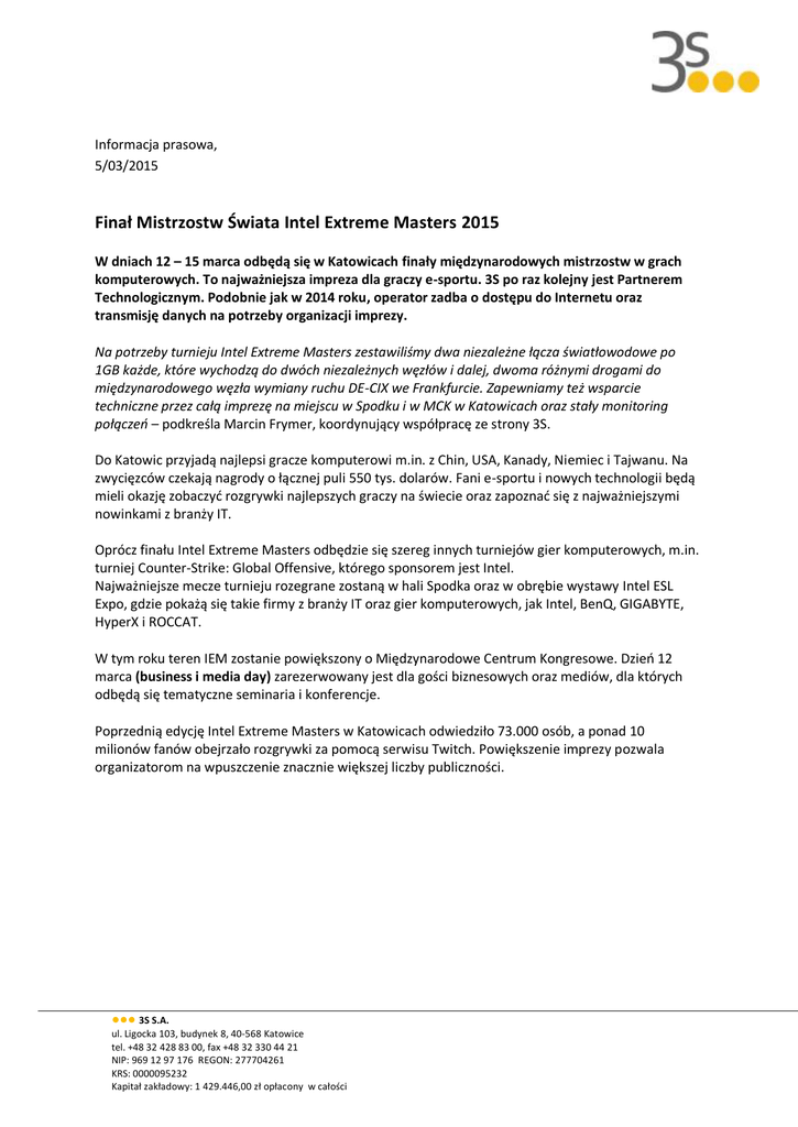 Informacja prasowa, 5/03/2015 Finał Mistrzostw Świata Intel Extreme Masters 2015 W dniach 12 – 15 marca odbędą się w Katowicach finały międzynarodowych mistrzostw w grach komputerowych. To najważniejsza impreza dla graczy e-sportu. 3S po raz kolejny jest Partnerem Technologicznym. Podobnie jak w 2014 roku, operator zadba o dostępu do Internetu oraz transmisję danych na potrzeby organizacji imprezy. Na potrzeby turnieju Intel Extreme Masters zestawiliśmy dwa niezależne łącza światłowodowe po 1GB każde, które wychodzą do dwóch niezależnych węzłów i dalej, dwoma różnymi drogami do międzynarodowego węzła wymiany ruchu DE-CIX we Frankfurcie. Zapewniamy też wsparcie techniczne przez całą imprezę na miejscu w Spodku i w MCK w Katowicach oraz stały monitoring połączeń – podkreśla Marcin Frymer, koordynujący współpracę ze strony 3S. Do Katowic przyjadą najlepsi gracze komputerowi m.in. z Chin, USA, Kanady, Niemiec i Tajwanu. Na zwycięzców czekają nagrody o łącznej puli 550 tys. dolarów. Fani e-sportu i nowych technologii będą mieli okazję zobaczyć rozgrywki najlepszych graczy na świecie oraz zapoznać się z najważniejszymi nowinkami z branży IT. Oprócz finału Intel Extreme Masters odbędzie się szereg innych turniejów gier komputerowych, m.in. turniej Counter-Strike: Global Offensive, którego sponsorem jest Intel. Najważniejsze mecze turnieju rozegrane zostaną w hali Spodka oraz w obrębie wystawy Intel ESL Expo, gdzie pokażą się takie firmy z branży IT oraz gier komputerowych, jak Intel, BenQ, GIGABYTE, HyperX i ROCCAT. W tym roku teren IEM zostanie powiększony o Międzynarodowe Centrum Kongresowe. Dzień 12 marca (business i media day) zarezerwowany jest dla gości biznesowych oraz mediów, dla których odbędą się tematyczne seminaria i konferencje. Poprzednią edycję Intel Extreme Masters w Katowicach odwiedziło 73.000 osób, a ponad 10 milionów fanów obejrzało rozgrywki za pomocą serwisu Twitch. Powiększenie imprezy pozwala organizatorom na wpuszczenie znacznie większej liczby publiczności. ●●● 3S S.A. ul. Ligocka 103, budynek 8, 40-568 Katowice tel. +48 32 428 83 00, fax +48 32 330 44 21 NIP: 969 12 97 176 REGON: 277704261 KRS: 0000095232 Kapitał zakładowy: 1 429.446,00 zł opłacony w całości