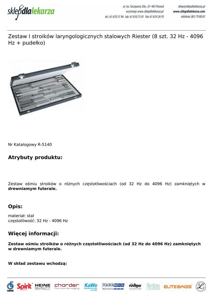 Zestaw I stroików laryngologicznych stalowych Riester (8 szt. 32 Hz - 4096 Hz + pudełko) Nr Katalogowy R-5140 Atrybuty produktu: Zestaw ośmiu stroików o różnych częstotliwościach (od 32 Hz do 4096 Hz) zamkniętych w drewniamym futerale. Opis: materiał: stal częstotliwość: 32 Hz - 4096 Hz Więcej informacji: Zestaw ośmiu stroików o różnych częstotliwościach (od 32 Hz do 4096 Hz) zamkniętych w drewniamym futerale. W skład zestawu wchodzą: 1. 2. 3. 4. 5. 6. 7. 8. 9. Powered by TCPDF (www.tcpdf.org) stroik laryngologiczny 32 Hz stalowy, stroik laryngologiczny 64 Hz stalowy, stroik laryngologiczny 128 Hz stalowy, stroik laryngologiczny 256 Hz stalowy, stroik laryngologiczny 512 Hz stalowy, stroik laryngologiczny 1024 Hz stalowy, stroik laryngologiczny 2048 Hz stalowy, stroik laryngologiczny 4096 Hz stalowy, drewniane pudełko podkreślające ekskluzywność zestawu.