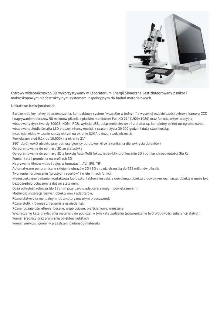 Cyfrowy wideomikroskop 3D wykorzystywany w Laboratorium Energii Słonecznej jest zintegrowany z mikro i makroskopowym niedestrukcyjnym systemem inspekcyjnym do badań materiałowych. Unikatowe funkcjonalności: Bardzo mobilny, łatwy do przenoszenia, kompaktowy system "wszystko w jednym" z wysokiej rozdzielczości cyfrową kamerą CCD i nagrywaniem obrazów 58 milionów pikseli, z płaskim monitorem Full HD 21" (1920x1080) oraz funkcją antywibracyjną; wbudowany dysk twardy 500GB, HDMI, RGB, wyjścia USB, połączenie sieciowe i z drukarką, kompletny pakiet oprogramowania, wbudowane źródło światła LED o dużej intensywności, z czasem życia 30 000 godzin i dużą stabilnością; Inspekcja wideo w czasie rzeczywistym na ekranie UXGA o dużej rozdzielczości; Powiększenie od 0,1x do 10.000x na ekranie 21” 360° obrót wokół obiektu przy pomocy głowicy obrotowej Hirox’a (unikalna dla wykrycia defektów) Oprogramowanie do pomiaru 2D ze statystyką Oprogramowanie do pomiaru 3D z funkcją Auto Multi fokus, jeden-klik-profilowanie 3D i pomiar chropowatości (Ra Rz) Pomiar kąta i promienia na profilach 3D Nagrywanie filmów video i zdjęć w formatach: AVI, JPG, TIF; Automatyczne panoramiczne sklejanie obrazów 2D i 3D z rozdzielczością do 225 milionów pikseli; Tworzenie i drukowanie “prostych raportów” i wiele innych funkcji; Niedestrukcyjne badanie: kontaktowa lub bezkontaktowa inspekcja dowolnego obiektu o dowolnym rozmiarze, obiektyw może być bezpośrednio połączony z dużym statywem; Duża odległość robocza (do 135mm przy użyciu adaptera z małym powiększeniem); Możliwość instalacji różnych obiektywów i adapterów; Różne statywy (z manualnym lub zmotoryzowanym przesuwem); Różne stoliki (również z transmisją oświetlenia); Różne rodzaje oświetlenia: boczne, współosiowe, pierścieniowe, mieszane Wyznaczanie kąta przylegania materiału do podłoża, w tym kąta zwilżenia (potwierdzenie hydrofobowości substancji stałych) Pomiar średnicy oraz promienia obiektów kulistych Pomiar wielkości porów w przestrzeni badanego materiału Strona CBI Pro-Akademia używa ciasteczek (cookies), dzięki którym nasz serwis może działać lepiej. Zobacz