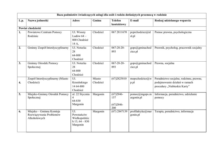 Baza podmiotów świadczących usługi dla osób i rodzin dotkniętych przemocą w rodzinie L.p. Nazwa jednostki Powiat chodzieski Powiatowe Centrum Pomocy 1. Rodzinie 2. Gminny Zespół Interdyscyplinarny 3. Gminny Ośrodek Pomocy Społecznej 4. 5. 6. Zespół Interdyscyplinarny (Miasto Chodzież) Miejsko-Gminny Ośrodek Pomocy Społecznej Miejsko – Gminna Komisja Rozwiązywania Problemów Alkoholowych Adres Gmina Telefon kontaktowy E-mail Rodzaj udzielanego wsparcia Ul. Wiosny Ludów 64 – 800 Chodzież 14 A, Ul. Notecka 28 64-800 Chodzież Ul. Notecka 28 64-800 Chodzież Ul. Krasińskiego 14 64-800 Chodzież ul. 22 Stycznia 4 64-830 Margonin Chodzież 067 2811670 pcprchodziez@id sl.pl Pomoc prawna, psychologiczna Chodzież 067-28-20893 gops@gminachod ziez.pl Prawnik, psycholog, pracownik socjalny Chodzież 067-28-20893 gops@gminachod ziez.pl Prawna, socjalna Miasto Chodzież (67)2825810 mopschodziez@w p.pl Poradnictwo socjalne, rodzinne, prawne, podejmowanie działań w ramach procedury „Niebieskie Karty” Margonin (67)2846157 [email protected] argonin.pl Informacja, poradnictwo, udzielanie pomocy Ul. Powstańców Wielkopolskic h 13, 64 – 830 Margonin Margonin (67)2846200 (67) 2847139 profilaktyka@mar gonin.pl Terapia, poradnictwo, informacja 7. Zespół Interdyscyplinarny 8. Punkt Konsultacyjny przy MGKRPA 9. Punkt Konsultacyjny przy GOPS 10. Gminny Zespół Interdyscyplinarny Powiat czarnkowsko-trzcianecki Powiatowe Centrum Pomocy 11. Rodzinie 12. Punkt Interwencji Kryzysowej 13. Zespół Interdyscyplinarny 14. Zespół Interdyscyplinarny 15. Gminny Zespół Interdyscyplinarny pl. Wolności 19 64-820 Szamocin, pl. Wolności 19 64-820 Szamocin, Ul. Lipowa 1 64-840 Budzyń Ul. Lipowa 1, 64-840 Budzyń Szamocin (67)2849138 mgops_szam@op. pl Szamocin (67)2849138 mgops_szam@op. pl - prawne, psychologiczne, socjalne - praca w grupach roboczych w ramach procedury NK Poradnictwo psychologiczne, rodzinne, terapeutyczne Budzyń 67 2844 350 [email protected] - pomoc psychologiczna, doradztwo Budzyń 67 2844 013 67 2843 058 [email protected] - zgodnie z ustawowymi kompetencjami ul. Mickiewicza 50, 64-980 Trzcianka Os. Słowackiego 24, 64 – 980 Trzcianka 64-733 Drawsko 64-733 Drawsko ul. Rybaki 3 64-700 Czarnków Trzcianka 660 492 034 [email protected] psychologiczna prawna Trzcianka 672 168 203 [email protected] Psychologiczna, prawna, socjalna, medyczna, terapeutyczna Drawsko 67/2569137 [email protected] Drawsko 67/2569137 [email protected] Podejmowanie działań w ramach procedury „Niebieskie Karty” Zgodnie z ustawą Czarnków 67 255 02 91 796 706 762 gops.czarnków@ op.pl socjalna prawna 16. 17. 18. 19. Gminny Punkt Konsultacyjny dla Uzależnionych, Współuzależnionych i Ofiar Przemocy Miejsko-Gminny Ośrodek Pomocy Społecznej w Wieleniu Miejsko-Gminny Ośrodek Pomocy Społecznej Miejski Ośrodek Profilaktyki i Promocji Zdrowia Powiat gnieźnieński Miejski Zespół Interdyscyplinarny 20. 21. Punkt Konsultacyjny 22. Powiatowe Centrum Pomocy Rodzinie 23. Zespół interdyscyplinarny os. Parkowe 10 64-700 Czarnków Wieleń ul. Międzyleska 4 Czarnków 67 255 66 08 ----------------- psychologiczna prawna Wieleń 067-2561359 mgopswielen@op .pl Zgodnie z ustawą o pomocy społecznej Ul. Poznańska 53 64-761 Krzyz Wlkp. Ul. Poznańska 53 64-761 Krzyż Wlkp. Krzyż Wlkp. (67)2564082 (67)2565795 mgopskrzyz@wp. pl Wsparcie emocjonalne, motywacyjne, socjalne. Krzyż Wlkp. Brak Brak Wsparcie terapeutyczne, grupa wsparcia dla ofiar przemocy ul. Dworcowa 7 62-200 Gniezno ul. Dworcowa 7 62-200 Gniezno Miasto Gniezno 61/4262582 wew.63 [email protected] zno.pl Poradnictwo specjalistyczne, terapeutyczne, korekcyjne, psychologiczne, rodzinne, Miasto Gniezno 61/4262582 wew.62 [email protected] zno.pl Poradnictwo psychologiczne, terapeutyczne, psychiatryczne Ul. Jana Pawła II 9/10 62-200 Gniezno ul. Kościuszki 35 62-240 Trzemeszno Gniezno [email protected] Program Korekcyjno-Edukacyjny dla sprawców przemocy domowej opstrzemeszno@serv -net.pl przeciwdziałania przemocy w rodzinie, udzielanie pomocy i wsparcia osobom pokrzywdzonym Trzemeszno (61) 4154165 24. Punkt konsultacyjny 25. Placówka Wsparcia Dziennego 26. Zespół Interdyscyplinarny 27. Zespół Interdyscyplinarny 28. Zespół Interdyscyplinarny 29. Zespół Interdyscyplinarny 30. 31. 32. 33. Zespół Interdyscyplinarny Punkt konsultacyjny Zespół Interdyscyplinarny w Łubowie Punkt Konsultacyjny ul. Langiewicza 2 62-240 Trzemeszno ul. Piastowska Trzemeszno brak - udzielanie pomocy i wsparcia osobom i rodzinom osób uzależnionych Trzemeszno brak ul. Polna 4, 62-230 Witkowo Witkowo wspieranie rodziny w zakresie pomocy w opiece i wychowaniu dzieci z rodzin przeżywających trudności w wypełnianiu funkcji opiekuńczo-wychowawczych -opracowanie i realizacja gminnego programu przeciwdziałania przemocy w rodzinie oraz ochrony ofiar przemocy w rodzinie, Poznańska 8 62-250 Czerniejewo Reymonta 2, 62-200 Gniezno Szkolna 2 62-280 Kiszkowo Słoneczna 25 62-270 Kłecko Gmina Czerniejewo Gmina Gniezno Gmina Kiszkowo (61) 4778491 opswitkowo@kon in.lm.pl Wsparcie specjalistów (członków zespołu) 0614291316 (61) 424-5768 gops.gniezno@w okiss.pl Podejmowanie działań w ramach procedury „Niebieskie Karty” Wsparcie specjalistów (członków zespołu) (61) 429-7018 [email protected] Gmina Kłecko 61 427-00-13 mgopsklecko@op .pl Słoneczna 25 62-270 Kłecko Gmina Kłecko 61 427-00-13 mgopsklecko@op .pl Łubowo 62-260 62-212 Mieleszyn 95 Gmina Łubowo Mieleszyn (61) 427-5947 61 429 50 66 [email protected] biuro@gopsmiele szyn.pl Udzielanie wsparcia i pomocy rodzinom doświadczającym przemocy w rodzinie Udzielanie pomocy i wsparcia specjalistów osobom z problemem alkoholowym oraz doświadczających przemocy w rodzinie Wsparcie specjalistów (członków zespołu Wsparcie terapeutyczne, psychologiczne 34. Zespół Interdyscyplinarny 35. Zespół Interdyscyplinarny 36. Punkt Konsultacyjny 37. Zespół Interdyscyplinarny 38. Punkt Konsultacyjny P