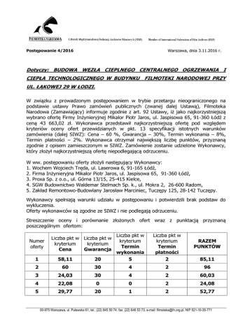Postępowanie 4/2016 Warszawa, dnia 3.11.2016 r. Dotyczy: BUDOWA WĘZŁA CIEPLNEGO CENTRALNEGO OGRZEWANIA I CIEPŁA TECHNOLOGICZNEGO W BUDYNKU FILMOTEKI NARODOWEJ PRZY UL. ŁĄKOWEJ 29 W ŁODZI. W związku z prowadzonym postępowaniem w trybie przetargu nieograniczonego na podstawie ustawy Prawo zamówień publicznych (zwanej dalej Ustawą), Filmoteka Narodowa (Zamawiający) informuje zgodnie z art. 92 Ustawy, iż jako najkorzystniejszą wybrano ofertę Firmy Inżynieryjnej Mikalor Piotr Jaros, ul. Jaspisowa 65, 91-360 Łódź z ceną 43 663,02 zł. Wykonawca przedstawił najkorzystniejszą ofertę pod względem kryteriów oceny ofert przewidzianych w pkt. 13 specyfikacji istotnych warunków zamówienia (dalej SIWZ): Cena – 60 %, Gwarancja – 30%, Termin wykonania – 8%, Termin płatności – 2%. Wykonawca otrzymał największą liczbę punktów, przyznaną zgodnie z opisem zamieszczonym w SIWZ. Zamówienie zostanie udzielone Wykonawcy, który złożył najkorzystniejszą ofertę niepodlegającą odrzuceniu. W ww. postępowaniu oferty złożyli następujący Wykonawcy: 1. Wochem Wojciech Tręda, ul. Laserowa 6, 91-165 Łódź, 2. Firma Inżynieryjna Mikalor Piotr Jaros, ul. Jaspisowa 65, 91-360 Łódź, 3. Proxa Sp. z o.o., ul. Górna 13/15, 25-415 Kielce, 4. SGW Budownictwo Waldemar Stelmach Sp. k., ul. Mokra 2, 26-600 Radom, 5. Zakład Remontowo-Budowlany Jarosław Marciniec, Tuczępy 125, 28-142 Tuczępy. Wykonawcy spełniają warunki udziału w postępowaniu i potwierdzili brak podstaw do wykluczenia. Oferty wykonawców są zgodne ze SIWZ i nie podlegają odrzuceniu. Streszczenie oceny i porównanie złożonych ofert wraz z punktacją przyznaną poszczególnym ofertom: 1 58,11 20 Liczba pkt w kryterium Termin wykonania 5 2 60 30 4 2 96 3 24,03 30 4 2 60,03 4 22,08 0 0 2 24,08 5 29,77 20 1 2 52,77 Numer oferty Liczba pkt w Liczba pkt w kryterium kryterium Cena Gwarancja Liczba pkt w kryterium Termin płatności 2 RAZEM PUNKTÓW 85,11 00-975 Warszawa, ul. Puławska 61, tel.: (22) 845 50 74, fax: (22) 646 53 73, e-mail: [email protected], NIP 521-10-35-771 Punktacja w kryterium „Cena” została przyznana na podstawie wzoru matematycznego umieszczonego w SIWZ: Oferta najkorzystniejsza cenowo Cena oferty analizowanej X 60 pkt. Punktacja w kryterium „Gwarancja” została przyznana na podstawie ofertowego zobowiązania Wykonawcy. Za udzielenie gwarancji na okres dłuższy niż 24 miesięcy (wymagany), Wykonawca otrzymał 5 pkt. za każde 3 miesiące gwarancji ponad okres wymagany, nie więcej jednak niż 30 pkt. Punktacja w kryterium „Termin wykonania” została przyznana na podstawie ofertowego zobowiązania Wykonawcy. Wykonawca, który zobowiązał się wykonać zamówienie w terminie krótszym niż wymagany (9.12.2016 r.) otrzymał 1 pkt za skrócenie terminu wykonania o 2 dni kalendarzowe, nie więcej niż 8 pkt. Punktacja w kryterium „Termin płatności” została przyznana na podstawie ofertowego zobowiązania Wykonawcy. Wykonawca, który zaproponował termin płatności 30 dni otrzymał – 2 punkty. Zamawiający, zgodnie z art. 94 ust. 1 pkt. 2 Ustawy, zamierza zawrzeć umowę w sprawie udzielenia zamówienia publicznego w terminie 10 dni od dnia przesłania niniejszego zawiadomienia o wyborze najkorzystniejszej oferty (wartość zamówienia jest mniejsza niż kwoty określone w przepisach wydanych na podstawie art. 11 ust. 8 Ustawy). Umowa zostanie zawarta najwcześniej w dniu 15.11.2016 r. Zawiadomienia o wyborze oferty najkorzystniejszej i wyniku postępowania zostały przesłane pocztą. 2