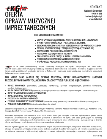 KONTAKT OFERTA OPRAWY MUZYCZNEJ IMPREZ TANECZNYCH Wojciech Zwierniak 505 616 363 [email protected] www.ekgband.pl EKG MUSIC BAND GWARANTUJE MUZYKĘ WYKONYWANĄ W PEŁNI NA ŻYWO, W ORYGINALNYCH ARANŻACJACH WYSOKI POZIOM WYKONAWCZY I PROFESJONALNE BRZMIENIE SZEROKI I ELASTYCZNY REPERTUAR, DOSTOSOWYWANY DO PREFERENCJI KLIENTA OBSŁUGĘ KONFERANSJERSKĄ Z OPCJĄ DWUJĘZYCZNĄ (JĘZYK ANGIELSKI) INDYWIDUALNE PODEJŚCIE DO KAŻDEGO WYSTĘPU NIENAGANNĄ KULTURĘ OSOBISTĄ MUZYKÓW OTWARTOŚĆ NA WSPÓŁPRACĘ Z KLIENTEM I UCZESTNIKAMI IMPREZY PROFESJONALNE I NIEZAWODNE ZAPLECZE SPRZĘTOWE WSPÓŁPRACĘ Z PROFESJONALNYMI MUZYKAMI I DJ-AMI to w pełni profesjonalny zespół coverowy działający na rynku muzycznym od 2008 roku. Projekt tworzą zawodowi muzycy posiadający wieloletnie doświadczenie sceniczne i medialne, mający na swoim koncie wiele prestiżowych występów zarówno w Polsce, jak i zagranicą, oraz współpracę z wybitnymi postaciami światowych scen muzycznych. EKG MUSIC BAND ZAJMUJE SIĘ OPRAWĄ MUZYCZNĄ IMPREZ ORGANIZOWANYCH ZARÓWNO PRZEZ KLIENTÓW PRYWATNYCH, JAK I FIRMY ORAZ INSTYTUCJE PUBLICZNE, MIĘDZY INNYMI: IMPREZ FIRMOWYCH (bankietów, jubileuszy, konferencji, spotkań integracyjnych, pikników firmowych, spotkań świątecznych) BALÓW OKOLICZNOŚCIOWYCH (prywatek, dancingów, balów ostatkowych / sylwestrowych / studniówkowych) IMPREZ TEMATYCZNYCH / FABULARYZOWANYCH IMPREZ SPORTOWO-REKREACYJNYCH PREZENTACJI / WYSTAW / WERNISAŻY EVENTÓW O CHARAKTERZE MARKETINGOWYM (pokazów mody, prezentacji barmańskich, działań promocyjnych) WYDARZEŃ KULTURALNYCH (festynów, pikników, dni miast) Zespół współpracował już z takimi firmami jak Vattenfall, Siemens, Asseco Business Solutions, JC Academy, MTE, Intergo, Dart Pol, Forever Living Products, Alfa Wassermann. Podstawą występów realizowanych przez EKG Music Band jest muzyka coverowa wykonywana przez pięciu muzyków, prezentowana na najwyższym poziomie i całkowicie na żywo. Dla osób gustujących w bardziej urozmaiconych i rozbudowanych brzmieniach zespół przygotował także ekskluzywną i awangardową w branży ofertę współpracy z profesjonalnym DJ-em oraz zawodową sekcją dętą. Atutem wyróżniającym EKG Music Band spośród innych zespołów coverowych jest przede wszystkim elastyczność, dlatego też program występów może równie dobrze przybrać charakter tematyczny, jak i może on zostać oparty na doborze utworów o różnorodnej stylistyce – nawet najbardziej wymagający repertuar wykonywany jest Strona 1 / 12 z największą dbałością o utrzymywanie wiernego oryginałom brzmienia. Możliwe jest to nie tylko dzięki umiejętnościom oraz doświadczeniu zdobywanym przez lata kształcenia muzycznego i pracy scenicznej, ale również dzięki profesjonalnemu zapleczu sprzętowemu, które stanowi gwarancję, że każda impreza z zespołem EKG Music Band zyska charakter niezapomnianego wydarzenia dźwiękowo-wizualnego. EKG Music Band to doskonały wybór oprawy muzycznej każdego wydarzenia, któremu towarzyszy muzyka. Strona 2 / 12 SKŁAD ZESPOŁU MONIKA POLAK wokal, konferansjerka Absolwentka amerykanistyki. Umiejętności wokalne rozwijała w jednej z krakowskich szkół muzycznych, w klasie wokalnej Kamila Kuźnika. Pod kierunkiem wokalistów - pedagogów: Pauliny Kujawskiej, Justyny Motylskiej oraz Deana Kaelina, doskonaliła warsztat technikami SLS oraz MIX. Miłośniczka czarnej muzyki. Uczestniczka V edycji The Voice Of Poland. Współpracuje z licznymi składami muzycznymi, poruszając się w stylistykach funky-pop-jazz. WOJCIECH ZWIERNIAK instrumenty klawiszowe, saksofon, wokal, konferansjerka Absolwent Akademii Muzycznej w Katowicach. Występował w Polsce, Niemczech, Holandii, na Ukrainie, Węgrzech i we Włoszech. Wraz z kwartetem Saxpasja został zwycięzcą międzynarodowego konkursu jazzowego Złota Tarka 2010. Występował na takich festiwalach jak Debiuty 2008, Zakopiańska Wiosna Jazzowa, Jazz Bez, Jazz Nad Nilem, Jazz Baszta, RockAutostrada, GoRock, Wake Up And Live, Rock In Mińsk, Przebojem Na Antenę. Ma za sobą liczne występy radiowe i telewizyjne z grupą Skafander. JAKUB NIEĆ gitara elektryczna, wokal Absolwent architektury wnętrz krakowskiej Akademii Sztuk Pięknych. Pasję gry na gitarze rozwija od 10 roku życia, czynnie udzielając się w małopolskim środowisku muzycznym. Laureat wielu konkursów gitarowych. Obecnie zaangażowany w zespoły Lachersi oraz BleBle, dawniej członek grupy Inside. Indywidualista, marzyciel, esteta. Zainteresowania: muzyka, architektura, design, malarstwo, grafika, street art. MACIEJ NIEĆ gitara basowa, wokal, konferansjerka Absolwent Akademii Muzycznej w Katowicach. Współtwórca folkrockowego zespołu Lachersi (finaliści V edycji Must Be The Music). Współpracował z Kapelą Pieczarki, sądecką formacją BleBle, zespołem dziecięcym Promyczki Dobra i wieloma innymi składami. W 2008 roku wystąpił w konkursie Debiuty jako basista zespołu Alkaline. Ma za sobą wiele nagrań studyjnych oraz występów w programach telewizyjnych takich jak Kawa czy herbata, WOŚP. RADOSŁAW KULIŚ instrumenty perkusyjne, wokal Absolwent Państwowej Szkoły Muzycznej oraz Akademii Sztuk Pięknych w Poznaniu. Występował z wykonawcami takimi jak Mieczysław Szcześniak, Antonina Krzysztoń, Beata Bednarz, Ewa Uryga, Jorgos Skolias, Marcin Pospieszalski, Joachim Mencel, zespół Krywań. Koncertował na Ukrainie, Słowacji, Węgrzech, w Czechach, Niemczech, Danii, Rosji i we Włoszech. Uczestniczył w prezentacjach na Międzynarodowych Targach EXPO 2000 oraz obchodach Jubileuszu 2000 w Rzymie. Z zespołem Alkaline wystąpił w opolskich Debiutach w 2008 roku. Obecnie współpracuje z klezmerskim zespołem Jarmuła Band folkową grupą Rzoz i dziecięcym chórem Promyczki Dobra. Uczestniczył w wielu produkcjach płytowych oraz programach telewizyjnych takich jak Kawa Czy Herbata, Między Niebem A Ziemią, Od Przedszkola Do Opola, Szan