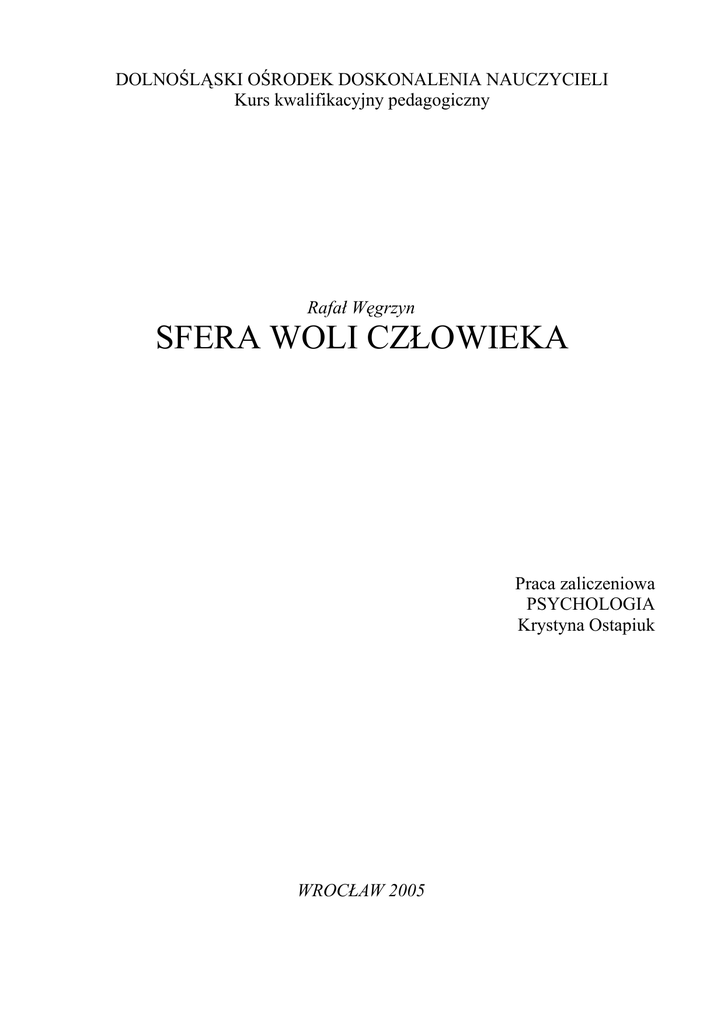 DOLNOŚLĄSKI OŚRODEK DOSKONALENIA NAUCZYCIELI Kurs kwalifikacyjny pedagogiczny Rafał Węgrzyn SFERA WOLI CZŁOWIEKA Praca zaliczeniowa PSYCHOLOGIA Krystyna Ostapiuk WROCŁAW 2005 Wola, obok myślenia i czucia, to trzeci najmniej poznany element Wnętrza Człowieka. Wnętrzem Człowieka nazywam tu tą przestrzeń, która od dawien dawna zwana była duszą ludzką, a o którą ociera się psychologia akademicka. Z otarć tych tworzy ona dalej aparat pojęciowy, za pomocą którego to stara się z kolei opisać i wyjaśnić człowieka. Z logicznego punktu widzenia kwestionuje to zatem powagę nauki zwanej psychologią, bo skoro nie ma odwagi badać duszy ludzkiej zaprzeczając jej istnieniu, to jednak tworzy pewien opis człowieka jako odbicie tej duszy, czyli czegoś, czego nie potrafi uchwycić, ponieważ nie uznaje jego istnienia. Innymi słowy psychologia nie dostrzega duszy ludzkiej i sugeruje, by nie uznawać jej istnienia pod groźbą braku naukowości, ale nakazuje uznać za realny opis dokonany na podstawie obserwacji „tego czegoś zwanego psychiką” (nie przypadkiem psyche z greckiego to dusza). Jako pedagog nie pozostający w kleszczach tzw. obiektywizmu naukowego chciałbym tutaj dokonać innego opisu Duszy Ludzkiej. Mam nadzieję, że przyczyni się on do innego spojrzenia na kwestię zaburzeń w sferze woli, która, jak zostało to nadmienione, pozostaje najmniej poznanym obszarem. Z drugiej strony jałowość sporu „Dusza – jest czy jej nie ma” proponuję zastąpić wnikliwą obserwacją rozwijającego się Człowieka. Jałowość owego „czy jest Dusza” bierze się z maniakalnej wręcz, obsesyjnej skłonności patrzenia na człowieka tylko za pomocą kanałów zmysłowych – tzn. przyjmujemy istnienie człowieka, o ile jesteśmy w stanie go zobaczyć, dotknąć, zmierzyć, zwarzyć etc. Spojrzenie, na którym bazuje moja praca umyślnie porzuca takie redukcjonistyczne patrzenie i chce widzieć Człowieka przez inny pryzmat nazwę go trójdzielną aktywnością Człowieka (czerpię tu inspirację z pedagogiki waldorfskiej). Owe trzy fundamentalne aktywności Człowieka mówią bowiem bardzo obrazowo o jego istocie. Wola – Czucie – Myślenie spojrzenie fundamentalne Z chwilą narodzin dziecka, pierwszego krzyku, następuje coś niebywałego! Oto dotąd połączone pępowiną z matką, samoistne, ale nie samodzielne, uzyskuje ją nagle po poprzez przecięcie tej pępowiny. Reakcją dziecka jest krzyk. Czym jest ta reakcja? Narodzoną Wolą. Narodziny człowieka zwykliśmy określać przez pryzmat ciała fizycznego. Ale przecież to ciało fizyczne istniało przed narodzinami – narodziny niczego tu nie zmieniły. To, co się rzeczywiście rodzi w tym dramatycznym i pięknym momencie to Wola Człowieka. Jeśli spojrzymy na noworodka pod tym kątem, pod kątem Narodzonej Woli, ujrzymy jej aktywność, jej realność. Czucie (w tym sfera zmysłowych dyspozycji) takiego noworodka jest bardzo ograniczone, a o myśleniu w sensie kartezjańskiego cogito ergo sum nie ma co nawet wspominać. Wola w noworodku, niemowlęciu czy potem w dziecku najmłodszym jest jego najbardziej widoczną aktywnością. Każdy kto zechce może w kąpiącym się maluchu, kiedy to siedząc w wanience z ciepłą wodą daje wyraz swojemu zadowoleniu poprzez chlapanie, uderzanie rączkami w wodę, zobaczyć obraz czystej Woli - nie ma tam nic z myślenia – jest to czysta Wola, manifestacja Woli! Czucie takiego dziecka również nie jest specjalnie zróżnicowane – odczuwa ono przyjemność nie osiągając jednak za pomocą myśli przyczyn tego zadowolenia. Trójdzielna aktywność Człowieka 100,00% 90,00% 80,00% 70,00% 60,00% 50,00% Myślenie Czucie Wola 40,00% 30,00% 20,00% 10,00% 0,00% Rys. 1: Graficzne odzwierciedlenie stopnia trójdzielnej aktywności niemowlęcia Niemal całą istotę dziecka przepaja tu Wola, która w żaden sposób nie jest ograniczana od wewnątrz. Obok zarysowuje się sfera Uczuć, natomiast Myślenie wydaje się być uśpione. Dziecko rozwija się jednak dalej. Stopniowo coraz bardziej pogłębiają się i różnicują jego uczucia (odczucia). Najwięcej powiedzieć o tym mogą wnikliwe i świadome matki, które patrząc na oblicza swoich rozwijających się maleństw dostrzegają ten zdumiewający rozwój, to przepiękne rozwijanie się małej istoty ludzkiej w kierunku coraz większej świadomości oraz coraz bogatszego odczuwania. Jak widzielibyśmy zatem 3-letnie dziecko w takim spojrzeniu? Trójdzielna aktywność Człowieka 100,00% 90,00% 80,00% 70,00% 60,00% 50,00% Myślenie Czucie Wola 40,00% 30,00% 20,00% 10,00% 0,00% Rys. 2: Graficzne odzwierciedlenie stopnia trójdzielnej aktywności 3 letniego dziecka Wola również i tu dominuje lecz wyrasta jej tu mocny konkurent – Czucie. Myślenie choć nieporównanie mocniejsze niż u niemowlęcia nie daje jeszcze świadectwa swojej siły. W życiu dziecka 3-4 letnie następuje w tym okresie coś bardzo ważnego – pójście do przedszkola. Oto dziecko dotąd będące samo, któremu przychylano nieba wedle jego woli (dosłownie!) w przedszkolu spotyka się z innymi dziećmi. Jego własne, najważniejsze „Ja” zostaje skonfrontowane z „Ja” innych dzieci. Pojawia się również Pani Przedszkolanka, która zajmuje się wszystkim tymi „Ja”, a nie tylko jednym jak to było w przypadku mamy. Myślę, że możemy w takiej perspektywie sytuacji w grupie przedszkolnej dostrzec jak najbardziej pozytywne stymulatory rozwoju i sfery Uczuć (ogólnie określanym jako socjalizacją) oraz sfery Myślenia (dlaczego są jeszcze inne dzieci, dlaczego Pani nie zajmuje się tylko mną? Dlaczego....). Co jednak dzieje się z Wolą? Dotąd niczym nie krepowana Wola (bycia jedynym, robienia czego się chce, wszelkie pragnienia, bezrefleksyjna aktywność) zostaje uchwycona (jeśli przedszkolanką jest mądra nauczycielka) refleksją, zasadami – np.: „nie możesz zabierać komuś jego zabawki!”, albo np.: „nie