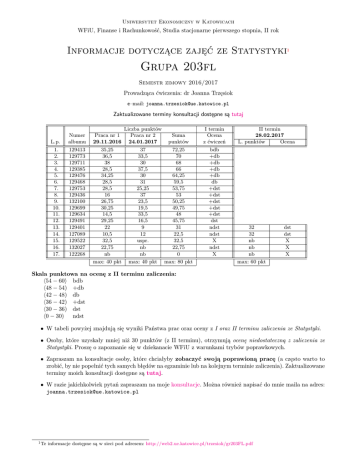 Uniwersytet Ekonomiczny w Katowicach WFiU, Finanse i Rachunkowość, Studia stacjonarne pierwszego stopnia, II rok Informacje dotyczące zajęć ze Statystyki1 Grupa 203fl Semestr zimowy 2016/2017 Prowadząca ćwiczenia: dr Joanna Trzęsiok e–mail: [email protected] Zaktualizowane terminy konsultacji dostępne są tutaj L.p. 1. 2. 3. 4. 5. 6. 7. 8. 9. 10. 11. 12. 13. 14. 15. 16. 17. Numer albumu 129413 129773 129711 129385 129476 129468 129753 129436 132100 129699 129634 129491 129401 127089 129522 132027 122268 Praca nr 1 29.11.2016 35,25 36,5 38 28,5 34,25 28,5 28,5 16 26,75 30,25 14,5 29,25 22 10,5 32,5 22,75 nb max: 40 pkt Liczba punktów Praca nr 2 Suma 24.01.2017 punktów 37 72,25 33,5 70 30 68 37,5 66 30 64,25 31 59,5 25,25 53,75 37 53 23,5 50,25 19,5 49,75 33,5 48 16,5 45,75 9 31 12 22,5 uspr. 32,5 nb 22,75 nb 0 max: 40 pkt max: 80 pkt I termin Ocena z ćwiczeń bdb +db +db +db +db db +dst +dst +dst +dst +dst dst ndst ndst X ndst X II termin 28.02.2017 L. punktów Ocena 32 32 nb nb nb max: 60 pkt dst dst X X X Skala punktowa na ocenę z II terminu zaliczenia: h54 − 60i bdb h48 − 54) +db h42 − 48) db h36 − 42) +dst h30 − 36) dst h0 − 30) ndst • W tabeli powyżej znajdują się wyniki Państwa prac oraz oceny z I oraz II terminu zaliczenia ze Statystyki. • Osoby, które uzyskały mniej niż 30 punktów (z II terminu), otrzymują ocenę niedostateczną z zaliczenia ze Statystyki. Proszę o zapoznanie się w dziekanacie WFiU z warunkami trybów poprawkowych. • Zapraszam na konsultacje osoby, które chciałyby zobaczyć swoją poprawioną pracę (a często warto to zrobić, by nie popełnić tych samych błędów na egzaminie lub na kolejnym terminie zaliczenia). Zaktualizowane terminy moich konsultacji dostępne są tutaj. • W razie jakichkolwiek pytań zapraszam na moje konsultacje. Można również napisać do mnie maila na adres: [email protected] 1 Te informacje dostępne są w sieci pod adresem: http://web2.ue.katowice.pl/trzesiok/gr203FL.pdf Uwaga! Pod adresem http://web2.ue.katowice.pl trzesiok EgzaminStatZestawPrzygotowujacy.pdf znajdują się ważne informacje dotyczące egzaminu ze Statystyki oraz zestaw przykładowych zadań i pytań. Wzory: http://web2.ue.katowice.pl/trzesiok/wzorystat.pdf Wzory na kolokwium – część 1.: http://web2.ue.katowice.pl/trzesiok/wzorystat bez opisow1.pdf Wzory na kolokwium – część 2.: http://web2.ue.katowice.pl/trzesiok/wzorystat bez opisow2.pdf Tablice statystyczne: http://web2.ue.katowice.pl/trzesiok/Tablice statystyczne.pdf Pliki z zadaniami na ćwiczenia: 1. http://web2.ue.katowice.pl/trzesiok/j cwiczenia1.xls Odpowiedzi do zadań z zestawu przygotowanego na ćwiczenia 1. 2. http://web2.ue.katowice.pl/trzesiok/j cwiczenia2.xls Odpowiedzi do zadań z zestawu przygotowanego na ćwiczenia 2. 3. http://web2.ue.katowice.pl/trzesiok/j cwiczenia3.xls Odpowiedzi do zadań z zestawu przygotowanego na ćwiczenia 3. 4. http://web2.ue.katowice.pl/trzesiok/j cwiczenia4.xls http://web2.ue.katowice.pl/trzesiok/j cwiczenia4a.xls – 4 dodatkowe zadania Odpowiedzi do zadań z zestawu przygotowanego na ćwiczenia 4. 5. http://web2.ue.katowice.pl/trzesiok/j cwiczenia5.xls Odpowiedzi do zadań z zestawu przygotowanego na ćwiczenia 5. 6. http://web2.ue.katowice.pl/trzesiok/j cwiczenia6.xls Odpowiedzi do zadań z zestawu przygotowanego na ćwiczenia 6. 7. http://web2.ue.katowice.pl/trzesiok/j cwiczenia7.xls Odpowiedzi do zadań z zestawu przygotowanego na ćwiczenia 7. 8. http://web2.ue.katowice.pl/trzesiok/j cwiczenia8.xls Podstawowe źródła literaturowe: • G. Kończak, G. Trzpiot, Statystyka opisowa i matematyczna z arkuszem kalkulacyjnym Excel. Wydawnictwo Akademii Ekonomicznej w Katowicach, Katowice, 2008. • H. Kassyk–Rokicka, Statystyka nie jest trudna. Mierniki statystyczne, Wydawnictwo PWE, Warszawa, 2001. • A. Luszniewicz, Statystyka nie jest trudna. Metody wnioskowania statystycznego, Wydawnictwo PWE, Warszawa, 2001. • J. Jóźwiak, J. Podgórski, Statystyka od podstaw, Wydawnictwo PWE, Warszawa, 2012.