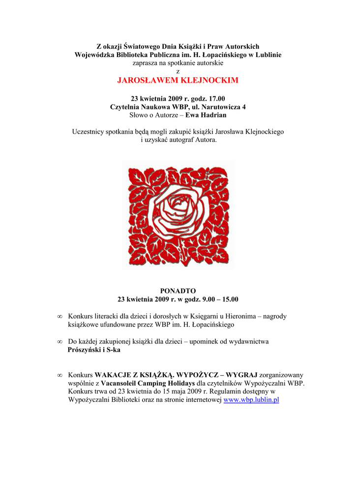 Z okazji Światowego Dnia KsiąŜki i Praw Autorskich Wojewódzka Biblioteka Publiczna im. H. Łopacińskiego w Lublinie zaprasza na spotkanie autorskie z JAROSŁAWEM KLEJNOCKIM 23 kwietnia 2009 r. godz. 17.00 Czytelnia Naukowa WBP, ul. Narutowicza 4 Słowo o Autorze – Ewa Hadrian Uczestnicy spotkania będą mogli zakupić ksiąŜki Jarosława Klejnockiego i uzyskać autograf Autora. PONADTO 23 kwietnia 2009 r. w godz. 9.00 – 15.00 • Konkurs literacki dla dzieci i dorosłych w Księgarni u Hieronima – nagrody ksiąŜkowe ufundowane przez WBP im. H. Łopacińskiego • Do kaŜdej zakupionej ksiąŜki dla dzieci – upominek od wydawnictwa Prószyński i S-ka • Konkurs WAKACJE Z KSIĄśKĄ. WYPOśYCZ – WYGRAJ zorganizowany wspólnie z Vacansoleil Camping Holidays dla czytelników WypoŜyczalni WBP. Konkurs trwa od 23 kwietnia do 15 maja 2009 r. Regulamin dostępny w WypoŜyczalni Biblioteki oraz na stronie internetowej www.wbp.lublin.pl Jarosław Klejnocki (ur. 1963) pisarz, poeta, eseista i krytyk literacki. Adiunkt w Instytucie Polonistyki Stosowanej Uniwersytetu Warszawskiego (zajmuje się metodyką nauczania oraz polską literaturą współczesną) i nauczyciel w prywatnym warszawskim liceum. Debiutował zbiorem wierszy Oswajanie (1993). W kolejnych latach ukazały się jego ksiąŜki poetyckie: Miasto otwarte (1995), Okruchy (1997), W drodze do Delft (1998), Krótka historia przeistoczeń (1999) ), Mr Hyde (1999), Reporterzy, fotograficy, zawiedzeni kochankowie (2002), Skarby dni ostatecznych. Psalmy, epigramaty, lamenty, litanie (2005). W międzyczasie wydał dwa zbiory esejów: Zagłada ogrodu (1996) oraz Piołun i inne eseje chodnikowe (1999), a takŜe prace krytycznoliterackie: wraz z Jerzym Sosnowskim Chwilowe zawieszenie broni. O twórczości tzw. pokolenia bruLionu (1986-1996) (1996), studium Bez utopii? Rzecz o poezji Adama Zagajewskiego (2002) oraz zbiór tekstów, częściowo wcześniej publikowanych w prasie (m.in. w “Krytyce Politycznej”, “Tygodniku Powszechnym”, “Gazecie Wyborczej”, “Lampie”), pt. Literatura w czasach zarazy (2006). Opracował antologie: "Po Wojaczku". Brulion i niezaleŜni (1992) oraz Macie swoich poetów. Liryka polska urodzona po 1960 r. (1996) (wraz z Pawłem Duninem-Wąsowiczem i Krzysztofem Vargą), a takŜe edycję listów (wraz z Anną Micińską i Andrzejem S. Kowalczykiem) Bolesława Micińskiego i Jerzego Stempowskiego (1995). Współtworzył teŜ serię podręczników języka polskiego dla szkół średnich (2002-2004). Jako prozaik dał się poznać w 2002 r. (próbą autobiografii antyintelektualnej) Jak nie zostałem menelem. W trzy lata później opublikował (powieść antykryminalną) Przylądek pozerów. Kolejna ksiąŜka autora, Południk 21, ukazała się w 2008 r. w Wydawnictwie Literackim. Najnowszy tom wierszy pt. Victoria ukazał się w 2009 r. w Wydawnictwie Nowy Świat. Współpracuje z prasą polską (m.in. “Tygodnik Powszechny”, “Polityka”, “Rzeczpospolita”, “Kresy”, “Miesięcznik Literacki”, “Odra”) i zagraniczną (“Chicago Review”, “Die Horen”). Jego wiersze, eseje i artykuły tłumaczono na angielski, niemiecki, szwedzki, słoweński, bułgarski, węgierski, rosyjski. http://www.wydawnictwoliterackie.pl/ http://www.youtube.com/watch?v=ODwzfgOcHCo Światowy Dzień KsiąŜki i Praw Autorskich (równieŜ w skrócie Międzynarodowy Dzień KsiąŜki lub Światowy Dzień KsiąŜki) – doroczne święto organizowane przez UNESCO w celu promocji czytelnictwa, edytorstwa i ochrony własności intelektualnej za pomocą praw autorskich. Dzień ten po raz pierwszy obchodzono w 1995 roku. Światowy Dzień KsiąŜki i Praw Autorskich obchodzony jest 23 kwietnia. Data ta wybrana została jako symboliczna dla literatury światowej. W tym dniu w roku 1616 zmarli Miguel de Cervantes, William Shakespeare i Inca Garcilaso de la Vega (przy czym datę śmierci Shakespeare’a podaje się według kalendarza juliańskiego, a pozostałych dwóch – według gregoriańskiego). Na ten sam dzień przypada równieŜ rocznica urodzin lub śmierci innych wybitnych pisarzy, np. Maurice’a Druona, Halldóra Laxnessa, Vladimira Nabokova, Josepa Pla, i Manuela Mejía Vallejo. W Wielkiej Brytanii i Irlandii Światowy Dzień KsiąŜki wyjątkowo obchodzony jest w pierwszy czwartek marca, tak aby święto to wypadało w trakcie semestru szkolnego. Pomysł organizacji święta zrodził się w Katalonii – w 1926 roku wystąpił z nim wydawca z Walencji, Vicente Clavel Andrés. Z początku planowano związać je z datą 7 października, domniemaną datą urodzin Cervantesa, lecz ze względu na niepewność z nią związaną, ostatecznie ustalono datę 23 kwietnia. W Hiszpanii Dzień KsiąŜki jest świętem oficjalnym juŜ od roku 1930, a od 1964 – we wszystkich krajach hiszpańskojęzycznych. 23 kwietnia jest w Katalonii hucznie obchodzonym świętem narodowym, jako dzień jej patrona – Świętego Jerzego. Zgodnie z długą tradycją w Katalonii obdarowywano w ten dzień kobiety czerwonymi róŜami, mającymi symbolizować krew pokonanego przez św. Jerzego smoka. Później kobiety zaczęły odwzajemniać się męŜczyznom podarunkami z ksiąŜek. www.pik.org.pl