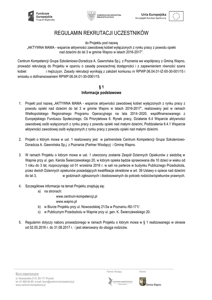 REGULAMIN REKRUTACJI UCZESTNIKÓW do Projektu pod nazwą „AKTYWNA MAMA - wsparcie aktywności zawodowej kobiet wyłączonych z rynku pracy z powodu opieki nad dziećmi do lat 3 w gminie Wapno w latach 2016-2017”. Centrum Kompetencji Grupa Szkoleniowo-Doradcza A. Gawrońska Sp.j. z Poznania we współpracy z Gminą Wapno, prowadzi rekrutację do Projektu w oparciu o zasadę powszechnej dostępności i z zapewnieniem równości szans kobiet i mężczyzn. Zasady rekrutacji wynikają z założeń konkursu nr RPWP.06.04.01-IZ-00-30-001/15 i wniosku o dofinansowanienr RPWP.06.04.01-30-0061/15. §1 Informacje podstawowe 1. Projekt pod nazwą „AKTYWNA MAMA - wsparcie aktywności zawodowej kobiet wyłączonych z rynku pracy z powodu opieki nad dziećmi do lat 3 w gminie Wapno w latach 2016-2017”, realizowany jest w ramach Wielkopolskiego Regionalnego Programu Operacyjnego na lata 2014–2020, współfinansowanego z Europejskiego Funduszu Społecznego, Oś Priorytetowa 6. Rynek pracy, Działanie 6.4 Wsparcie aktywności zawodowej osób wyłączonych z rynku pracy z powodu opieki nad małymi dziećmi, Poddziałania 6.4.1 Wsparcie aktywności zawodowej osób wyłączonych z rynku pracy z powodu opieki nad małymi dziećmi. 2. Projekt o którym mowa w ust. 1 realizowany jest w partnerstwie Centrum Kompetencji Grupa SzkoleniowoDoradcza A. Gawrońska Sp.j. z Poznania (Partner Wiodący) i Gminę Wapno. 3. W ramach Projektu o którym mowa w ust. 1 utworzony zostanie Zespół Dziennych Opiekunów z siedzibą w Wapnie przy ul. gen. Karola Świerczewskiego 20, w którym opieka będzie sprawowana dla 10 dzieci w wieku od 1 roku do 3 lat, rozpoczynając od 01 września 2016 r. w sali na parterze w budynku Publicznego Przedszkola, przez dwóch Dziennych opiekunów posiadających kwalifikacje określone w art. 39 Ustawy o opiece nad dziećmi do lat 3, w godzinach zgłoszonych i dostosowanych do potrzeb rodziców/opiekunów prawnych. 4. Szczegółowe informacje na temat Projektu znajdują się: a) na stronach: www.centrum-kompetencji.pl www.wapno.pl b) w Biurze Projektu przy ul. Nowosolskiej 21/3a w Poznaniu /60-171/ c) w Publicznym Przedszkolu w Wapnie przy ul. gen. K. Świerczewskiego 20. 5. Regulamin dotyczy naboru prowadzonego w ramach Projektu o którym mowa w § 1 realizowanego w okresie od 02.05.2016 r. do 31.08.2017 r. i jest skierowany do obojga rodziców. Biuro organizacyjne ul. Nowosolska 21/3, 60-171 Poznań tel. 61-862-64-85, e-mail: [email protected] www.centrum-kompetencji.pl Partner Wiodący Partner Gmina Wapno §2 Uczestnicy projektu 1. Rekrutacja dzieci do Zespołu Dziennych Opiekunów, o którym mowa w § 1 bezpośrednio wiąże się z rekrutacją do Projektu pełnoletnich rodziców/opiekunów prawnych doświadczających trudności na rynku pracy w związku ze sprawowaną opieką nad dzieckiem do lat 3, w tym: a) osób bezrobotnych pozostających bez pracy, gotowych do podjęcia pracy i aktywnie poszukujących zatrudnienia w tym: osoby w rozumieniu badania aktywności ekonomicznej ludności, zarejestrowane w Powiatowym Urzędzie Pracy, kwalifikujące się do urlopu macierzyńskiego lub rodzicielskiego /nie pobierają świadczeń z tytułu urlopu/ b) osób biernych zawodowo, które w danej chwili nie tworzą zasobów siły robocze (tzn. nie pracują i nie są bezrobotne), w tym: studenci studiów stacjonarnych, osoby będące na urlopie wychowawczym /rozumianym jako nieobecność w pracy, spowodowana opiekę nad dzieckiem w okresie, który nie mieści się w ramach urlopu macierzyńskiego lub urlopy rodzicielskiego) c) osób pracujących opiekujących się dziećmi do lat 3, którym w okresie opieki nad dzieckiem kończy się umowa o pracę, osób zatrudnionych na czas określony, pracujących będących w trakcie przerwy związanej z urlopem macierzyńskim, rodzicielskim lub wychowawczym. 2. W ramach Projektu zakłada się przyjęcie 10 pełnoletnich rodziców/ opiekunów prawnych obojga płci, z jednoczesnym zapewnieniem opieki dla ich 10 dzieci w wieku od 1 roku do 3 lat w ramach Zespołu Dziennych Opiekunów z siedzibą w Wapnie. Rodzice/ opiekunowie prawni muszą mieć: a) potwierdzony status na rynku pracy jako: ● osoby bezrobotne (w tym długotrwale bezrobotne) lub bierne zawodowo – dotyczy to 80% ogółu przyjętych ● osoby pracujące – dotyczy to 20% ogółu przyjętych. b) potwierdzone miejsce zamieszkania na terenie województwa wielkopolskiego, jednej z Gmin: ● Wapno ● Damasławek ● Gołańcz. 3. Dokumentem potwierdzającym posiadanie określonego w ust. 1 i 2: a) statusu na rynku pracy jest: ● kopia aktu urodzenia dziecka ● kopia legitymacji studenckiej (studenci studiów stacjonarnych) ● kopia umowy o pracę ● zaświadczenie z Powiatowego Urzędu Pracy z wskazaniem daty rejestracji ● zaświadczenie od pracodawcy odnośnie przebywania na urlopie macierzyńskim, rodzicielskim lub wychowawczym ● inny dokument wyżej nie wskazany wynikajacy ze specyfiki funkcjonowania na rynku pracy. b) miejsca zamieszkania jest: ● kopia dowodu osobistego lub innego dokumentu potwierdzającego miejsce zamieszkania Biuro organizacyjne ul. Nowosolska 21/3, 60-171 Poznań tel. 61-862-64-85, e-mail: [email protected] www.centrum-kompetencji.pl Partner Wiodący Partner Gmina Wapno §3 Proces rekrutacji 1. Każdy rodzic/ opiekun prawny ubiegający się o przyjęcie dziecka do lat 3 do Zespołu Dziennych Opiekunów w Wapnie zobowiązany jest do przekazania poprawnie wypełnionej i podpisanej „Karty zgłoszeniowej” wraz z: ● podpisanymi oświadczeniami ● załączonymi dokumentami potwierdzającymi status na rynku pracy i miejsce zamieszkania wg wzoru stanowiącego załącznik nr 1 do niniejszego Regulaminu. 2. Karta zgłoszeniowa o której mowa w ust. 1 jest możliwa do pobrana: a) ze stron: o www.centrum-kompetencji.pl o www.wapno.pl b) bezpośrednio w siedzibie: o Biura Projektu przy ul. Nowosolskiej 21/3a w Poznaniu o Publicznego Przedszkola w Wapnie przy ul. gen