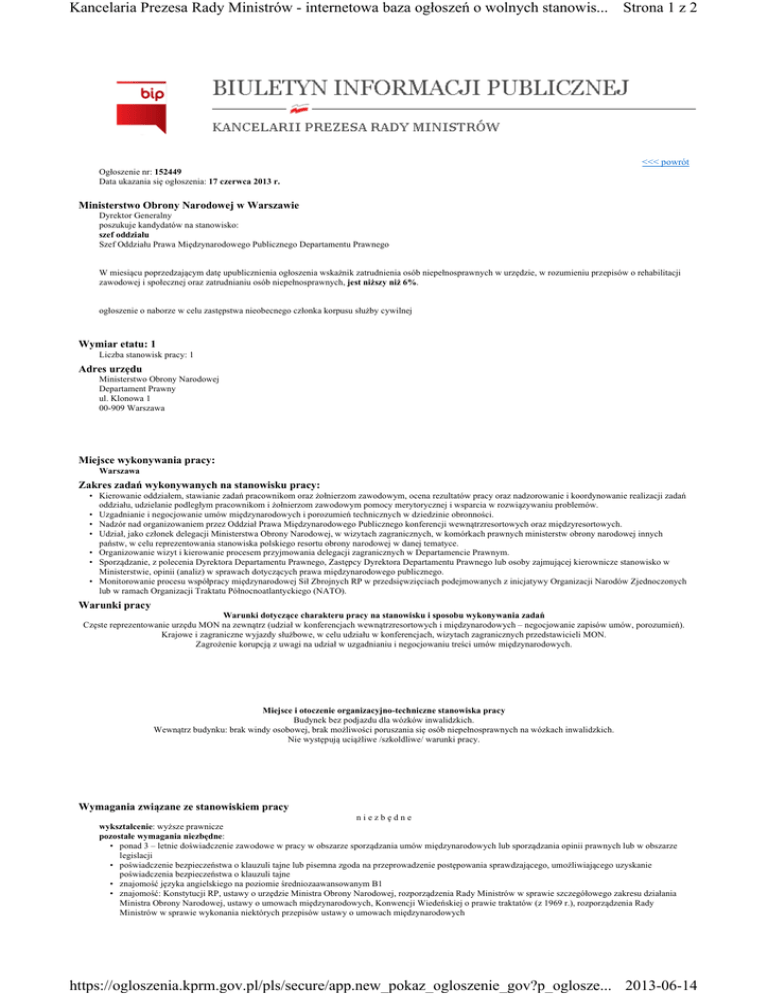 Kancelaria Prezesa Rady Ministrów - internetowa baza ogłoszeń o wolnych stanowis... Strona 1 z 2 <<< powrót Ogłoszenie nr: 152449 Data ukazania się ogłoszenia: 17 czerwca 2013 r. Ministerstwo Obrony Narodowej w Warszawie Dyrektor Generalny poszukuje kandydatów na stanowisko: szef oddziału Szef Oddziału Prawa Międzynarodowego Publicznego Departamentu Prawnego W miesiącu poprzedzającym datę upublicznienia ogłoszenia wskażnik zatrudnienia osób niepełnosprawnych w urzędzie, w rozumieniu przepisów o rehabilitacji zawodowej i społecznej oraz zatrudnianiu osób niepełnosprawnych, jest niższy niż 6%. ogłoszenie o naborze w celu zastępstwa nieobecnego członka korpusu służby cywilnej Wymiar etatu: 1 Liczba stanowisk pracy: 1 Adres urzędu Ministerstwo Obrony Narodowej Departament Prawny ul. Klonowa 1 00-909 Warszawa Miejsce wykonywania pracy: Warszawa Zakres zadań wykonywanych na stanowisku pracy: • Kierowanie oddziałem, stawianie zadań pracownikom oraz żołnierzom zawodowym, ocena rezultatów pracy oraz nadzorowanie i koordynowanie realizacji zadań oddziału, udzielanie podległym pracownikom i żołnierzom zawodowym pomocy merytorycznej i wsparcia w rozwiązywaniu problemów. • Uzgadnianie i negocjowanie umów międzynarodowych i porozumień technicznych w dziedzinie obronności. • Nadzór nad organizowaniem przez Oddział Prawa Międzynarodowego Publicznego konferencji wewnątrzresortowych oraz międzyresortowych. • Udział, jako członek delegacji Ministerstwa Obrony Narodowej, w wizytach zagranicznych, w komórkach prawnych ministerstw obrony narodowej innych państw, w celu reprezentowania stanowiska polskiego resortu obrony narodowej w danej tematyce. • Organizowanie wizyt i kierowanie procesem przyjmowania delegacji zagranicznych w Departamencie Prawnym. • Sporządzanie, z polecenia Dyrektora Departamentu Prawnego, Zastępcy Dyrektora Departamentu Prawnego lub osoby zajmującej kierownicze stanowisko w Ministerstwie, opinii (analiz) w sprawach dotyczących prawa międzynarodowego publicznego. • Monitorowanie procesu współpracy międzynarodowej Sił Zbrojnych RP w przedsięwzięciach podejmowanych z inicjatywy Organizacji Narodów Zjednoczonych lub w ramach Organizacji Traktatu Północnoatlantyckiego (NATO). Warunki pracy Warunki dotyczące charakteru pracy na stanowisku i sposobu wykonywania zadań Częste reprezentowanie urzędu MON na zewnątrz (udział w konferencjach wewnątrzresortowych i międzynarodowych – negocjowanie zapisów umów, porozumień). Krajowe i zagraniczne wyjazdy służbowe, w celu udziału w konferencjach, wizytach zagranicznych przedstawicieli MON. Zagrożenie korupcją z uwagi na udział w uzgadnianiu i negocjowaniu treści umów międzynarodowych. Miejsce i otoczenie organizacyjno-techniczne stanowiska pracy Budynek bez podjazdu dla wózków inwalidzkich. Wewnątrz budynku: brak windy osobowej, brak możliwości poruszania się osób niepełnosprawnych na wózkach inwalidzkich. Nie występują uciążliwe /szkoldliwe/ warunki pracy. Wymagania związane ze stanowiskiem pracy niezbędne wykształcenie: wyższe prawnicze pozostałe wymagania niezbędne: • ponad 3 – letnie doświadczenie zawodowe w pracy w obszarze sporządzania umów międzynarodowych lub sporządzania opinii prawnych lub w obszarze legislacji • poświadczenie bezpieczeństwa o klauzuli tajne lub pisemna zgoda na przeprowadzenie postępowania sprawdzającego, umożliwiającego uzyskanie poświadczenia bezpieczeństwa o klauzuli tajne • znajomość języka angielskiego na poziomie średniozaawansowanym B1 • znajomość: Konstytucji RP, ustawy o urzędzie Ministra Obrony Narodowej, rozporządzenia Rady Ministrów w sprawie szczegółowego zakresu działania Ministra Obrony Narodowej, ustawy o umowach międzynarodowych, Konwencji Wiedeńskiej o prawie traktatów (z 1969 r.), rozporządzenia Rady Ministrów w sprawie wykonania niektórych przepisów ustawy o umowach międzynarodowych https://ogloszenia.kprm.gov.pl/pls/secure/app.new_pokaz_ogloszenie_gov?p_oglosze... 2013-06-14 Kancelaria Prezesa Rady Ministrów - internetowa baza ogłoszeń o wolnych stanowis... Strona 2 z 2 • znajomość: regulaminu organizacyjnego MON, problematyki prawa międzynarodowego publicznego (zagadnienia systemowe, źródła i podmioty tego prawa), aktualnej sytuacji międzynarodowej, procedur legislacyjnych, struktury organizacyjnej MON • umiejętność: organizacji pracy własnej, współpracy z innymi, zarządzania innymi, planowania i organizacji, poszukiwania rozwiązań wymagania dodatkowe • roczne doświadczenie w kierowaniu zespołem Wymagane dokumenty i oświadczenia: • • • • • • • życiorys i list motywacyjny oświadczenie kandydata o wyrażeniu zgody na przetwarzanie danych osobowych do celów rekrutacji oświadczenie kandydata o korzystaniu z pełni praw publicznych oświadczenie kandydata o nieskazaniu prawomocnym wyrokiem za umyślne przestępstwo lub umyślne przestępstwo skarbowe kopie dokumentów potwierdzających wykształcenie kopia dokumentu potwierdzającego posiadanie polskiego obywatelstwa lub oświadczenie o posiadaniu obywatelstwa polskiego kopia poświadczenia bezpieczeństwa upoważniającego do dostępu do informacji niejawnych oznaczonych klauzulą „tajne” lub pisemna zgoda na przeprowadzenie ww. postępowania sprawdzającego • kopia dokumentów potwierdzających znajomość języka angielskiego na wymaganym w ogłoszeniu poziomie B1 (kopia certyfikatu) • kopie dokumentów potwierdzających ponad 3 – letnie doświadczenie zawodowe w pracy w obszarze sporządzania umów międzynarodowych lub sporządzania opinii prawnych lub w obszarze legislacji (np.kopie świadectw pracy, zaświadczenia o zatrudnieniu) Inne dokumenty i oświadczenia • kopia dokumentu potwierdzającego niepełnosprawność - w przypadku kandydatów, którzy zamierzają skorzystać z pierwszeństwa w zatrudnieniu w przypadku, gdy znajdą 