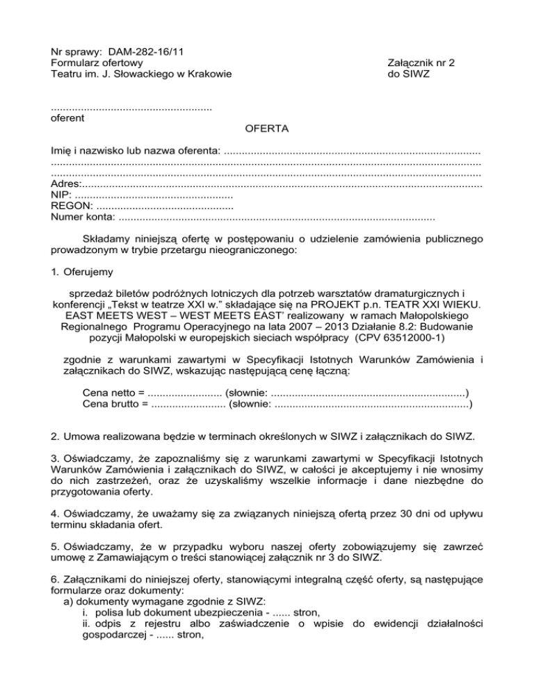 Nr sprawy: DAM-282-16/11 Formularz ofertowy Teatru im. J. Słowackiego w Krakowie Załącznik nr 2 do SIWZ ...................................................... oferent OFERTA Imię i nazwisko lub nazwa oferenta: ...................................................................................... ................................................................................................................................................ ................................................................................................................................................ Adres:...................................................................................................................................... NIP: ..................................................... REGON: .............................................. Numer konta: .......................................................................................................... Składamy niniejszą ofertę w postępowaniu o udzielenie zamówienia publicznego prowadzonym w trybie przetargu nieograniczonego: 1. Oferujemy sprzedaż biletów podróżnych lotniczych dla potrzeb warsztatów dramaturgicznych i konferencji „Tekst w teatrze XXI w.” składające się na PROJEKT p.n. TEATR XXI WIEKU. EAST MEETS WEST – WEST MEETS EAST’ realizowany w ramach Małopolskiego Regionalnego Programu Operacyjnego na lata 2007 – 2013 Działanie 8.2: Budowanie pozycji Małopolski w europejskich sieciach współpracy (CPV 63512000-1) zgodnie z warunkami zawartymi w Specyfikacji Istotnych Warunków Zamówienia i załącznikach do SIWZ, wskazując następującą cenę łączną: Cena netto = ......................... (słownie: .................................................................) Cena brutto = ......................... (słownie: .................................................................) 2. Umowa realizowana będzie w terminach określonych w SIWZ i załącznikach do SIWZ. 3. Oświadczamy, że zapoznaliśmy się z warunkami zawartymi w Specyfikacji Istotnych Warunków Zamówienia i załącznikach do SIWZ, w całości je akceptujemy i nie wnosimy do nich zastrzeżeń, oraz że uzyskaliśmy wszelkie informacje i dane niezbędne do przygotowania oferty. 4. Oświadczamy, że uważamy się za związanych niniejszą ofertą przez 30 dni od upływu terminu składania ofert. 5. Oświadczamy, że w przypadku wyboru naszej oferty zobowiązujemy się zawrzeć umowę z Zamawiającym o treści stanowiącej załącznik nr 3 do SIWZ. 6. Załącznikami do niniejszej oferty, stanowiącymi integralną część oferty, są następujące formularze oraz dokumenty: a) dokumenty wymagane zgodnie z SIWZ: i. polisa lub dokument ubezpieczenia - ...... stron, ii. odpis z rejestru albo zaświadczenie o wpisie do ewidencji działalności gospodarczej - ...... stron, iii. zaświadczenie z Urzędu Skarbowego - ...... stron, iv. zaświadczenie z oddziału Zakładu Ubezpieczeń Społecznych - ...... stron, b) parafowany tekst umowy o zamówienie publiczne – stanowiący załącznik nr 3 do SIWZ, c) pełnomocnictwo udzielone przez podmioty wspólnie składające ofertę do ich reprezentowania w postępowaniu (jeśli dotyczy) - ...... stron. 7. Ja, niżej podpisany, świadomy odpowiedzialności karnej za składanie fałszywych oświadczeń, niniejszym oświadczam, że podmiot przeze mnie reprezentowany: a) posiada uprawnienia do wykonywania określonej działalności i do wykonywania składających się na przedmiot zamówienia czynności, b) posiada niezbędną wiedzę i doświadczenie oraz dysponuje odpowiednim potencjałem technicznym oraz osobami zdolnymi do wykonania zamówienia, c) znajduje się w sytuacji ekonomicznej i finansowej zapewniającej wykonanie zamówienia, w szczególności pozostaje ubezpieczony od odpowiedzialności cywilnej w zakresie prowadzonej działalności gospodarczej na sumę ubezpieczenia co najmniej równą 40.000,- zł, d) nie podlega wykluczeniu z postępowania na podstawie art. 24 ustawy Prawo zamówień publicznych. ...................................................... ...................................................... miejscowość, data pieczęć wykonawcy podpisy osób uprawnionych do reprezentacji