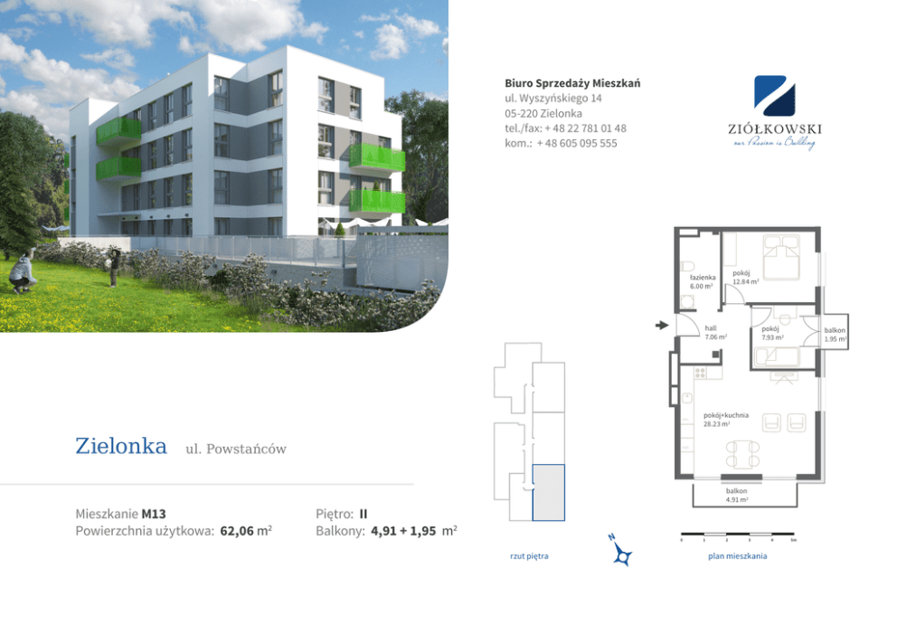 Mieszkanie M13 Powierzchnia użytkowa: 62,06 m2 Piętro: II Balkony