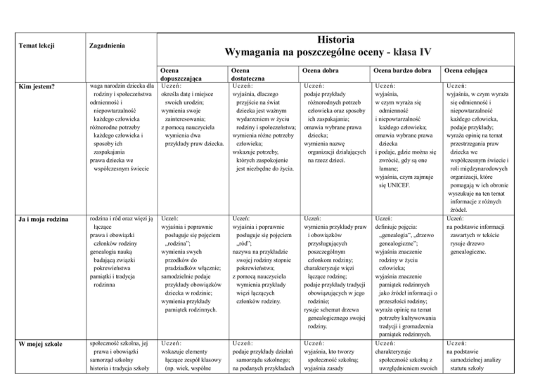 Temat lekcji Historia Wymagania na poszczególne oceny - klasa IV Zagadnienia Ocena dopuszczająca Ocena dostateczna Ocena dobra Ocena bardzo dobra Kim jestem? waga narodzin dziecka dla rodziny i społeczeństwa odmienność i niepowtarzalność każdego człowieka różnorodne potrzeby każdego człowieka i sposoby ich zaspakajania prawa dziecka we współczesnym świecie Ucze ń : określa datę i miejsce swoich urodzin; wymienia swoje zainteresowania; z pomocą nauczyciela wymienia dwa przykłady praw dziecka. Ucze ń : wyjaśnia, dlaczego przyjście na świat dziecka jest ważnym wydarzeniem w życiu rodziny i społeczeństwa; wymienia różne potrzeby człowieka; wskazuje potrzeby, których zaspokojenie jest niezbędne do życia. Ucze ń : podaje przykłady różnorodnych potrzeb człowieka oraz sposoby ich zaspakajania; omawia wybrane prawa dziecka; wymienia nazwę organizacji działających na rzecz dzieci. Ucze ń : wyjaśnia, w czym wyraża się odmienność i niepowtarzalność każdego człowieka; omawia wybrane prawa dziecka i podaje, gdzie można się zwrócić, gdy są one łamane; wyjaśnia, czym zajmuje się UNICEF. Ja i moja rodzina rodzina i ród oraz więzi ją łączące prawa i obowiązki członków rodziny genealogia nauką badającą związki pokrewieństwa pamiątki i tradycja rodzinna Uczeń: wyjaśnia i poprawnie posługuje się pojęciem „rodzina”; wymienia swych przodków do pradziadków włącznie; samodzielnie podaje przykłady obowiązków dziecka w rodzinie; wymienia przykłady pamiątek rodzinnych. Uczeń: wyjaśnia i poprawnie posługuje się pojęciem „ród”; nazywa na przykładzie swojej rodziny stopnie pokrewieństwa; z pomocą nauczyciela wymienia przykłady więzi łączących członków rodziny. Uczeń: wymienia przykłady praw i obowiązków przysługujących poszczególnym członkom rodziny; charakteryzuje więzi łączące rodzinę; podaje przykłady tradycji obowiązujących w jego rodzinie; rysuje schemat drzewa genealogicznego swojej rodziny. W mojej szkole społeczność szkolna, jej prawa i obowiązki samorząd szkolny historia i tradycja szkoły Ucze ń : wskazuje elementy łączące zespół klasowy (np. wiek, wspólne Ucze ń : podaje przykłady działań samorządu szkolnego; na podanych przykładach Ucze ń : wyjaśnia, kto tworzy społeczność szkolną; wyjaśnia zasady Uczeń: definiuje pojęcia: „genealogia”, „drzewo genealogiczne”; wyjaśnia znaczenie rodziny w życiu człowieka; wyjaśnia znaczenie pamiątek rodzinnych jako źródeł informacji o przeszłości rodziny; wyraża opinię na temat potrzeby kultywowania tradycji i gromadzenia pamiątek rodzinnych. Ucze ń : charakteryzuje społeczność szkolną z uwzględnieniem swoich Ocena celująca Ucze ń : wyjaśnia, w czym wyraża się odmienność i niepowtarzalność każdego człowieka, podaje przykłady; wyraża opinię na temat przestrzegania praw dziecka we współczesnym świecie i roli międzynarodowych organizacji, które pomagają w ich obronie wyszukuje na ten temat informacje z różnych źródeł. Uczeń: na podstawie informacji zawartych w tekście rysuje drzewo genealogiczne. Ucze ń : na podstawie samodzielnej analizy statutu szkoły uprzejmość, sprawiedliwość i tolerancja jako przejawy zachowań pozytywnych poszanowanie godności i odmienności kolegów konflikty międzyludzkie i sposoby ich rozwiązywania społeczeństwo jako forma zbiorowości grupy społeczne i zasady przynależności do nich praca i jej rola w życiu człowieka lekcje, wychowawca); wymienia elementy tradycji własnej szkoły; wskazuje uprzejmość i koleżeńskość jako zachowania konieczne dla dobrego funkcjonowania zespołu klasowego. Ucze ń : wymienia swoje zainteresowania; podaje przykład grupy społecznej, do której należy; określa na podanych przykładach pozytywne i negatywne zachowania. wskazuje zachowania świadczące o poszanowaniu godności i odmienności innych; uzasadnia konieczność przestrzegania zasad koleżeństwa i przyjaźni. Moja mała ojczyzna mała ojczyzna – społeczność historia i kultura formy upamiętniania przeszłości małej ojczyzny Ucze ń : nazywa i pokazuje na mapie region i województwo, w którym mieszka; wymienia przykłady zabytków architektury i przyrody swojego regionu. Ucze ń : opisuje położenie geograficzne swojej miejscowości; w kilku zdaniach prezentuje atrakcje turystyczne małej ojczyzny; wymienia nazwy miejscowości w najbliższej okolicy. funkcjonowania samorządu szkolnego; podaje przykłady działań samorządu w swojej szkole; podaje przykłady konfliktów między ludźmi i proponuje sposoby ich rozwiązywania. Ucze ń : definiuje pojęcie „grupa społeczna”; uzasadnia konieczność przestrzegania przyjętych norm współżycia w najbliższym otoczeniu; opisuje różne grupy społeczne, wskazując ich role w społeczeństwie; wyjaśnia znaczenie pracy w życiu człowieka. Ucze ń : prezentuje swoją małą ojczyznę, uwzględniając tradycję historyczno-kulturową; zbiera i prezentuje informacje o rozmaitych formach upamiętniania postaci i wydarzeń z przeszłości małej ojczyzny. Samorząd lokalny władze lokalne – zakres działań i sposób ich powoływania Ucze ń : wskazuje na planie miejscowości siedzibę władz lokalnych; wymienia nazwisko wójta (burmistrza lub Ucze ń : wyjaśnia pojęcie „władza lokalna”; wymienia przedstawicieli władzy lokalnej; wyjaśnia zasady Ucze ń : wymienia i nazywa władze lokalne, używając pojęć: „rada miasta” „lub gminy”, „wójt” („burmistrz” lub Jestem częścią społeczeństwa Ucze ń : definiuje pojęcie „społeczeństwo”; podaje dziedzinę wiedzy lub umiejętności, które rozwijają się pod wpływem własnych zainteresowań; określa swoją przynależność do grup społecznych. praw i obowiązków; wyjaśnia, odwołując się do przykładów, na czym polega postępowanie sprawiedliwe ; wyjaśnia, w czym przejawia się uprz