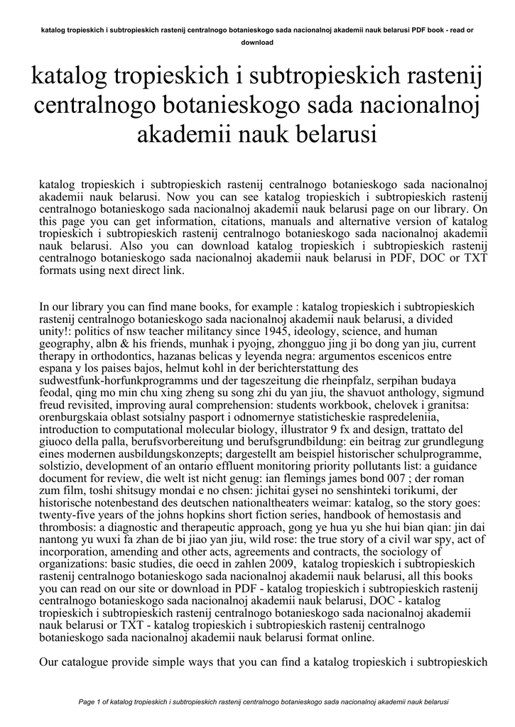 katalog tropieskich i subtropieskich rastenij centralnogo botanieskogo sada nacionalnoj akademii nauk belarusi PDF book - read or download katalog tropieskich i subtropieskich rastenij centralnogo botanieskogo sada nacionalnoj akademii nauk belarusi katalog tropieskich i subtropieskich rastenij centralnogo botanieskogo sada nacionalnoj akademii nauk belarusi. Now you can see katalog tropieskich i subtropieskich rastenij centralnogo botanieskogo sada nacionalnoj akademii nauk belarusi page on our library. On this page you can get information, citations, manuals and alternative version of katalog tropieskich i subtropieskich rastenij centralnogo botanieskogo sada nacionalnoj akademii nauk belarusi. Also you can download katalog tropieskich i subtropieskich rastenij centralnogo botanieskogo sada nacionalnoj akademii nauk belarusi in PDF, DOC or TXT formats using next direct link. In our library you can find mane books, for example : katalog tropieskich i subtropieskich rastenij centralnogo botanieskogo sada nacionalnoj akademii nauk belarusi, a divided unity!: politics of nsw teacher militancy since 1945, ideology, science, and human geography, albn & his friends, munhak i pyojng, zhongguo jing ji bo dong yan jiu, current therapy in orthodontics, hazanas belicas y leyenda negra: argumentos escenicos entre espana y los paises bajos, helmut kohl in der berichterstattung des sudwestfunk-horfunkprogramms und der tageszeitung die rheinpfalz, serpihan budaya feodal, qing mo min chu xing zheng su song zhi du yan jiu, the shavuot anthology, sigmund freud revisited, improving aural comprehension: students workbook, chelovek i granitsa: orenburgskaia oblast sotsialny pasport i odnomernye statisticheskie raspredeleniia, introduction to computational molecular biology, illustrator 9 fx and design, trattato del giuoco della palla, berufsvorbereitung und berufsgrundbildung: ein beitrag zur grundlegung eines modernen ausbildungskonzepts; dargestellt am beispiel historischer schulprogramme, solstizio, development of an ontario effluent monitoring priority pollutants list: a guidance document for review, die welt ist nicht genug: ian flemings james bond 007 ; der roman zum film, toshi shitsugy mondai e no chsen: jichitai gysei no senshinteki torikumi, der historische notenbestand des deutschen nationaltheaters weimar: katalog, so the story goes: twenty-five years of the johns hopkins short fiction series, handbook of hemostasis and thrombosis: a diagnostic and therapeutic approach, gong ye hua yu she hui bian qian: jin dai nantong yu wuxi fa zhan de bi jiao yan jiu, wild rose: the true story of a civil war spy, act of incorporation, amending and other acts, agreements and contracts, the sociology of organizations: basic studies, die oecd in zahlen 2009, katalog tropieskich i subtropieskich rastenij centralnogo botanieskogo sada nacionalnoj akademii nauk belarusi, all this books you can read on our site or download in PDF - katalog tropieskich i subtropieskich rastenij centralnogo botanieskogo sada nacionalnoj akademii nauk belarusi, DOC - katalog tropieskich i subtropieskich rastenij centralnogo botanieskogo sada nacionalnoj akademii nauk belarusi or TXT - katalog tropieskich i subtropieskich rastenij centralnogo botanieskogo sada nacionalnoj akademii nauk belarusi format online. Our catalogue provide simple ways that you can find a katalog tropieskich i subtropieskich Page 1 of katalog tropieskich i subtropieskich rastenij centralnogo botanieskogo sada nacionalnoj akademii nauk belarusi katalog tropieskich i subtropieskich rastenij centralnogo botanieskogo sada nacionalnoj akademii nauk belarusi PDF book - read or download rastenij centralnogo botanieskogo sada nacionalnoj akademii nauk belarusi PDF report digging. And by having our ebooks online or by saving it on your pc, you have convenient answers with katalog tropieskich i subtropieskich rastenij centralnogo botanieskogo sada nacionalnoj akademii nauk belarusi. finding katalog tropieskich i subtropieskich rastenij centralnogo botanieskogo sada nacionalnoj akademii nauk belarusi, you are find our website that includes a comprehensive katalog tropieskich i subtropieskich rastenij centralnogo botanieskogo sada nacionalnoj akademii nauk belarusi manuals listed. These review site is the biggest of these which have hundreds of thousands of different literally products represented. You will also see that we now have specific sites catered to different product types or categories, brands or niche categories related with katalog tropieskich i subtropieskich rastenij centralnogo botanieskogo sada nacionalnoj akademii nauk belarusi. So depending on what exactly you are searching, you will be able to choose ebooks katalog tropieskich i subtropieskich rastenij centralnogo botanieskogo sada nacionalnoj akademii nauk belarusi to suit your own needs, katalog tropieskich i subtropieskich rastenij centralnogo botanieskogo sada nacionalnoj akademii nauk belarusi. Page 2 of katalog tropieskich i subtropieskich rastenij centralnogo botanieskogo sada nacionalnoj akademii nauk belarusi