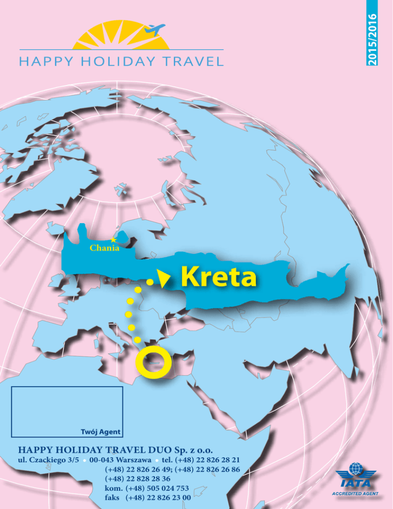2015/2016 o Chania Kreta Twój Agent HAPPY HOLIDAY TRAVEL DUO Sp. z o.o. ul. Czackiego 3/5 q 00-043 Warszawa q tel. (+48) 22 826 28 21 (+48) 22 826 26 49; (+48) 22 826 26 86 (+48) 22 828 28 36 kom.(+48) 505 024 753 faks (+48) 22 826 23 00 Kreta To największa z setek wysp archipelagów greckich i czwarta co do wielkości na Morzu Śródziemnym. Widokowo zróżnicowana, ofiaruje turystom całe swe bogactwo – wysokie góry, głębokie wąwozy, tajemnicze groty, żyzne doliny, na których rozciągają się gaje oliwne oraz winnice, bezkresne plaże z krystalicznie czystym i ciepłym morzem oraz wspaniały klimat. Dzisiejsza Kreta to dwa światy – współczesny z charakterystycznymi dla początku XXI w. osiągnięciami cywilizacji, drugi natomiast to zacofana i tradycyjna wieś, która kontynuuje obyczaje i sposób życia sprzed wielu lat. Głównym, historycznym walorem turystycznym Krety są pozostałości kultury minojskiej. Najlepiej zachowane zabytki znajdują się w Knossos, Fajstos, Mallos, Gurni. Kreta zawdzięcza swoje piękno nie tylko przyrodzie i historii. To także ludzie zamieszkujący malownicze miasteczka i wioski, w których panuje spokojna, a nawet nieco senna atmosfera. Natomiast korzystne warunki klimatyczne, malownicza i silnie rozwinięta linia brzegowa, piękne piaszczyste plaże stwarzają doskonałe warunki do wypoczynku i uprawiania sportów wodnych. Dodatkową atrakcją turystyczną wyspy jest jej górzystość, krasowe wąwozy i jaskinie, które zapraszają turystów na piesze wędrówki. Sezon turystyczny trwa na Krecie wiele miesięcy i warto przyjechać tu także wiosną i jesienią. Leniwe, ciepłe słońce nie męczy wtedy tak bardzo, na plażach i szlakach turystycznych jest mniej turystów, a w powietrzu unosi się wspaniały zapach oregano, bazylii i tamaryszku. Chania Jedna z większych miejscowości na Krecie. Leży na północno-zachodnim wybrzeżu wyspy, w sąsiedztwie półwyspu Akriotiri, uważana jest za najpiękniejszy i najbardziej urzekający port Krety. To właśnie okolice Chanii są najbardziej zielone na wyspie i tu rozciągają się piękne, długie, piaszczyste plaże. Zachowały się tutaj pozostałości wszystkich epok historycznych. Sąsiadują ze sobą ruiny pamiętające czasy króla Minosa, bizantyjskie kościoły, tureckie meczety i weneckie wille. Niezliczone zakamarki Starówki z kafejkami, tawernami oraz wyjątkowo piękny wenecki port z basztą Firkas, Meczetem Janczarów i latarnią morską tworzą niepowtarzalny charakter tego miasta. Kilka kilometrów od Chanii leży wioska Stavros, gdzie kręcono niezapomniany film „Grek Zorba”. Kolimbari Jedna z wielu wiosek na Krecie, leżąca na zachód od Chanii tuż za Maleme. Urocza, typowo turystyczna miejscowość z wieloma sklepami, tawernami i kafejkami, z atmosferą starej greckiej prowincji, gdzie na każdym kroku stykamy się z typową grecką gościnnością mieszkańców. Żwirowopiaszczyste plaże oraz piękne krajobrazy tworzą niepowtarzalny klimat i sprzyjają relaksowi. „Kreta jest wyspą leżącą pośrodku morza o kolorze ciemnego wina, wyspą sprawiedliwą i urodzajną, obmywaną falami.” HOMER Iliada 3 Warto wiedzieć KLIMAT Stykają się tu klimaty śródziemnomorski, kontynentalny i afrykański ŚREDNIE TEMPERATURY W DZIEŃ (w °C) I II III IV V VI VII VIII IX X XI XII 14 14 16 20 24 28 30 23 19 16 29 27 ŚREDNIE OPADY – suma opadów mierzona w milimetrach I II III IV V VI 77 48 32 20 10 4 VII VIII IX 1 2 X XI XII 10 23 36 70 Zapraszamy do Izraela przez cały rok TEMPERATURA WODY I II III IV V VI VII VIII IX X XI XII - - - 17 20 23 25 25 - - 26 26 JĘZYK Grecki, angielski, można porozumieć się również po niemiecku. POWIERZCHNIA 8336 km². LUDNOŚĆ 630 tys. mieszkańców. WALUTA Euro. KARTY KREDYTOWE W sklepach, restauracjach, hotelach są akceptowane karty kredytowe Visa, Mastercard/Eurocard, American Express, Dinners Club. Łatwo znaleźć bankomat. • WYJAZDY INDYWIDUALNE • WYJAZDY GRUPOWE • POBYTY LECZNICZE • PODRÓŻE MOTYWACYJNE (INCENTIVE) WIZY Nie są wymagane. PRZEPISY ZDROWOTNE Nie są wymagane szczepienia. SAMOCHÓD Wymagane międzynarodowe lub lokalne ważne prawo jazdy. Ruch prawostronny, obowiązek zapinania pasów bezpieczeństwa, limit prędkości na autostradach 90-110 km/h, stacje benzynowe czynne w większości całą dobę. NAPIWKI Obowiązkowe, 10-15% ceny. NAPIĘCIE ELEKTRYCZNE 230 V. SKLEPY Otwarte są od 9.00 do 17.00 lub 18.00 od niedzieli do czwartku. Sjesta od 13.00 do 16.00. Muzea i galerie mają swoje godziny otwarcia. 4 Do Izraela tylko z nami! Wycieczki fakultatywne V APTERA Całodzienna wycieczka autokarowa, która jest podróżą od starożytności do współczesności. Turyści otrzymują na niej dużą dawkę wiadomości o Krecie, obyczajach i kulturze, jakich nie znajdą w żadnym przewodniku. APTERA to ruiny starożytnego miasta, które istniało od XIV w. p.n.e do VII w. n.e. Zwiedzamy odkopane przez archeologów domy z okresu Bizancjum i łaźnie z okresu rzymskiego, ruiny Świątyni Artemidy. Kolejną atrakcją jest Kurna, jedyne polodowcowe jezioro na Krecie w otoczeniu Gór Białych, głębokie na 80 m. Przejeżdżamy przez ARGIEROUPOLI – romantyczną wioskę, w której ze wszystkich stron kaskadami spływa woda, tworząc piękne wodospady. Na zakończenie zwiedzać będziemy RETHYMNO – jedno z czterech większych miast na Krecie, z największą na Morzu Śródziemnym fortecą wenecką, pięknym portem i turecko-wenecką starówką. V ELAFONISSI V WĄWÓZ SAMARIA Wczesnym r an k i e m w y jazd autokarem do miejscowości Omalos, skąd rozpocznie się kilkugodzinna, piesza wycieczka przez najpiękniejszy i najdłuższy (18 km) wąwóz w Europie, którego ściany w najwyższym miejscu sięgają 300 m wysokości, a najwęższe przejście, tzw. Żelazne Wrota, ma ok. 2 m. W 1962 roku został tu utworzony Park Narodowy. Po wysiedlonych mieszkańcach tej pasterskiej okolicy (wioska Samaria) pozostały m