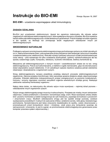 Instrukcje do BIO-EMI Wersja: Styczen 18, 2007 BIO-EM I - urzadzenie wspomagajace uklad immunologiczy ZASADA DZIALANIA Bio-Emi jest urzadzeniem elektronicznym. Aparat ten ogranicza niekorzystny dla zdrowia wplyw negatywnych oddzialywan elektromagnetycznych, które wystepuja w otoczeniu czlowieka. Bio-Emi wytwarza bardzo slabe pola elektromagnetyczne o scisle okreslonych parametrach. Pola te dzialaja na ludzki organizm w ten sposób, ze likwiduja lub zmniejszaja skutki negatywnych oddzialywan innych pól elektromagnetycznych. SRODOWISKO NATURALNE Podlegamy wplywom promieniowania elektromagnetycznego pochodzacego zarówno ze zródel naturalnych (m.in. stale promieniowanie Ziemi, pola wytwarzane przez podziemne cieki wodne) jak i sztucznych (wszelkie urzadzenia elektryczne i elektroniczne). Wskutek rozwoju cywilizacji sztucznych zródel promieniowania jest coraz wiecej – pola wytwarzaja nie tylko urzadzenia przemyslowe, systemy radiokomunikacyjne ale tez sprzety codziennego uzytku: komputery, telewizory, kuchenki mikrofalowe, telefony komórkowe itp. Mieszanina pól elektromagnetycznych o róznych mocach i czestotliwosciach sklada sie na tzw. smog elektromagnetyczny. Pola te sa trudnomierzalne, a niektóre w ogóle niemierzalne, gdyz nie skonstruowano dotad odpowiednio czulych detektorów. O ich szkodliwym wplywie niezbicie swiadcza jednak wieloletnie obserwacje i doswiadczenia z organizmami zywymi. Smog elektromagnetyczny narusza prawidlowy przebieg wlasnych procesów elektromagnetycznych organizmów. Zaburza przeplyw bioinformacji, który warunkuje sprawne dzialanie ukladu odpornosciowego czlowieka. Wskutek zaklócenia niskopoziomowych przejsc energetycznych na poziomie molekularnym, hormony i enzymy regulujace czynnosci wszystkich organów wewnetrznych dzialaja gorzej. Nastepuje zaklócenie naturalnej homeostazy organizmu. Nalezy takze dodac, ze niekorzystny dla zdrowia wplyw moze wywolywac – najmniej dotad poznane – oddzialywanie innych organizmów zywych. Wplyw smogu elektromagnetycznego moze byc trudnouchwytny. Przejawia sie miedzy innymi obnizeniem odpornosci, a takze problemami z cisnieniem, koncentracja uwagi, snem. Moze wywolywac zmiany skladu krwi i poziomu hormonów (u kobiet rozregulowuje sie cykl miesieczny, pojawiaja sie trudnosci z poczeciem i utrzymaniem ciazy). Skutkiem oddzialywania smogu jest tez spadek energii zyciowej, czestsze wystepowanie przewleklych i trudnych do wyleczenia infekcji, oslabienie wzroku, bóle glowy niewiadomego pochodzenia. Symptomatyczne jest takze zmeczenie nieadekwatne do wysilku, czesto obserwowane u przesiadujacych przed komputerami dzieci i mlodziezy. (Jesli praca przy komputerze wywoluje zle samopoczucie i zmeczenie, to jest to sygnal, ze promieniowanie elektromagnetyczne generowane przez komputer przeciaza system odpornosciowy.) Page 1 PROFILAKTYKA ZDROWOTNA Aparat Bio-Emi poprawia warunki zdrowotne srodowiska i sluzy do szeroko rozumianej profilaktyki zdrowotnej. Fale elektromagnetyczne generowane przez aparat sa optymalne dla sprawnego funkcjonowania systemu immunologicznego. Bio-Emi usuwa skutki negatywnych oddzialywan ze zródel naturalnych, takze pochodzacych od innych organizmów zywych. Zapewnia wiec zdrowy sen w kazdym miejscu. W przypadku przeciazenia organizmu szkodliwym promieniowaniem ze zródel sztucznych (np. komputery, telefony komórkowe), wskazane jest ograniczenie ich uzywania przez pewien czas, a aparat Bio-Emi pomoze odblokowac organizm i przywrócic wlasciwa prace ukladu odpornosciowego. Aparat stwarza optymalne warunki do zachowania zdrowia i dobrego samopoczucia. Spowalnia procesy starzenia sie i sprzyja dlugowiecznosci. Sprawny system immunologiczny niszczy bowiem chorobotwórcze bakterie, wirusy i grzyby, których rozwój jest przyczyna albo sprzyja wielu chorobom uznawanym za nieuleczalne. Aparat Bio-Emi stwarza najlepsze warunki powrotu do zdrowia dla rekonwalescentów. Aparat jest szczególnie przydatny dla osób pracujacych w duzych skupiskach ludzkich. Bio-Emi nie jest wskazany dla osób cierpiacych na ciezkie choroby autoimmunologiczne (np. toczen) oraz dla osób z wszczepionymi rozrusznikami serca. CHOROBY CYWILIZACYJNE Aparat Bio-Emi to milowy krok w profilaktyce onkologicznej i walce z chorobami. Moze usuwac nowotworowe stany przedkliniczne (niewykrywalne w testach medycznych) oraz wczesne zmiany nowotworowe (w stanie in situ). Pod wplywem aparatu moze wystapic obnizenie poziomu markerów nowotworowych. Wspomaga kuracje onkologiczne – szczególnie wskazany po leczeniu chirurgicznym. Moze lagodzic skutki uboczne chemioterapii. Aparat znaczaco skraca czas rekonwalescencji i zmniejsza ryzyko przerzutów i wznowy. Bio-Emi jest szczególnie polecany dla osób z grupy zwiekszonego ryzyka: zagrozonych choroba nowotworowa oraz obciazonych genetycznie, czyli tych, u których w najblizszej rodzinie wystapily choroby nowotworowe. UZYTKOWANIE APARATU Aparat wykazuje dzialanie zdrowotne w promieniu 2 metrów, w promieniu 10 metrów zas likwiduje szkodliwy wplyw smogu elektromagnetycznego. Wskazane jest wiec noszenie aparatu przy sobie (np. w kieszeni, torbie), umieszczanie go jak najblizej miejsca pracy, snu, odpoczynku. Z aparatu nalezy korzystac przez cala dobe. Aparat Bio-Emi spelnia wszelkie normy w zakresie kompatybilnosci elektromagnetycznej i bezpieczenstwa wg norm UE. Nie zaklóca pracy innych urzadzen elektronicznych. Nie jest to urzadzenie medyczne. More info: www.bio-emi.com or www.digital-recordings.com © Copyright 1989-2007 Digital Recordings, Canada. All Rights Reserved. Page 2