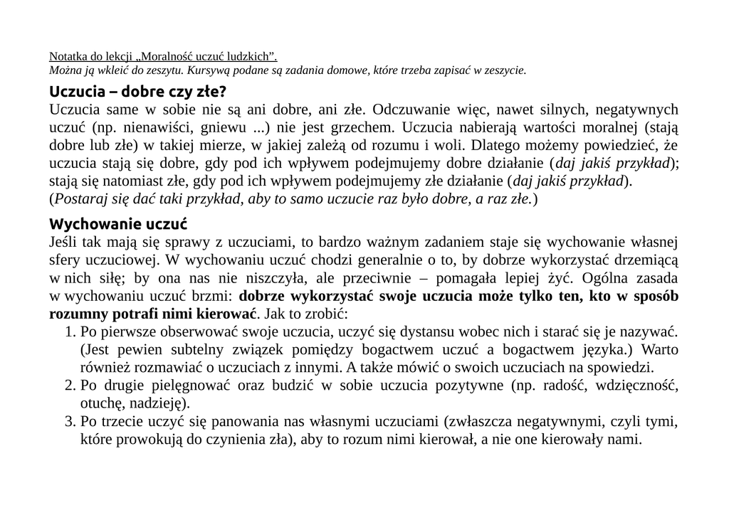 Notatka do lekcji „Moralność uczuć ludzkich”. Można ją wkleić do zeszytu. Kursywą podane są zadania domowe, które trzeba zapisać w zeszycie. Uczucia – dobre czy złe? Uczucia same w sobie nie są ani dobre, ani złe. Odczuwanie więc, nawet silnych, negatywnych uczuć (np. nienawiści, gniewu ...) nie jest grzechem. Uczucia nabierają wartości moralnej (stają dobre lub złe) w takiej mierze, w jakiej zależą od rozumu i woli. Dlatego możemy powiedzieć, że uczucia stają się dobre, gdy pod ich wpływem podejmujemy dobre działanie (daj jakiś przykład); stają się natomiast złe, gdy pod ich wpływem podejmujemy złe działanie (daj jakiś przykład). (Postaraj się dać taki przykład, aby to samo uczucie raz było dobre, a raz złe.) Wychowanie uczuć Jeśli tak mają się sprawy z uczuciami, to bardzo ważnym zadaniem staje się wychowanie własnej sfery uczuciowej. W wychowaniu uczuć chodzi generalnie o to, by dobrze wykorzystać drzemiącą w nich siłę; by ona nas nie niszczyła, ale przeciwnie – pomagała lepiej żyć. Ogólna zasada w wychowaniu uczuć brzmi: dobrze wykorzystać swoje uczucia może tylko ten, kto w sposób rozumny potrafi nimi kierować. Jak to zrobić: 1. Po pierwsze obserwować swoje uczucia, uczyć się dystansu wobec nich i starać się je nazywać. (Jest pewien subtelny związek pomiędzy bogactwem uczuć a bogactwem języka.) Warto również rozmawiać o uczuciach z innymi. A także mówić o swoich uczuciach na spowiedzi. 2. Po drugie pielęgnować oraz budzić w sobie uczucia pozytywne (np. radość, wdzięczność, otuchę, nadzieję). 3. Po trzecie uczyć się panowania nas własnymi uczuciami (zwłaszcza negatywnymi, czyli tymi, które prowokują do czynienia zła), aby to rozum nimi kierował, a nie one kierowały nami.