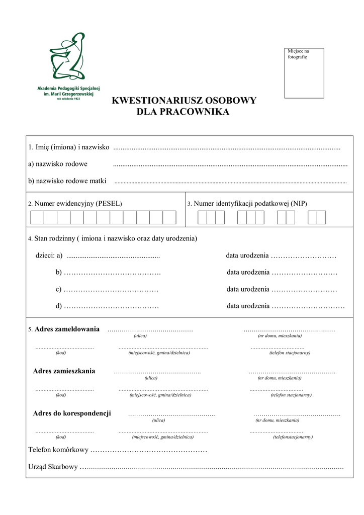 KWESTIONARIUSZ OSOBOWY DLA PRACOWNIKA