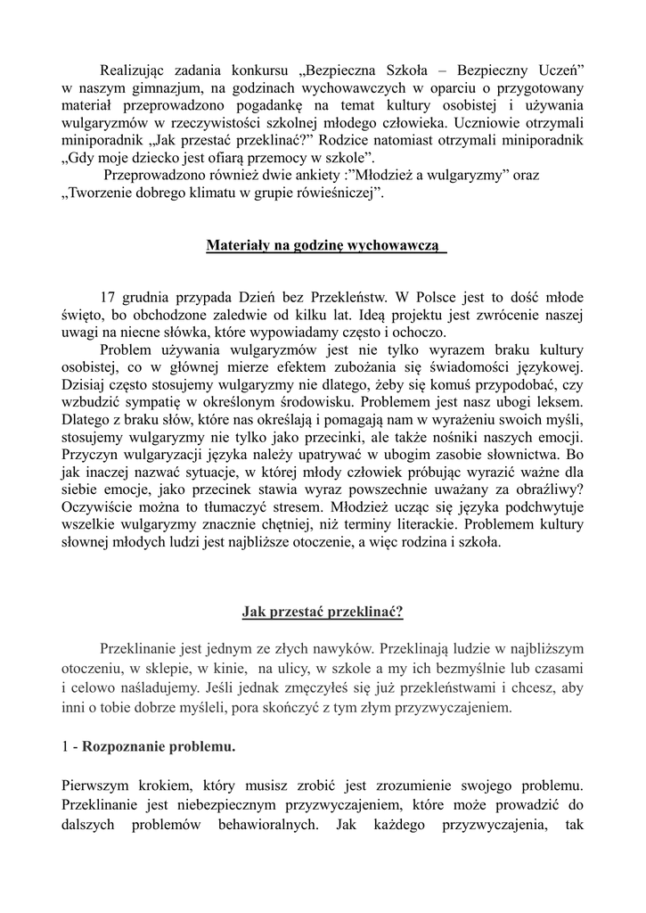 Realizując zadania konkursu „Bezpieczna Szkoła – Bezpieczny Uczeń” w naszym gimnazjum, na godzinach wychowawczych w oparciu o przygotowany materiał przeprowadzono pogadankę na temat kultury osobistej i używania wulgaryzmów w rzeczywistości szkolnej młodego człowieka. Uczniowie otrzymali miniporadnik „Jak przestać przeklinać?” Rodzice natomiast otrzymali miniporadnik „Gdy moje dziecko jest ofiarą przemocy w szkole”. Przeprowadzono również dwie ankiety :”Młodzież a wulgaryzmy” oraz „Tworzenie dobrego klimatu w grupie rówieśniczej”. Materiały na godzinę wychowawczą 17 grudnia przypada Dzień bez Przekleństw. W Polsce jest to dość młode święto, bo obchodzone zaledwie od kilku lat. Ideą projektu jest zwrócenie naszej uwagi na niecne słówka, które wypowiadamy często i ochoczo. Problem używania wulgaryzmów jest nie tylko wyrazem braku kultury osobistej, co w głównej mierze efektem zubożania się świadomości językowej. Dzisiaj często stosujemy wulgaryzmy nie dlatego, żeby się komuś przypodobać, czy wzbudzić sympatię w określonym środowisku. Problemem jest nasz ubogi leksem. Dlatego z braku słów, które nas określają i pomagają nam w wyrażeniu swoich myśli, stosujemy wulgaryzmy nie tylko jako przecinki, ale także nośniki naszych emocji. Przyczyn wulgaryzacji języka należy upatrywać w ubogim zasobie słownictwa. Bo jak inaczej nazwać sytuacje, w której młody człowiek próbując wyrazić ważne dla siebie emocje, jako przecinek stawia wyraz powszechnie uważany za obraźliwy? Oczywiście można to tłumaczyć stresem. Młodzież ucząc się języka podchwytuje wszelkie wulgaryzmy znacznie chętniej, niż terminy literackie. Problemem kultury słownej młodych ludzi jest najbliższe otoczenie, a więc rodzina i szkoła. Jak przestać przeklinać? Przeklinanie jest jednym ze złych nawyków. Przeklinają ludzie w najbliższym otoczeniu, w sklepie, w kinie, na ulicy, w szkole a my ich bezmyślnie lub czasami i celowo naśladujemy. Jeśli jednak zmęczyłeś się już przekleństwami i chcesz, aby inni o tobie dobrze myśleli, pora skończyć z tym złym przyzwyczajeniem. 1 - Rozpoznanie problemu. Pierwszym krokiem, który musisz zrobić jest zrozumienie swojego problemu. Przeklinanie jest niebezpiecznym przyzwyczajeniem, które może prowadzić do dalszych problemów behawioralnych. Jak każdego przyzwyczajenia, tak i przeklinania jest bardzo ciężko się oduczyć. Dlatego tak ważne jest uzmysłowienie sobie swojego problemu. Masz problem jeśli: wypowiadając się co drugie słowo używasz wulgaryzmu, - wydaje ci się, że najfajniejszym sposobem odzywania się do kumpla, rodzica, nauczyciela czy dziewczyny jest dodanie do całego zdania jakiegoś przekleństwa. - Nie wiesz jak wyrazić swoje uczucia i spostrzeżenia bez użycia brzydkich słów. 2 - Zrozum dlaczego przeklinasz. Przeklinasz ponieważ przebywasz z osobami, które nie za bardzo lubią to co robią i przeklinanie jest sposobem wyrażenia swojej niechęci? Ponieważ twoi kumple mówią w taki sposób cały czas? Przeklinasz ponieważ buntujesz się przeciwko rodzicom czy nauczycielom? Ponieważ jesteś zły, smutny lub boisz się, że nie potrafisz się wyrazić w inny sposób? 3 - Dlaczego chcesz przestać przeklinać? Aby przestać przeklinać musisz tego naprawdę chcieć. Jeśli nie jesteś do końca przekonany lub podejdziesz do sprawy z przymrużeniem oka to ci się nie uda. Pomyśl dlaczego życie będzie lepsze jeśli przestaniesz przeklinać. To jest najlepsza droga, aby znaleźć motywację. Powody napisz na kartce. 4 - Przysięgnij sobie, że nie będziesz już przeklinać. Łatwiej powiedzieć niż wykonać ponieważ wymaga to stałego wysiłku. Na początek możesz zaplanować jakiś określony okres czasu bez przeklinania np. jeden dzień lub weekend. Napisz na kartce: Dlaczego przeklinasz (powody dla których to robisz) - Dlaczego chcesz przestać przeklinać (lepsza komunikacja, lepsza samopoczucie, lepsze relacje z innymi ludźmi, jaśniejszy pogląd na życie itp). - Sytuacje w których przeklinasz (np. złość, nie lubiana lekcja, muzyka, programy w TV, kłótnia z dziewczyną/chłopakiem, zła ocena ...). - Sposoby unikania sytuacji w których przeklinasz (np. nie słuchanie muzyki w której słowa stanowią mieszankę wyzwisk i przekleństw, technika głębokiego oddychania podczas kłótni z rodzicami/ dziewczyną/ chłopakiem zamiast rzucania przekleństw). 5 - Lepiej się wyrażaj. Cywilizowana rozmowa nie zawiera żadnych przekleństw czy wulgaryzmów. Język polski zawiera mnóstwo użytecznych i pięknych przymiotników, dzięki którym można wypełnić rozmowę. Jeśli ich nie używasz, wówczas ograniczasz własne umiejętności jasnego i precyzyjnego wyrażania swoich uczuć i myśli innych ludzi, co w ostateczności powoduje, że jesteś mniej rozumiany przez ludzi wokół ciebie. Jeśli przyłapiesz się na tym, że masz ochotę użyć wulgaryzmu postaraj się szybko wymyślić inne słowo, które lepiej odzwierciedlałoby twoje emocje czy uczucia. 6 - Weź na siebie odpowiedzialność. Niektórym ludziom może się to nie podobać, że nagle się zmieniłeś. Mogą czuć się oni zagrożeni lub w pewien sposób zazdrośni. Wyjaśnij im, że jest to twoja osobista decyzja i że nie wymagasz od nich, aby i oni zmienili swój sposób wysławiania się. W długim okresie czasu może się okazać, że twoja zmiana im zaimponowała i z czasem sami zaczną cię naśladować. 7 - Poproś o wsparcie. Poproś o pomoc nie przeklinających znajomych, przyjaciół i członków rodziny. Powiedz im, że zdałeś sobie sprawę ze swojego problemu i chcesz się zmienić. Poproś, aby ci zwracali uwagę jeśli przypadkowo użyjesz wulgaryzmu itp. 8 - Znajdź podobne słowa lub zwroty. Pomyśl o mniej obraźliwych słowach, których możesz użyć zamiast przekleństw. Zrób sobie listę takich słów a następnie zacznij ich używa
