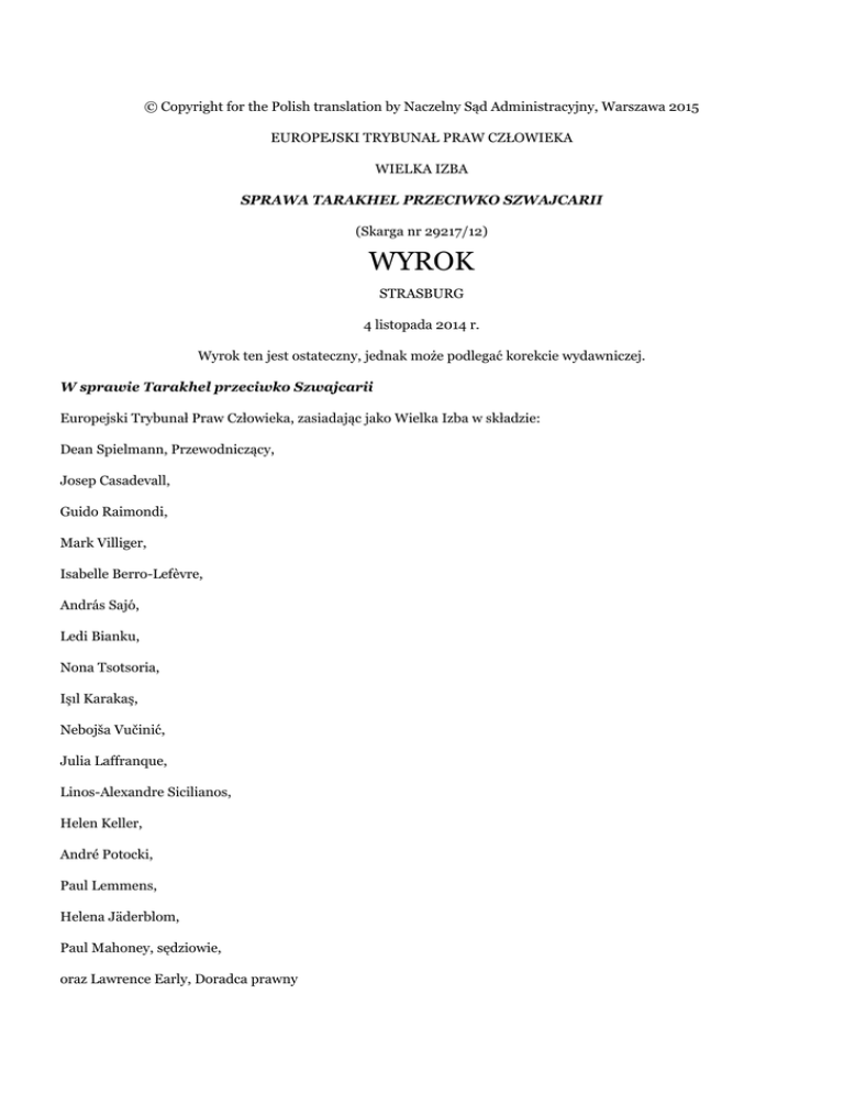 © Copyright for the Polish translation by Naczelny Sąd Administracyjny, Warszawa 2015 EUROPEJSKI TRYBUNAŁ PRAW CZŁOWIEKA WIELKA IZBA SPRAWA TARAKHEL PRZECIWKO SZWAJCARII (Skarga nr 29217/12) WYROK STRASBURG 4 listopada 2014 r. Wyrok ten jest ostateczny, jednak może podlegać korekcie wydawniczej. W sprawie Tarakhel przeciwko Szwajcarii Europejski Trybunał Praw Człowieka, zasiadając jako Wielka Izba w składzie: Dean Spielmann, Przewodniczący, Josep Casadevall, Guido Raimondi, Mark Villiger, Isabelle Berro-Lefèvre, András Sajó, Ledi Bianku, Nona Tsotsoria, Işıl Karakaş, Nebojša Vučinić, Julia Laffranque, Linos-Alexandre Sicilianos, Helen Keller, André Potocki, Paul Lemmens, Helena Jäderblom, Paul Mahoney, sędziowie, oraz Lawrence Early, Doradca prawny Obradując na posiedzeniu niejawnym 12 lutego i 10 września 2014 r., wydaje następujący wyrok, który został przyjęty we wskazanym wyżej dniu: POSTĘPOWANIE 1. Sprawa wywodzi się ze skargi (skarga nr 29217/12) wniesionej do Trybunału dnia 10 maja 2012 r. przeciwko Konfederacji Szwajcarskiej na mocy art. 34 Konwencji o ochronie praw człowieka i podstawowych wolności („Konwencji”) przez ośmiu obywateli afgańskich (zwanych łącznie „skarżącymi”), p. Golajana Tarakhela (“pierwszy skarżący”), ur. w 1971 r., jego żony p. Maryam Habibi (“druga skarżąca”), ur. w 1981 r., oraz ich sześcioro małoletnich dzieci: Arezoo, ur. w 1999 r., Mohammada, ur. w 2001 r., Nazanin, ur. 2003 r., Shiba, ur. w 2005 r, Zeynab, ur. w 2008 r., oraz Amira Hassana, ur. w 2012 r., zamieszkałych w Lozannie. 2. Skarżący byli reprezentowani przez p. Chloé Bregnard Ecoffey, działającą w imieniu Służby Pomocy Prawnej dla Wychodźców (Service d’Aide Juridique aux Exilés – SAJE). Rząd Szwajcarski („Rząd”) był reprezentowany przez Pełnomocnika, p. Franka Schürmanna, Szefa Wydziału Międzynarodowej Ochrony Praw Człowieka Federalnego Biura Sprawiedliwości. 3. W oparciu o art. 3 i 8 Konwencji skarżący podnieśli przede wszystkim, że w przypadku odesłania ich do Włoch, zostaliby narażeni na nieludzkie i poniżające traktowanie z powodu ryzyka nieotrzymania zakwaterowania lub otrzymania zakwaterowania w nieludzkich i poniżających warunkach. Ryzyko to wynikało według nich z braku indywidualnych gwarancji co do ewentualnej opieki nad nimi wobec uchybień systemowych w organizacji przyjmowania osób ubiegających się o azyl we Włoszech. Na podstawie art. 13 i 3 Konwencji skarżący podnieśli także, że władze szwajcarskie nie uwzględniły należycie ich okoliczności osobistych i nie wzięły pod uwagę ich sytuacji jako rodziny. 4. W dniu 25 czerwca 2012 r. Rząd otrzymał zawiadomienie o złożeniu skargi. 5. W dniu 24 września 2013 r. Izba, do której skarga została przypisana, w składzie Guido Raimondi, Danutė Jočienė, Peer Lorenzen, András Sajó, Işıl Karakaş, Nebojša Vučinić i Helen Keller, sędziowie, oraz Stanley Naismith, Kanclerz Sekcji, zrzekła się właściwości na rzecz Wielkiej Izby, co zostało skonsultowane ze stronami, które nie wyraziły w tej sprawie sprzeciwu (art. 30 Konwencji i art. 72 Regulaminu Trybunału). Skład Wielkiej Izby został ustalony zgodnie z przepisami art. 26 §§ 4 i 5 Konwencji i art. 24 Regulaminu Trybunału. Na posiedzeniu końcowym Paul Lemmens i Nona Tsotsoria, sędziowie substytuci, zastąpili Inetę Ziemele oraz Peera Lorenzena, którzy nie mogli wziąć udziału w dalszym rozpatrywaniu niniejszej sprawy (art. 24 § 3 Regulaminu). 6. Skarżący i Rząd przedłożyli pisemne uwagi co do dopuszczalności i zasadności skargi (art. 59 § 1 Regulaminu). Uwagi przedłożyły również Rządy Włoch, Holandii, Szwecji, Norwegii i Zjednoczonego Królestwa oraz organizacja Defence for Children, Centre for Advice on Individual Rights in Europe (“AIRE Centre”), Rada Europejska ds. Uchodźców i Wychodźstwa („ECRE”) oraz Amnesty International, które otrzymały zezwolenie od Przewodniczącego Trybunału na interwencję w procedurze pisemnej (art. 36 § 2 Konwencji i art. 44 § 3 Regulaminu Trybunału). Do uczestnictwa w procedurze ustnej został zaproszony także Rząd Włoch. 7. Sprawa została rozpatrzona na publicznej rozprawie w budynku Europejskiego Trybunału Praw Człowieka w Strasburgu w dniu 12 lutego 2014 r. (art. 59 § 3 Regulaminu Trybunału). Przed Trybunałem stanęli: (a) ze strony Rządu P. F. SCHÜRMANN, Szef Wydziału Międzynarodowej Ochrony Praw Człowieka, Federalne Biuro Sprawiedliwości, Federalny Departament Policji i Sprawiedliwości, Pełnomocnik, P. B. DUBEY, Zastępca Szefa Wydziału Koordynacji Prawa Europejskiego i Schengen/Dublin, Federalne Biuro Sprawiedliwości, Federalny Departament Policji i Sprawiedliwości, Radca prawny, P. D. STEIGER LEUBA, Doradca Techniczny, Wydział Międzynarodowej Ochrony Praw Człowieka, Federalne Biuro Sprawiedliwości, Federalny Departament Policji i Sprawiedliwości, Radca prawny, P. J. HORNI, Zastępca Szefa Wydziału, Wydział Procedury Dublińskiej, Federalne Biuro ds. Migracji, Federalny Departament Policji i Sprawiedliwości, Radca prawny, P. V. HOFER, oficer łącznikowy ds. „dublińskich” z włoskim Ministerstwem Spraw Wewnętrznych, Federalne Biuro ds. Migracji, Federalny Departament Policji i Sprawiedliwości, Radca prawny; (b) ze strony skarżących P. C. BREGNARD ECOFFEY, Szef SAJE, Radca prawny, P. K. POVLAKIC, Doradca; (c) ze strony Rządu Włoch (trzecia strona) P. P. ACCARDO, Radca prawny, P. G. MAURO PELLEGRINI, Przedstawiciel. Trybunał wysłuchał wystąpień p. Schürmanna, p. Horniego, p. Bregnard Ecoffey, p. Povlakic i p. Accardo oraz ich odpowiedzi na pytania zadane przez sędziów. FAKTY I. OKOLICZNOŚCI SPRAWY 8. Okoliczności sprawy można podsumować w sposób przedstawiony poniżej. 9. W nieustalonym terminie pierwszy skarżący opuścił Afganistan, udając się do Pakistanu, gdzie spotkał i poślubił drugą skarżącą. Para następ