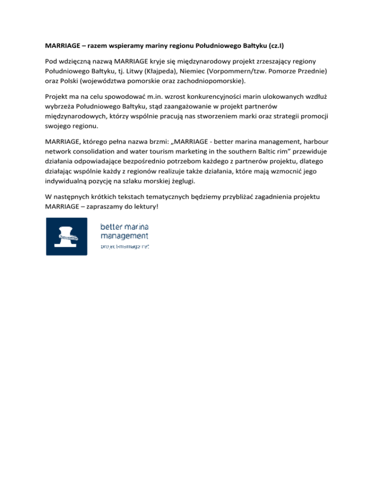 MARRIAGE – razem wspieramy mariny regionu Południowego Bałtyku (cz.I) (cz.I Pod wdzięczną nazwą MARRIAGE kryje się międzynarodowy projekt zrzeszający regiony Południowego Bałtyku, tj. Litwy (Kłajpeda), Niemiec (Vorpommern/tzw. /tzw. Pomorze Przednie) Przednie oraz Polski (województwa pomorskie oraz zachodniopomorskie). Projekt ma na celu spowodować m.in. wzrost konkurencyjności marin ulokowanych wzdłuż wybrzeża Południowego Bałtyku, stąd zaangażowanie w projekt partnerów międzynarodowych, którzy wspólnie pracują nas stworzeniem zeniem marki oraz strategii promocji swojego regionu. MARRIAGE, którego pełna nazwa brzmi: „MARRIAGE - better etter marina management, harbour network consolidation and water tourism marketing in the southern Baltic rim” przewiduje działania odpowiadające bezpośrednio bezpośrednio potrzebom każdego z partnerów projektu, dlatego działając wspólnie każdy z regionów realizuje także działania, które mają wzmocnić jego indywidualną pozycję na szlaku morskiej żeglugi. W następnych krótkich tekstach tematycznych będziemy przybliżać zagadnienia projektu MARRIAGE – zapraszamy do lektury! MARRIAGE – razem wspieramy mariny regionu Południowego Bałtyku (cz.II) (cz.II MARRIAGE jest projektem realizowanym w tzw. konsorcjum, onsorcjum, które w chwili obecnej tworzy 11 partnerów (partners) oraz 10 tzw. organizacji zrzeszonych (associated organisations). Konsorcjum zrzesza zesza podmioty powiązane tematycznie z obszarem turystyki wodnej, włączając w to publicznych i prywatnych operatorów marin, z których jedni dzielą się z pozostałymi swoimi doświadczeniami doświadcze w zakresie zarządzania ządzania infrastrukturą portową, drudzy natomiast uczą się nimi efektywnie zarządzać i je rozwijać. Siłą projektu oraz jego niewątpliwym atutem jest wsparcie merytoryczne wspomnianych prywatnych operatorów marin, którzy jako zewnętrzni eksperci towarzyszą partnerom projektu w trakcie jego realizacji. Transfer wiedzy, o którym mowa odbywa się jak zazwyczaj „z Zachodu na Wschód”, w tym wypadku wędrując wędrując z Niemiec, od największego prywatnego operatora marin niemieckich – braci Tilla i Hansa Jaich (Im Jaich). Projekt MARRIAGE jest długofalowym przedsięwzięciem, przedsię które rozpoczęte w październiku 2011 r. zakończy się dopiero we wrześniu 2014 r. Zapraszamy wkrótce do lektury następnego tekstu przybliżającego nasz projekt! MARRIAGE – razem wspieramy mariny regionu Południowego Bałtyku (cz.III) (cz.III Projekt MARRIAGE realizowany jest dzięki współfinansowaniu Programu Współpracy Transgranicznej Południowy Bałtyk 2007-2013, 2013, którego celem jest m.in. wsparcie współpracy regionów Południowego Bałtyku, yku, na różnej niwie tematycznej. Program wspiera współpracę międzynarodową, dlatego też projekty realizowane w ramach Południowego Bałtyku są z natury projektami ponadnarodowymi, budującymi więzi między regionami, sieci tematyczne oraz wspólną politykę regionów gionów Południowego Bałtyku w ramach podejmowanych zagadnień tematycznych. W powyższym kontekście projekt MARRIAGE odwołuje się do kwintesencji regionu Południowego Bałtyku, do rozwoju oraz promocji wybrzeża morskiego oraz w ich konsekwencji do rozwoju turystycznej ystycznej żeglugi morskiej. Więcej informacji dostępnych jest pod linkiem: http://en.southbaltic.eu. MARRIAGE – razem wspieramy mariny regionu Południowego Bałtyku (cz.IV) (cz.IV Rozwój turystyki morskiej w obszarze Południowego Bałtyku w ramach projektu MARRIAGE ma zostać osiągnięty dzięki prowadzonym równolegle działaniom z zakresu promocji, transferu wiedzy oraz budowy sieci marin w regionie. Promocja wybrzeża Południowego Bałtyku ma oprzeć się na uwydatnianiu nianiu regionalnej różnorodności i tym samym atrakcyjności krajów partnerskich projektu, projektu, tj. Niemiec, Polski, Litwy i Rosji, przy jednoczesnym wykorzystaniu ich wzajemnego, sąsiedzkiego (w pewien sposób) położenia. Łączy nas Morze Bałtyckie, to zdają się chcieć chcieć przekazać partnerzy projektu MARRIAGE. W przyszłości dzięki aktualnie podejmowanym pracom projektowym być może będziemy świadkami uprawomocnienia żeglarskiego pasa turystycznego wzdłuż wybrzeża Południowego Bałtyku, który nie tylko wesprze rozwój naszego naszego regionu, lecz także przyczyni się do promocji żeglarstwa między granicami państw. Wszystko to Niemcy, Polska, Litwa i Rosja razem wzięte próbują aktualnie osiągnąć dzięki wspólnie rozwijanym środkom om promocji – aplikacji web, broszurom informacyjnym w językach narodowych partnerów projektu, wizytach studyjnych dla dziennikarzy, wspólnych akcjach marketingowych, jak np. uczestnictwo w targach turystycznych w Hamburgu czy Berlinie pod wspólnym szyldem regionu Południowego Bałtyku. Oczywiście promocja to tylko jedno z działań projektu MARRIAGE. Opis następnych znajdziecie w kolejnej odsłonie naszego projektu. MARRIAGE – razem wspieramy mariny regionu Południowego Bałtyku (cz.V) (cz.V Transfer wiedzyy między regionami Południowego Bałtyku, wspomniany spomniany w poprzednim p tekściee dotyczącym projektu MARRIAGE dotyczy m.in. wsparcia udzielanego w projekcie Polsce oraz Litwie w zakresie zarządzania za marinami, prowadzonemu przez doświadczonych operatorów marin niemieckich. Ostatnim wykorzystywanym w projekcie narzędziem narzędziem realizacji celów projektu jest budowa sieci marin, bazująca ująca na innowacyjnym podejściu, pod w którym transfer wiedzy dotyczący innowacyjnych form zarządzania marinami przekazywanymi sobie nawzajem między partnerami projektu ma doprowadzić oprowadzić do momentu, w którym po wygaśnięciu lub zmniejszeniu finansowego wsparcia publicznego mariny będą w stanie dalej efektywnie funkcjonować, realizując swoje cele. Działania opisywane w kolejnych odsłonach publikowanych przez nas t