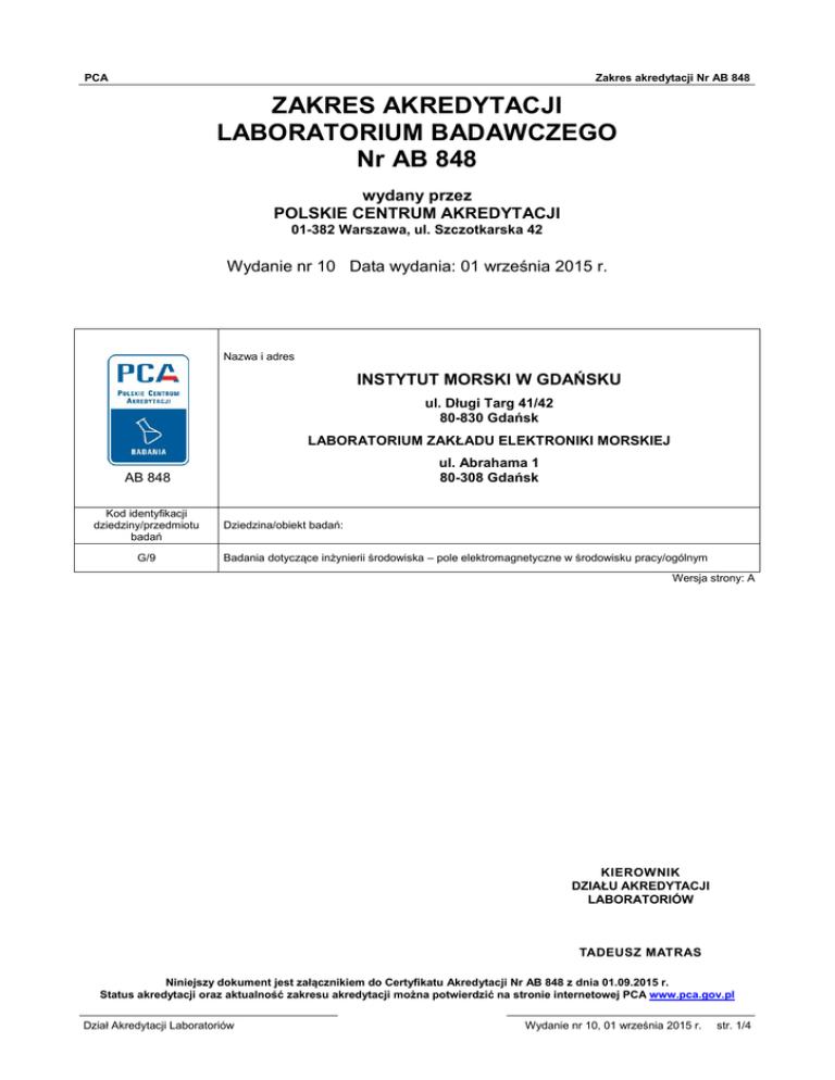 PCA Zakres akredytacji Nr AB 848 ZAKRES AKREDYTACJI LABORATORIUM BADAWCZEGO Nr AB 848 wydany przez POLSKIE CENTRUM AKREDYTACJI 01-382 Warszawa, ul. Szczotkarska 42 Wydanie nr 10 Data wydania: 01 września 2015 r. Nazwa i adres INSTYTUT MORSKI W GDAŃSKU ul. Długi Targ 41/42 80-830 Gdańsk LABORATORIUM ZAKŁADU ELEKTRONIKI MORSKIEJ ul. Abrahama 1 80-308 Gdańsk AB 848 Kod identyfikacji dziedziny/przedmiotu badań G/9 Dziedzina/obiekt badań: Badania dotyczące inżynierii środowiska – pole elektromagnetyczne w środowisku pracy/ogólnym Wersja strony: A KIEROWNIK DZIAŁU AKREDYTACJI LABORATORIÓW TADEUSZ MATRAS Niniejszy dokument jest załącznikiem do Certyfikatu Akredytacji Nr AB 848 z dnia 01.09.2015 r. Status akredytacji oraz aktualność zakresu akredytacji można potwierdzić na stronie internetowej PCA www.pca.gov.pl Dział Akredytacji Laboratoriów Wydanie nr 10, 01 września 2015 r. str. 1/4 PCA Zakres akredytacji Nr AB 848 Przedmiot badań/wyrób Środowisko pracy – pole elektromagnetyczne Laboratorium Zakładu Elektroniki Morskiej ul. Abrahama 1, 80-308 Gdańsk Rodzaj działalności/badane Dokumenty odniesienia cechy/metoda Natężenie pola elektrycznego PN-T-06580-3:2002 w paśmie częstotliwości: - (20 – 1000) Hz Zakres: (0,3 – 25) kV/m - (1 – 500) kHz Zakres: (3 – 1000) V/m - (0,1 – 700) MHz Zakres: (1 – 1000) V/m - 0,1 MHz – 3 GHz Zakres: (0,4 – 800) V/m - (3 – 18) GHz Zakres: (0,8 – 1000) V/m - (18 – 60) GHz Zakres: (1,2 – 250) V/m - 300 MHz – 50 GHz Zakres: (7 – 400) V/m Metoda pomiarowa bezpośrednia Natężenie pola magnetycznego w paśmie częstotliwości: - (40 – 1000) Hz Zakres: (2,4 – 1200) A/m - (0,8 – 100) kHz Zakres: (3 – 426) A/m - 100 kHz – 10 MHz Zakres: (0,01 – 250) A/m - 10 MHz – 30 MHz Zakres: (0,01 – 20) A/m - 27 MHz – 1 GHz Zakres: (0,05 – 6) A/m Metoda pomiarowa bezpośrednia - 1 GHz – 3 GHz (z obliczeń) Wersja strony: A Dział Akredytacji Laboratoriów Wydanie nr 10, 01 września 2015 r. str. 2/4 PCA Zakres akredytacji Nr AB 848 Przedmiot badań/wyrób Środowisko ogólne – pole elektromagnetyczne Rodzaj działalności/badane cechy/metoda Natężenie pola elektrycznego w paśmie częstotliwości: - (20 – 1000) Hz Zakres: (0,3 – 25) kV/m - (1 – 500) kHz Zakres: (3 – 1000) V/m - (0,1 – 700) MHz Zakres: (1 – 1000) V/m - 0,1 MHz – 3 GHz Zakres: (0,4 – 800) V/m - (3 – 18) GHz Zakres: (0,8 – 1000) V/m - (18 – 60) GHz Zakres: (1,2 – 250) V/m - 300 MHz – 50 GHz Zakres: (7 – 400) V/m Metoda pomiarowa bezpośrednia Natężenie pola magnetycznego w paśmie częstotliwości: - (40 – 1000) Hz Zakres: (2,4 – 1200) A/m - (0,8 – 100) kHz Zakres: (3 – 426) A/m - 100 kHz – 3 MHz Zakres: (0,01 – 250) A/m Gęstość mocy w paśmie częstotliwości: - 300 MHz – 50 GHz Zakres: (0,13 – 424,4) W/m2 - 300 MHz – 60 GHz Zakres: 2,6 mW/m2 – 165,78 W/m2 (z obliczeń) Dokumenty odniesienia Rozporządzenie Ministra Środowiska z dnia 30.10.2003 r. (Dz.U. 2003 nr 192 poz.1883) Wersja strony: A Dział Akredytacji Laboratoriów Wydanie nr 10, 01 września 2015 r. str. 3/4 PCA Zakres akredytacji Nr AB 848 Wykaz zmian Zakresu Akredytacji Nr AB 848 Status zmian: wersja pierwotna – A Zatwierdzam status zmian KIEROWNIK DZIAŁU AKREDYTACJI LABORATORIÓW TADEUSZ MATRAS dnia: 01.09.2015 r. Dział Akredytacji Laboratoriów Wydanie nr 10, 01 września 2015 r. str. 4/4