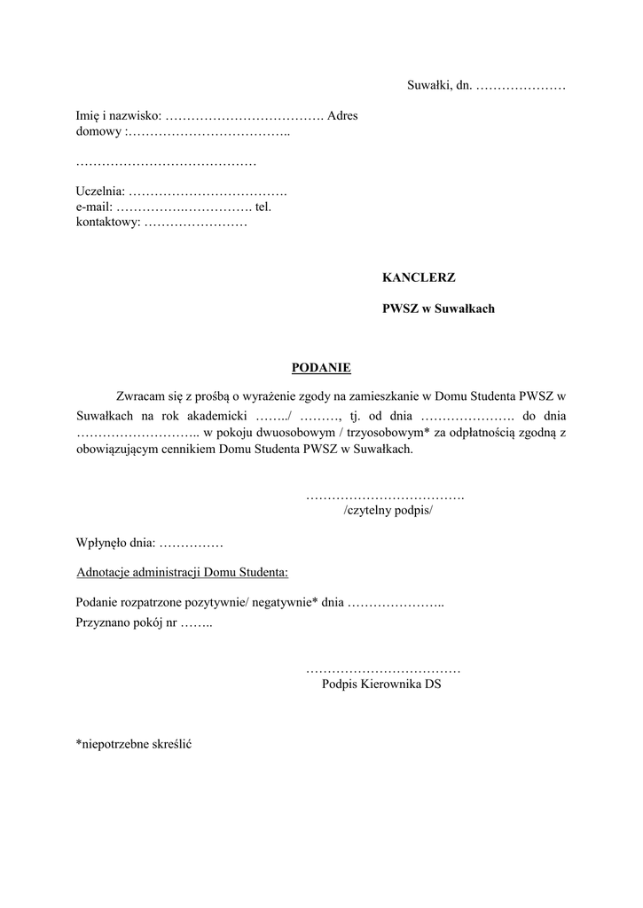 Suwałki, dn. ………………… Imię i nazwisko: ………………………………. Adres domowy :……………………………….. …………………………………… Uczelnia: ………………………………. e-mail: …………….……………. tel. kontaktowy: …………………… KANCLERZ PWSZ w Suwałkach PODANIE Zwracam się z prośbą o wyrażenie zgody na zamieszkanie w Domu Studenta PWSZ w Suwałkach na rok akademicki ……../ ………, tj. od dnia …………………. do dnia ……………………….. w pokoju dwuosobowym / trzyosobowym* za odpłatnością zgodną z obowiązującym cennikiem Domu Studenta PWSZ w Suwałkach. ………………………………. /czytelny podpis/ Wpłynęło dnia: …………… Adnotacje administracji Domu Studenta: Podanie rozpatrzone pozytywnie/ negatywnie* dnia ………………….. Przyznano pokój nr …….. ……………………………… Podpis Kierownika DS *niepotrzebne skreślić