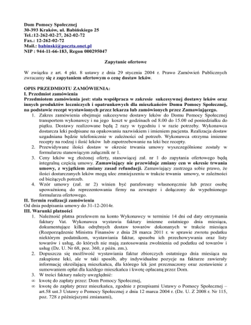Dom Pomocy Społecznej 30-393 Kraków, ul. Babińskiego 25 Tel.:12-262-02-27, 262-02-72 Fax.: 12-262-02-72 Mail.: [email protected] NIP : 944-11-66-183, Regon 000295047 Zapytanie ofertowe W związku z art. 4 pkt. 8 ustawy z dnia 29 stycznia 2004 r. Prawo Zamówień Publicznych zwracamy się z zapytaniem ofertowym o cenę dostaw leków. OPIS PRZEDMIOTU ZAMÓWIENIA: I. Przedmiot zamówienia Przedmiotem zamówienia jest: stała współpraca w zakresie sukcesywnej dostawy leków oraz innych produktów leczniczych i opatrunkowych dla mieszkańców Domu Pomocy Społecznej, na podstawie recept wystawionych przez lekarza lub zamówionych przez Zamawiającego. 1. Zakres zamówienia obejmuje sukcesywne dostawy leków do Domu Pomocy Społecznej transportem wykonawcy i na jego koszt w godzinach od 8.00 do 15.00 od poniedziałku do piątku. Dostawy realizowane będą 2 razy w tygodniu i w razie potrzeby. Wykonawca dostarcza leki podpisane na opakowaniu nazwiskiem i imieniem pacjenta. Realizacja dostaw uzgadniana będzie telefonicznie w zależności od potrzeb. Wykonawca otrzyma imienne recepty na rodzaj i ilość leków lub zapotrzebowanie na leki bez recepty. 2. Przewidywane ilości dostaw w okresie trwania umowy wyszczególnione zostały w formularzu stanowiącym załącznik nr 1. 3. Ceny leków wg złożonej oferty, stanowiącej zał. nr 1 do zapytania ofertowego będą integralną częścią umowy. Zamawiający nie przewiduje zmiany cen w okresie trwania umowy, z wyjątkiem zmiany zasad refundacji. Zamawiający zastrzega sobie prawo, że ilości dostarczanych leków mogą ulec zmniejszeniu w trakcie trwania umowy, w zależności od bieżących potrzeb. 4. Wzór umowy (zał. nr 2) winien być parafowany własnoręcznie lub przez osobę upoważnioną do reprezentowania firmy na zewnątrz i dołączony do wypełnionego formularza ofertowego. II. Termin realizacji zamówienia Od dnia podpisania umowy do 31-12-2014r. III. Warunki płatności 1. Należność płatna przelewem na konto Wykonawcy w terminie 14 dni od daty otrzymania faktury Vat. Wykonawca wystawia faktury imienne ostatniego dnia miesiąca, dokumentujące kilka odrębnych dostaw towarów dokonanych w trakcie miesiąca (Rozporządzenie Ministra Finansów z dnia 28 marca 2011 r. w sprawie zwrotu podatku niektórym podatnikom, wystawiania faktur, sposobu ich przechowywania oraz listy towarów i usług, do których nie mają zastosowania zwolnienia od podatku od towarów i usług (Dz. U. Nr 68, poz. 360, z późn. zm.). 2. Dopuszcza się możliwość wystawiania faktur zbiorczych ostatniego dnia miesiąca na zakupione leki, ale w taki sposób, aby indywidualne pozycje na fakturze zawierały informację określającą mieszkańca, dla którego lek jest przeznaczony oraz zestawienie z sumowaniem opłat dla każdego mieszkańca i kwotę opłacaną przez Dom. 3. W treści faktury należy uwzględnić: • kwotę do zapłaty przez: Dom Pomocy Społecznej, • kwotę do zapłaty przez mieszkańca, zgodnie z przepisami Ustawy o Pomocy Społecznej – art.58 ust.3 Ustawy o Pomocy Społecznej z dnia 12 marca 2004 r. (Dz. U. Z 2008 r. Nr 115, poz. 728 z późniejszymi zmianami), • w przypadku, gdy za leki płaci Dom: informację, że cena leku nie przekracza limitu ceny, o której mowa w art. 58 ust. 3 ustawy o pomocy społecznej. IV. Wskazanie osób uprawnionych do porozumiewania się z wykonawcami Dorota Krasny – pielęgniarka– tel.:12-262-02-27, 12-262-02-72 w. 22 V. Opis sposobu przygotowania oferty 1. Ofertę należy przygotować na formularzu stanowiącym załącznik Nr 1. Wykonawca może złożyć ofertę na własnym formularzu, którego treść i układ graficzny są zgodne z załączonym formularzem. 2. Każdy z wykonawców może złożyć tylko jedną ofertę. Oferta musi być sporządzona w formie pisemnej, czytelnie w sposób trwały oraz podpisana przez osobę upoważnioną do reprezentowania firmy. 3. Wszelkie poprawki muszą być parafowane własnoręcznie przez osobę podpisującą ofertę. VI. Opis sposobu wypełnienia i obliczania ceny oferty 1. Jeżeli ilość leku (produktu farmaceutycznego) w opakowaniu proponowanym przez Wykonawcę będzie inna niż ilość leku zamawianego, Wykonawca koryguje w formularzu ofertowym w taki sposób, aby zgadzała się końcowa ilość leku zamówionego, tzn. Wykonawca oferuje taką samą ilość jednostek (np. tabletek, ampułek) środka farmaceutycznego, jaką zażądał Zamawiający. 2. Zamawiający dopuszcza dostarczanie leków synonimowych (generycznych) pod warunkiem, że będą tożsame z zamawianymi produktami farmaceutycznymi, tj. będą miały tą samą nazwę chemiczną oraz dawkę. 2. Wykonawca w formularzu ofertowym w rubryce „Równoważnik/zamiennik” wpisze nazwę handlową wycenionego leku oraz ilość jednostek w opakowaniu, lub pozostawia pustą jeżeli nazwa leku wycenianego odpowiada nazwie podanej przez Zamawiającego. W pozostałe pozycje należy wpisać cenę leku lub artykułu. 3. W sytuacji, kiedy zaprzestano produkcji danego leku, lub lek został wycofany z obrotu i z przyczyn obiektywnych nie można go zastąpić lekiem równoważnym (zamiennikiem), należy w formularzu ofertowym podać informację, że dany preparat nie jest produkowany i nie ma zamienników oraz go nie wyceniać. 4. Oferent może zaproponować tylko jedną cenę na każdy lek i nie może jej zmienić. Przy wyborze oferty Zamawiający będzie kierował się ceną. Z oferentem, który przedstawi najkorzystniejszą ofertę będzie sporządzona umowa. Przed sporządzeniem umowy wybrany oferent dostarczy aktualny dokument dopuszczający go do obrotu prawnego (odpis z właściwego rejestru albo zaświadczenie o wpisie do ewidencji działalności gospodarczej). VII. Powiadomienie 1. Zamawiający powiadomi o wyborze oferenta telefonicznie. VIII. Składanie ofert: 1. Ofertę należy złożyć w terminie do dnia 12.12.2013r. do godziny 14.00 w formie: • pisemnej (osobiście, listownie) na adres: Dom Pom