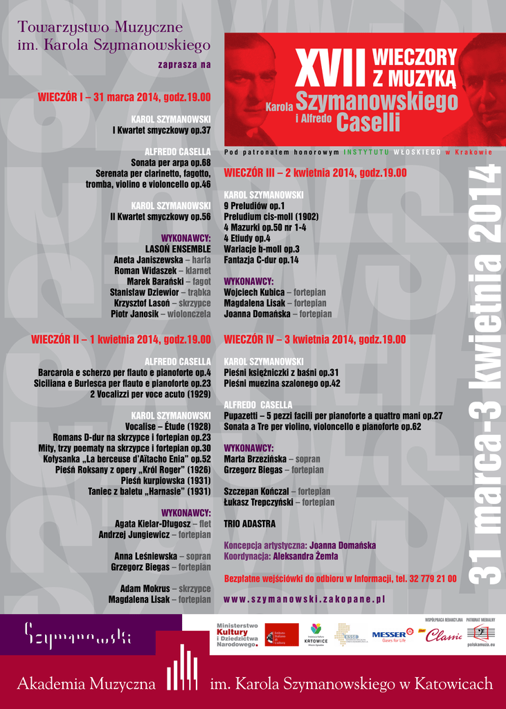 nowsk Szyma Casell nowsk Szyma Casell nowsk Szyma Towarzystwo Muzyczne im. Karola Szymanowskiego Karol Szymanowski I Kwartet smyczkowy op.37 Alfredo Casella Sonata per arpa op.68 Serenata per clarinetto, fagotto, tromba, violino e violoncello op.46 Karol Szymanowski II Kwartet smyczkowy op.56 WYKONAWCY: LASOŃ ENSEMBLE Aneta Janiszewska – harfa Roman Widaszek – klarnet Marek Barański – fagot Stanisław Dziewior – trąbka Krzysztof Lasoń – skrzypce Piotr Janosik – wiolonczela Wieczór II – 1 kwietnia 2014, godz.19.00 Alfredo Casella Barcarola e scherzo per flauto e pianoforte op.4 Siciliana e Burlesca per flauto e pianoforte op.23 2 Vocalizzi per voce acuto (1929) Karol Szymanowski Vocalise – Étude (1928) Romans D-dur na skrzypce i fortepian op.23 Mity, trzy poematy na skrzypce i fortepian op.30 Kołysanka „La berceuse d’Aïtacho Enia” op.52 Pieśń Roksany z opery „Król Roger” (1926) Pieśń kurpiowska (1931) Taniec z baletu „Harnasie” (1931) WYKONAWCY: Agata Kielar-Długosz – flet Andrzej Jungiewicz – fortepian Anna Leśniewska – sopran Grzegorz Biegas – fortepian Adam Mokrus – skrzypce Magdalena Lisak – fortepian Karola i Alfredo Caselli Pod patronatem honorowym Instytutu Włoskiego w Krakowie Wieczór III – 2 kwietnia 2014, godz.19.00 Karol Szymanowski 9 Preludiów op.1 Preludium cis-moll (1902) 4 Mazurki op.50 nr 1-4 4 Etiudy op.4 Wariacje b-moll op.3 Fantazja C-dur op.14 WYKONAWCY: Wojciech Kubica – fortepian Magdalena Lisak – fortepian Joanna Domańska – fortepian Wieczór IV – 3 kwietnia 2014, godz.19.00 Karol Szymanowski Pieśni księżniczki z baśni op.31 Pieśni muezina szalonego op.42 Alfredo Casella Pupazetti – 5 pezzi facili per pianoforte a quattro mani op.27 Sonata a Tre per violino, violoncello e pianoforte op.62 WYKONAWCY: Marta Brzezińska – sopran Grzegorz Biegas – fortepian Szczepan Kończal – fortepian Łukasz Trepczyński – fortepian Trio AdAstra Koncepcja artystyczna: Joanna Domańska Koordynacja: Aleksandra Żemła Bezpłatne wejściówki do odbioru w Informacji, tel. 32 779 21 00 31 marca-3 kwietnia 2014 Wieczór I – 31 marca 2014, godz.19.00 XVII Szymanowskiego Wieczory z muzyką zaprasza na www.szymanowski.zakopane.pl współpraca redakcyjna Patronat medialny