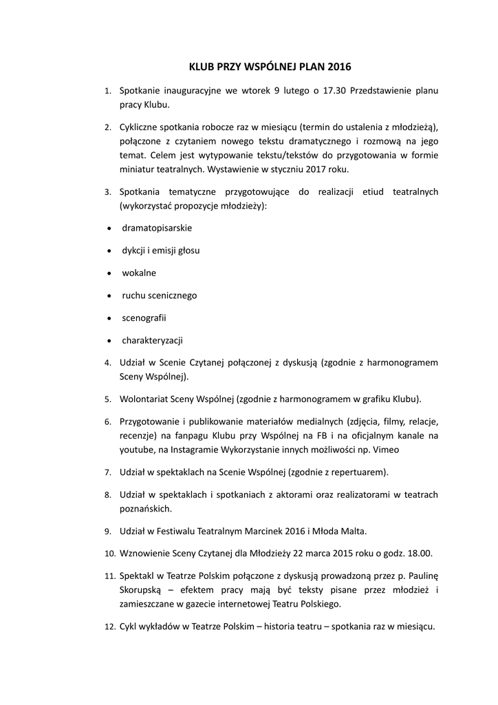 KLUB PRZY WSPÓLNEJ PLAN 2016 1. Spotkanie inauguracyjne we wtorek 9 lutego o 17.30 Przedstawienie planu pracy Klubu. 2. Cykliczne spotkania robocze raz w miesiącu (termin do ustalenia z młodzieżą), połączone z czytaniem nowego tekstu dramatycznego i rozmową na jego temat. Celem jest wytypowanie tekstu/tekstów do przygotowania w formie miniatur teatralnych. Wystawienie w styczniu 2017 roku. 3. Spotkania tematyczne przygotowujące do realizacji etiud teatralnych (wykorzystać propozycje młodzieży): dramatopisarskie dykcji i emisji głosu wokalne ruchu scenicznego scenografii charakteryzacji 4. Udział w Scenie Czytanej połączonej z dyskusją (zgodnie z harmonogramem Sceny Wspólnej). 5. Wolontariat Sceny Wspólnej (zgodnie z harmonogramem w grafiku Klubu). 6. Przygotowanie i publikowanie materiałów medialnych (zdjęcia, filmy, relacje, recenzje) na fanpagu Klubu przy Wspólnej na FB i na oficjalnym kanale na youtube, na Instagramie Wykorzystanie innych możliwości np. Vimeo 7. Udział w spektaklach na Scenie Wspólnej (zgodnie z repertuarem). 8. Udział w spektaklach i spotkaniach z aktorami oraz realizatorami w teatrach poznańskich. 9. Udział w Festiwalu Teatralnym Marcinek 2016 i Młoda Malta. 10. Wznowienie Sceny Czytanej dla Młodzieży 22 marca 2015 roku o godz. 18.00. 11. Spektakl w Teatrze Polskim połączone z dyskusją prowadzoną przez p. Paulinę Skorupską – efektem pracy mają być teksty pisane przez młodzież i zamieszczane w gazecie internetowej Teatru Polskiego. 12. Cykl wykładów w Teatrze Polskim – historia teatru – spotkania raz w miesiącu. KALENDARIUM LUTY Spotkanie inaugurujące 9 lutego 2015 o godz. 17.30. 5.02 – spektakl w Teatrze Polskim „Granica”- spotkanie na temat spektaklu we wtorek o 15.00 w Teatrze Polskim – prowadząca Paulina Skorupska. 6.02 – udział w gościnnym spektaklu „Gęś, śmierć i tulipan” Teatru Baj z Warszawy. Spotkanie z aktorami. 7.02 - udział w spektaklu dyplomowym Studia STA „Pudełka” w Teatrze Nowym. 16.02 – udział w spotkaniu z Ignacym Karpowiczem w Teatrze Polskim, prowadzenie prof. P. Czapliński – Boskie narracje. 18.02 – spektakl w Teatrze Polskim ‘Krakowiacy i górale”dyskusja. Próby wznowieniowe Sceny Czytanej dla Młodzieży , reżyseria Dorota Abbe. MARZEC Udział w wybranych spektaklach Festiwalu Teatralnego Marcinek 2016 od 11 do 13.03. Udział w spektaklu „Molier” w Teatrze Animacji, spotkanie z aktorami 11 lub 12 .03. 20.03 – udział w spektaklu gościnnym „Sam, czyli przygotowanie do życia w rodzinie” Teatru Lalek z Wrocławia, spotkanie z aktorami. Udział w spektaklu dyplomowym studia aktorskiego STA. Udział w spektaklu w Teatrze Polskim – dyskusja. 21.03 – próba generalna Sceny Czytanej 22.03 – wznowienie Sceny Czytanej dla Młodzieży Spotkania. Udział w wykładzie w Teatrze Polskim – historia teatru. KWIECIEŃ Udział w wybranym spektaklu Teatru Nowego . Udział w wykładzie w Teatrze Polskim – historia teatru. 4.04 o godz. 18.00 – Scena Czytana – „Hieronim” Thilo Refferta, dyskusja prowadzona przez dr K. Cicheńskiego. Udział w wybranym spektaklu w Teatrze Polskim w zależności od repertuaru) . 24.04 o godz. 13.00 – Udział w premierze na Scenie Wspólnej – „Nina i Paul”. Spotkania. MAJ Udział w wybranym spektaklu w Teatrze u Przyjaciół lub w Teatrze Wielkim, Teatrze Tańca (w zależności od repertuaru). Spotkanie z aktorami. Spektakl w Teatrze Polskim połączony z dyskusją. Udział w wykładzie w Teatrze Polskim – historia teatru. Teatr Polski „Bliscy nieznajomi” – możliwość zgłoszenia się do wolontariatu. Spotkania. CZERWIEC Festiwal Teatralny Malta – udział w wybranym wydarzeniu. Udział w wybranych spektaklach Festiwalu Młoda Malta. Udział w spektaklu w Teatrze Polski połączony z dyskusją. Udział w wykładzie w Teatrze Polskim – historia teatru. Spotkania.