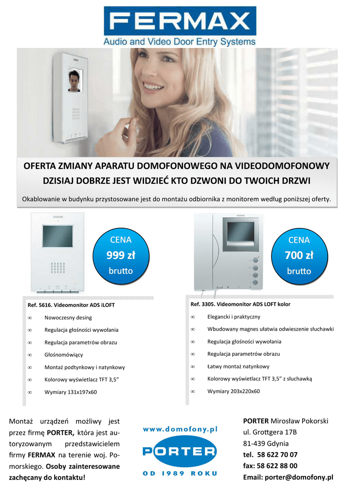 OFERTA ZMIANY APARATU DOMOFONOWEGO NA VIDEODOMOFONOWY DZISIAJ DOBRZE JEST WIDZIEĆ KTO DZWONI DO TWOICH DRZWI Okablowanie w budynku przystosowane jest do montażu odbiornika z monitorem według poniższej oferty. CENA CENA 999 zł 700 zł bru:o bru:o Ref. 5616. Videomonitor ADS iLOFT Ref. 3305. Videomonitor ADS LOFT kolor • Nowoczesny desing • Elegancki i praktyczny • Regulacja głośności wywołania • Wbudowany magnes ułatwia odwieszenie słuchawki • Regulacja parametrów obrazu • Regulacja głośności wywołania • Głośnomówiący • Regulacja parametrów obrazu • Montaż podtynkowy i natynkowy • Łatwy montaż natynkowy • Kolorowy wyświetlacz TFT 3,5” • Kolorowy wyświetlacz TFT 3,5” z słuchawką • Wymiary 131x197x60 • Wymiary 203x220x60 Montaż urządzeń możliwy jest przez firmę PORTER, która jest autoryzowanym przedstawicielem firmy FERMAX na terenie woj. Pomorskiego. Osoby zainteresowane zachęcany do kontaktu! PORTER Mirosław Pokorski ul. Gro:gera 17B 81-439 Gdynia tel. 58 622 70 07 fax: 58 622 88 00 Email: [email protected]