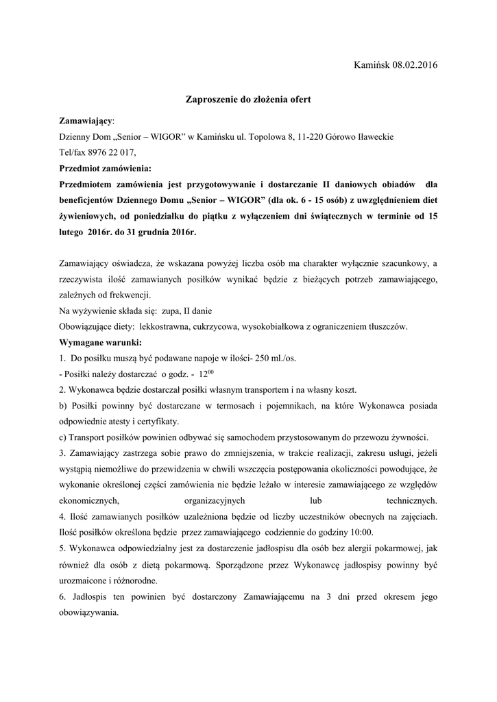 Kamińsk 08.02.2016 Zaproszenie do złożenia ofert